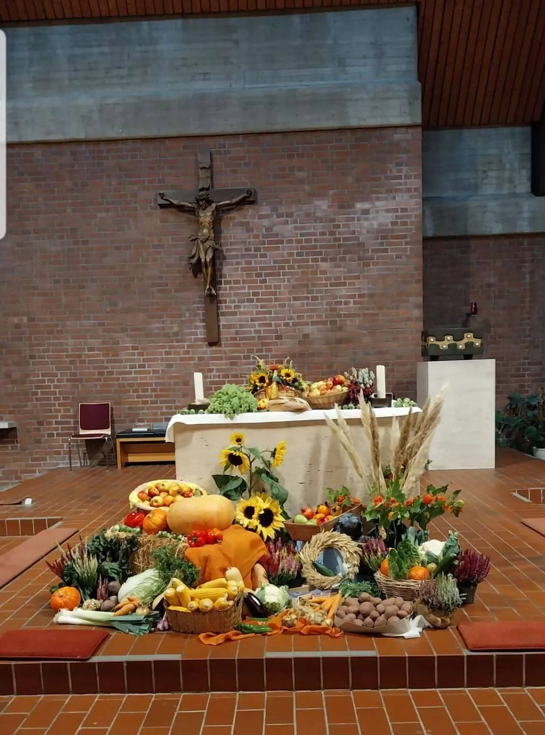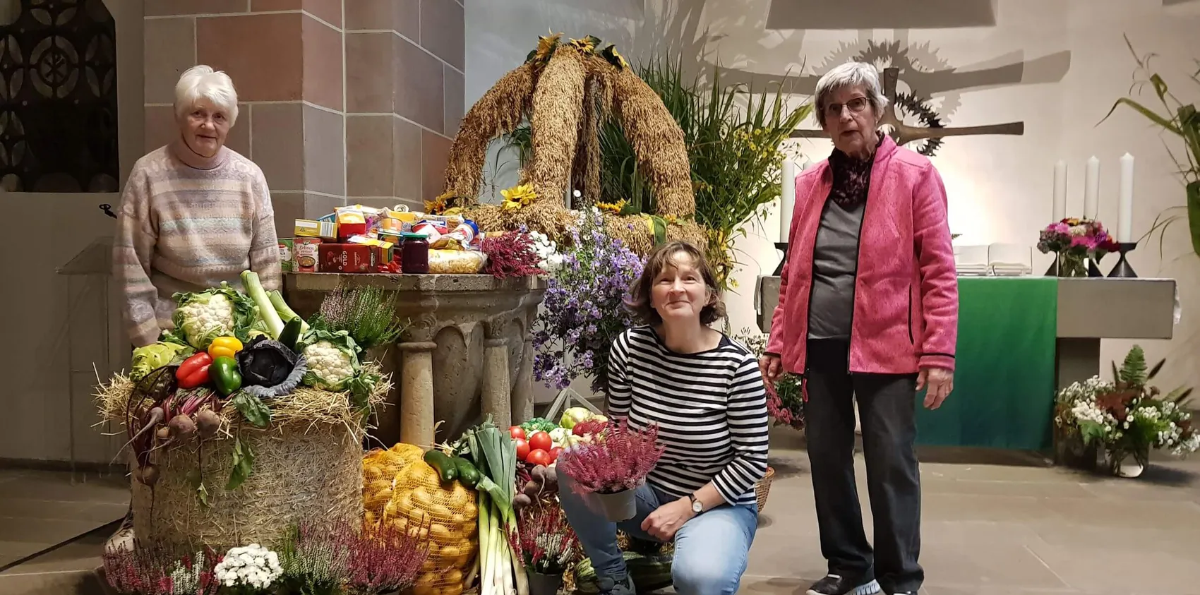 Statt schlichter Kerzen und Blumenschmuck ein Querschnitt durch Feld durch Garten im Altarraum. Die Kirchengemeinden feiern am ersten Sonntag im Oktober Erntedankfest.
