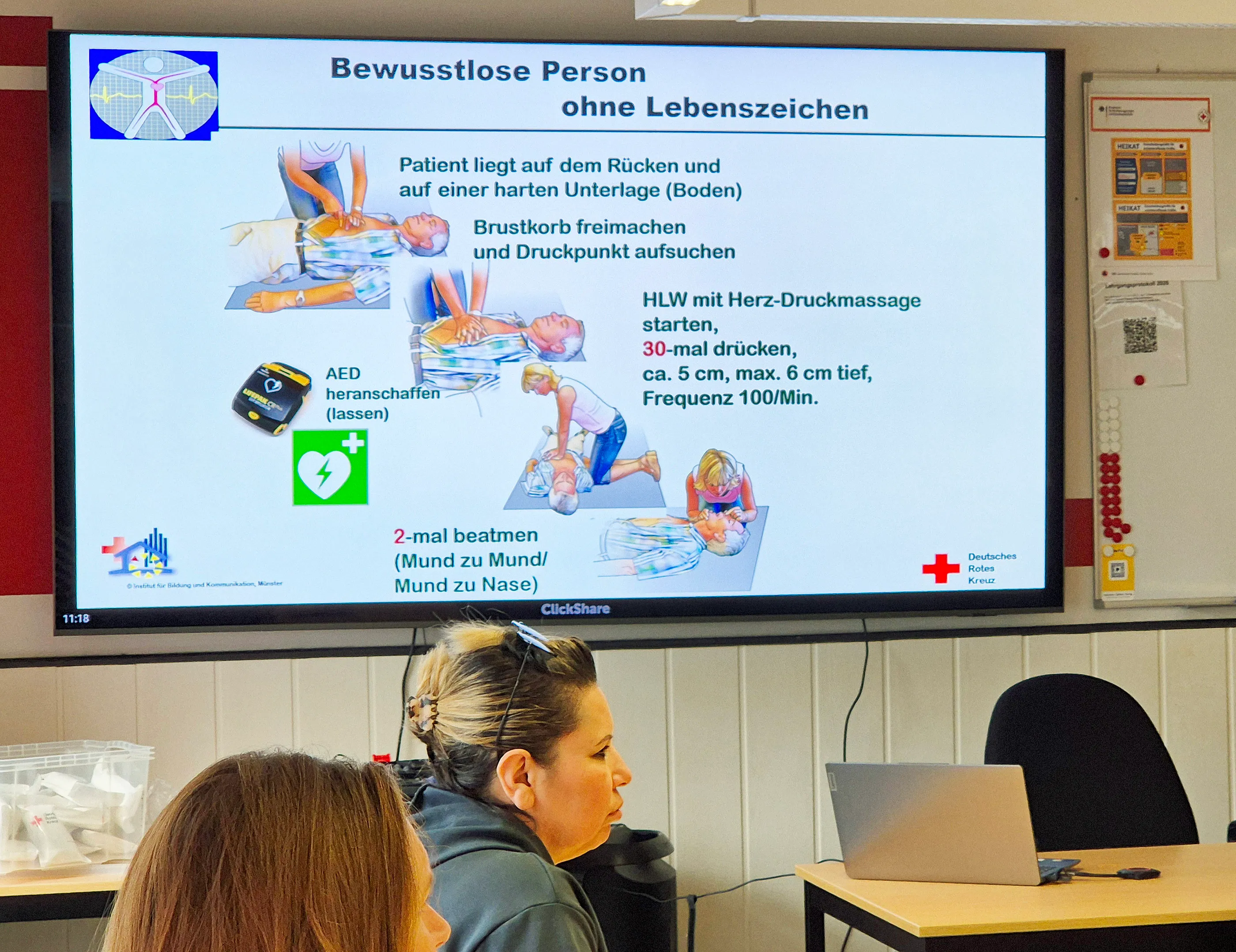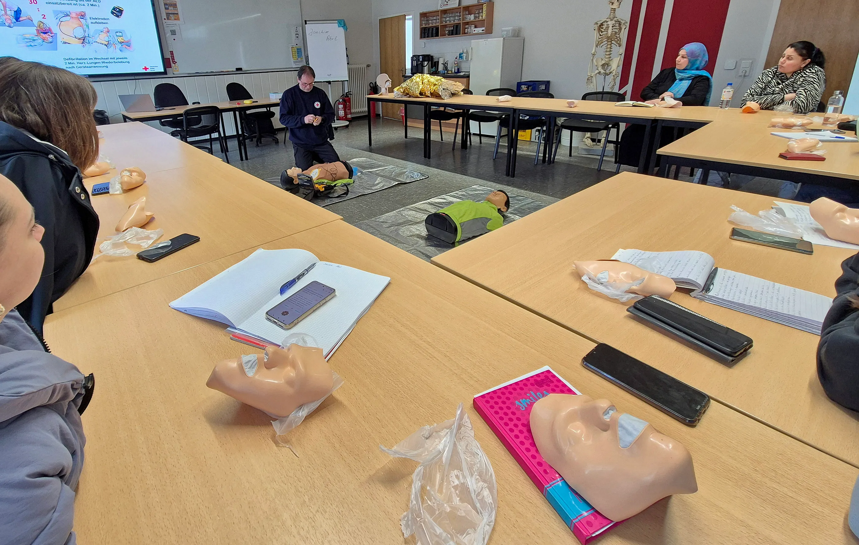 Übung an Dummies Einen Schwerpunkt legte er auf das Verhalten bei lebensbedrohlichen Situationen. Den theoretischen Einführungen folgte die praktische Übung an Dummies. Während sich Marwa und die Ukrainerin Vira auf den Boden legen und hilflose Personen mimen, üben die Pakistani Sonya und die türkisch-stämmige Zerah an ihnen die stabile Seitenlage. Später setzen alle aus der Gruppe ihre ganze Kraft ein, um mit Herzdruckmassage und dem Einsatz eines Defibrillators an zwei Dummies Wiederbelebungsmaßnahmen zu üben.