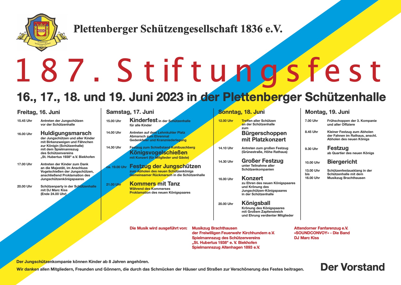 Blaugelbe Papierfähnchen, Wimpelketten und Bannerfahnen sind bei der Firma Mainz Sicherheitstechnik, Viktoriastraße 1, in Plettenberg erhältlich Der Vorstand der PSG bittet die Bevölkerung in der Innenstadt, durch Schmücken ihrer Häuser ihre Verbundenheit mit den Schützen zu zeigen.