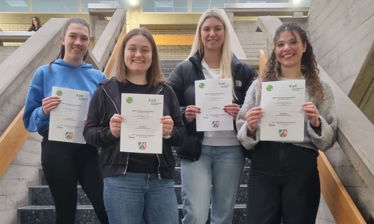 Freiwillig nahmen fünf angehende Industriekauffrauen vor den Osterferien an den Prüfungen für das KMK-Fremdsprachenzertifikat in Spanisch teil. Anna Gluitz und Laura Bocchicchio wählten die Niveaustufe B1, Alina Backhaus, Jana Herzig und Kyra Zauner absolvierten A2. Das Zertifikat auf der Niveaustufe B1 ersetzt an vielen Fachhochschulen die Spanischprüfung. Das KMK-Zertifikat auf der Niveaustufe B2 in Englisch hatten die sprachlich affinen Schülerinnen bereits vorher absolviert.