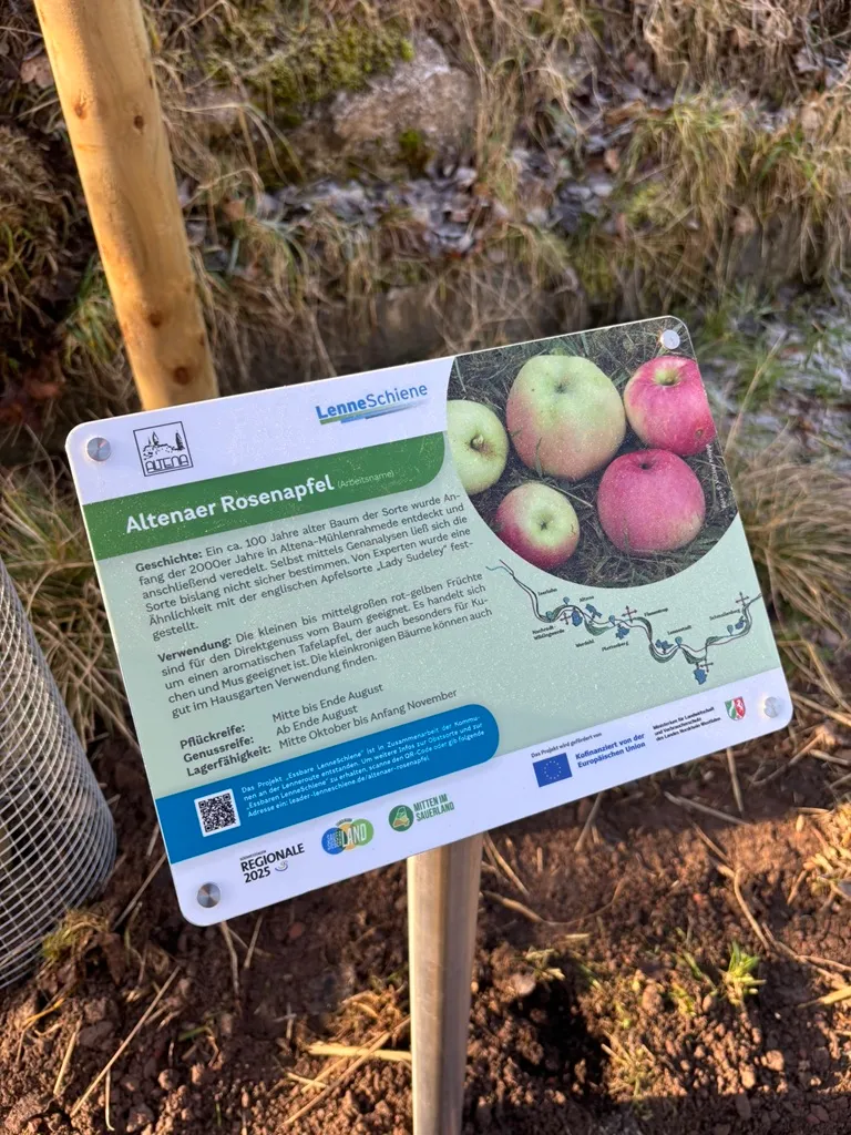 Die Baumsorten sind alteingesessen: Altenaer Rosenapfel, Röthaer Blenheim, Verwechsler Böhmischer Roter Jungfernapfel und Schöner vom Winkelsen wurden für die Essbare LenneSchiene ausgewählt. An allen Bäumen des Projekts werden Tafeln aufgestellt oder angebracht, die Informationen zu den jeweiligen Sorten enthalten. Über einen QR-Code gibt es noch mehr Informationen direkt auf dem eigenen Handy.