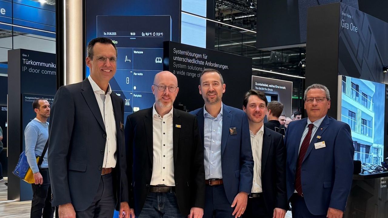 Besonders freute sich Gira über prominenten Besuch am Messestand. Im Austausch mit dem Innenminister des Landes Mecklenburg-Vorpommern, Christian Pegel, und Olaf von Müller, Vizepräsident des Zentralverbands der Deutschen Elektro- und Informationstechnischen Handwerke, sprachen Gira-Mitarbeiter über Digitalisierung und die Zukunft des Bauens. Torben Bayer, Leiter des Bereichs "Marke, Marketing und digitale Geschäftsmodelle", freut sich: Die Mitarbeiter "nehmen starken Rückenwind von der Messe mit."