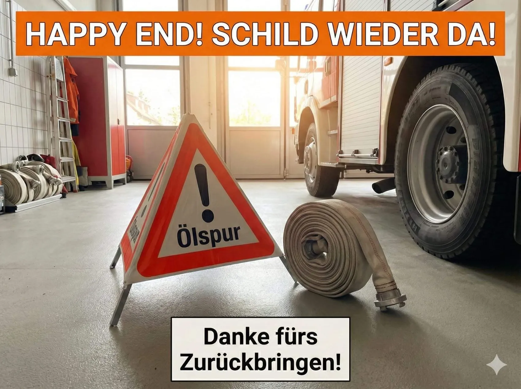 Das von der Freiwilligen Feuerwehr als vermisst gemeldete Ölwarnschild ist wieder aufgetaucht.