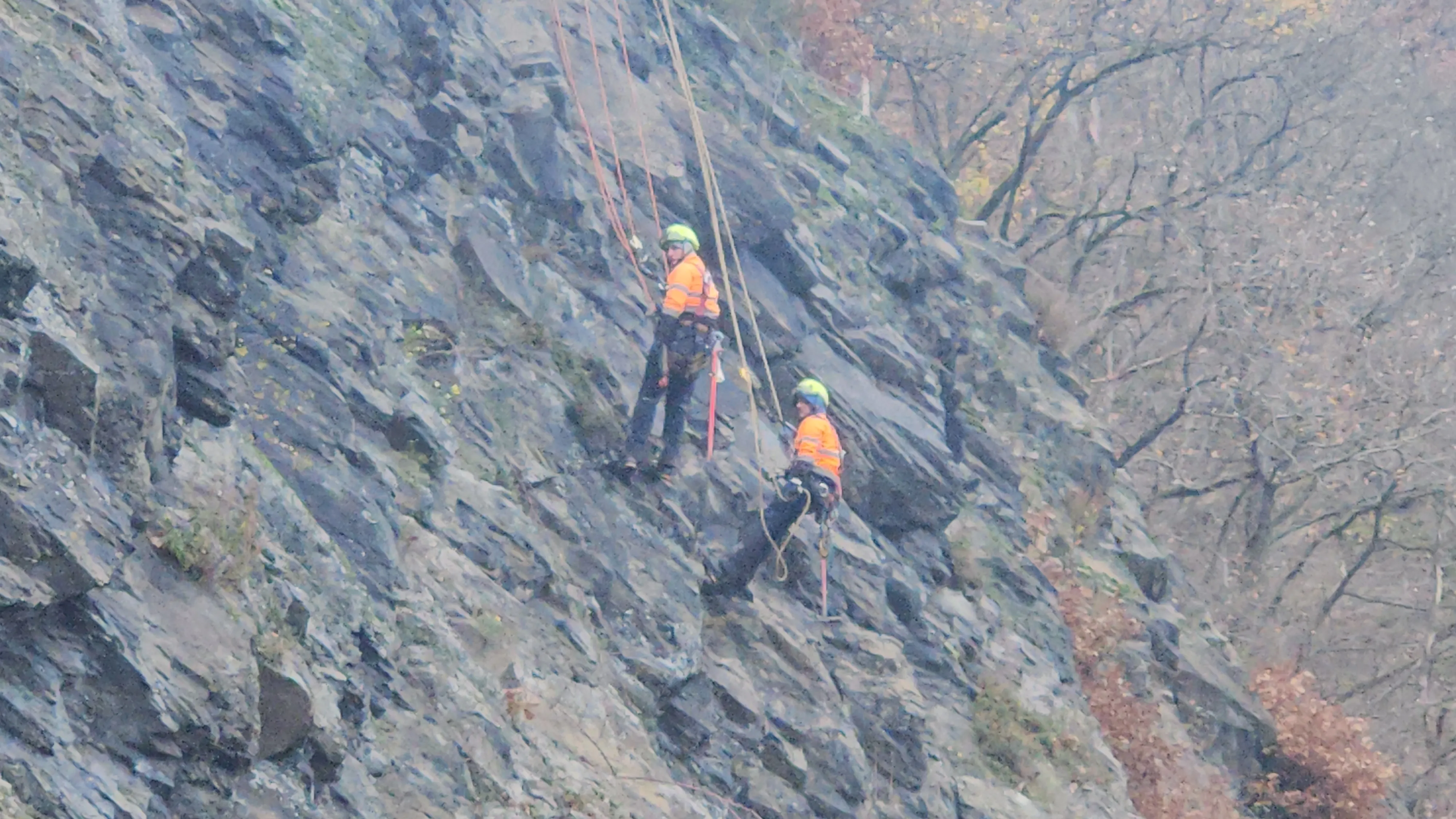 Gestern waren noch drei von ihnen gleichzeitig im Hang. Doch nun steht einer oben an der Felskante Wache. „Da führt ein Wanderweg entlang“, sagt der Vorarbeiter und verzieht das Gesicht. „Wir hatten es schon öfter, dass Menschen oben an unseren Seilen herumfummeln. Und das können wir von hier unten nicht sehen.“ Einmal – in einer anderen Stadt – sei sogar ein Seil durchgeschnitten worden. „Zum Glück waren damals alle Kletterer am Boden.“