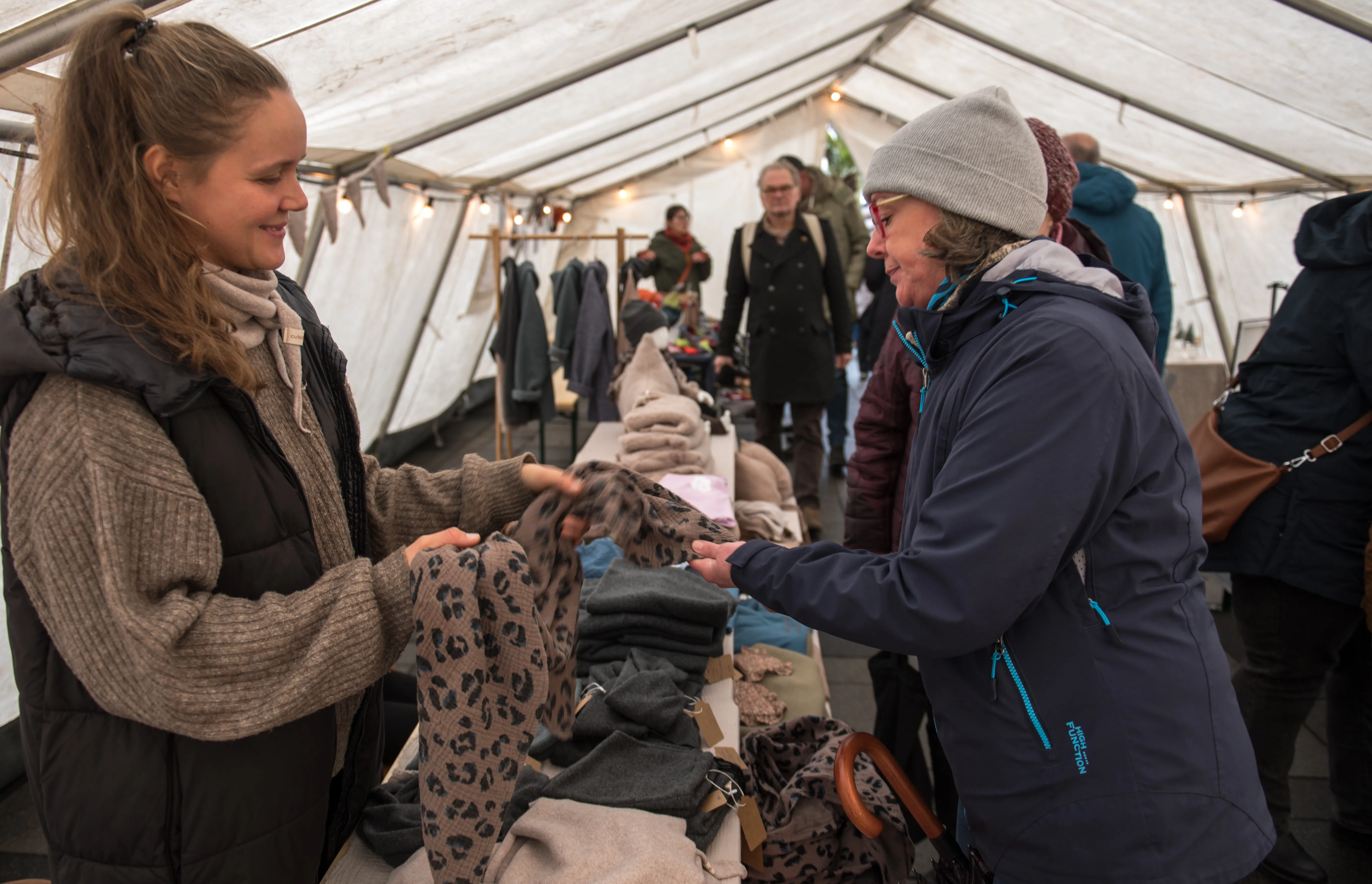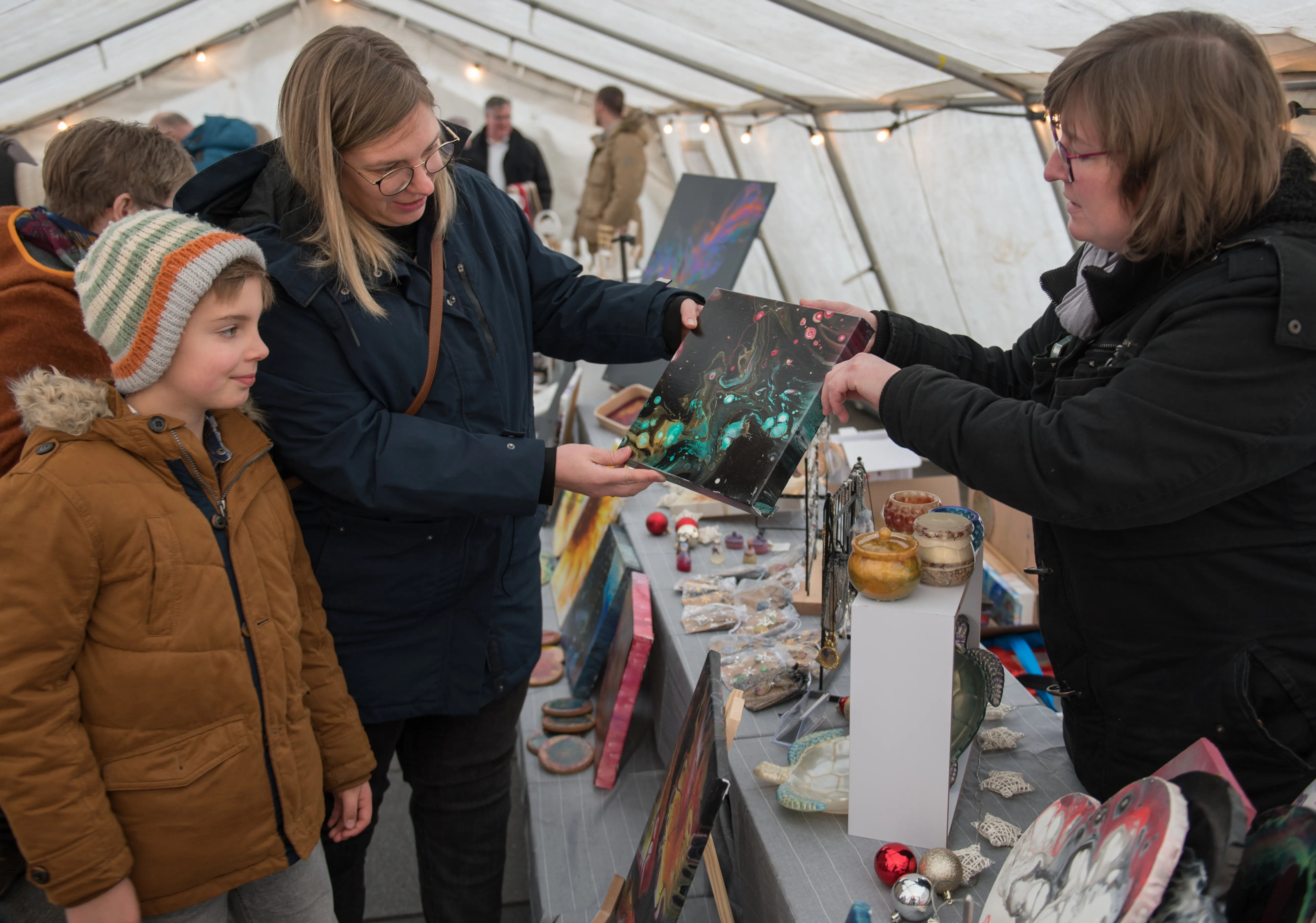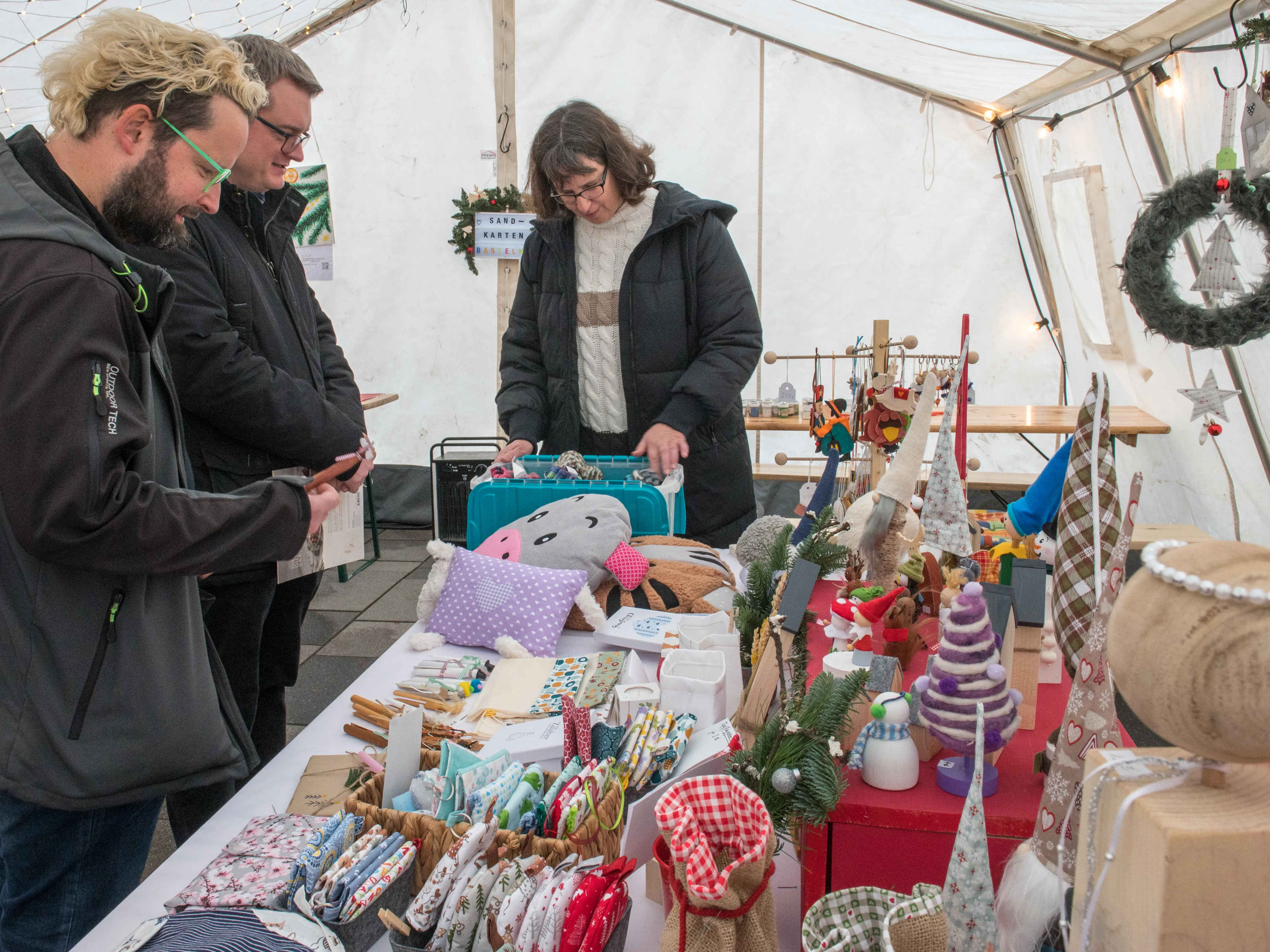 Als Ersatz für die umbaubedingt gesperrte Stadthalle hatte man neben der weihnachtlichen Hüttenstadt zwei große, beheizte Festzelte aufgebaut. Dort konnten die Besucher ungestört von Regen und Kälte im großen Kreativangebot stöbern und zwischen Geschenkideen, Kunstvollem für jeden Geschmack und Deko-Artikeln in unzähligen Variationen wählen.