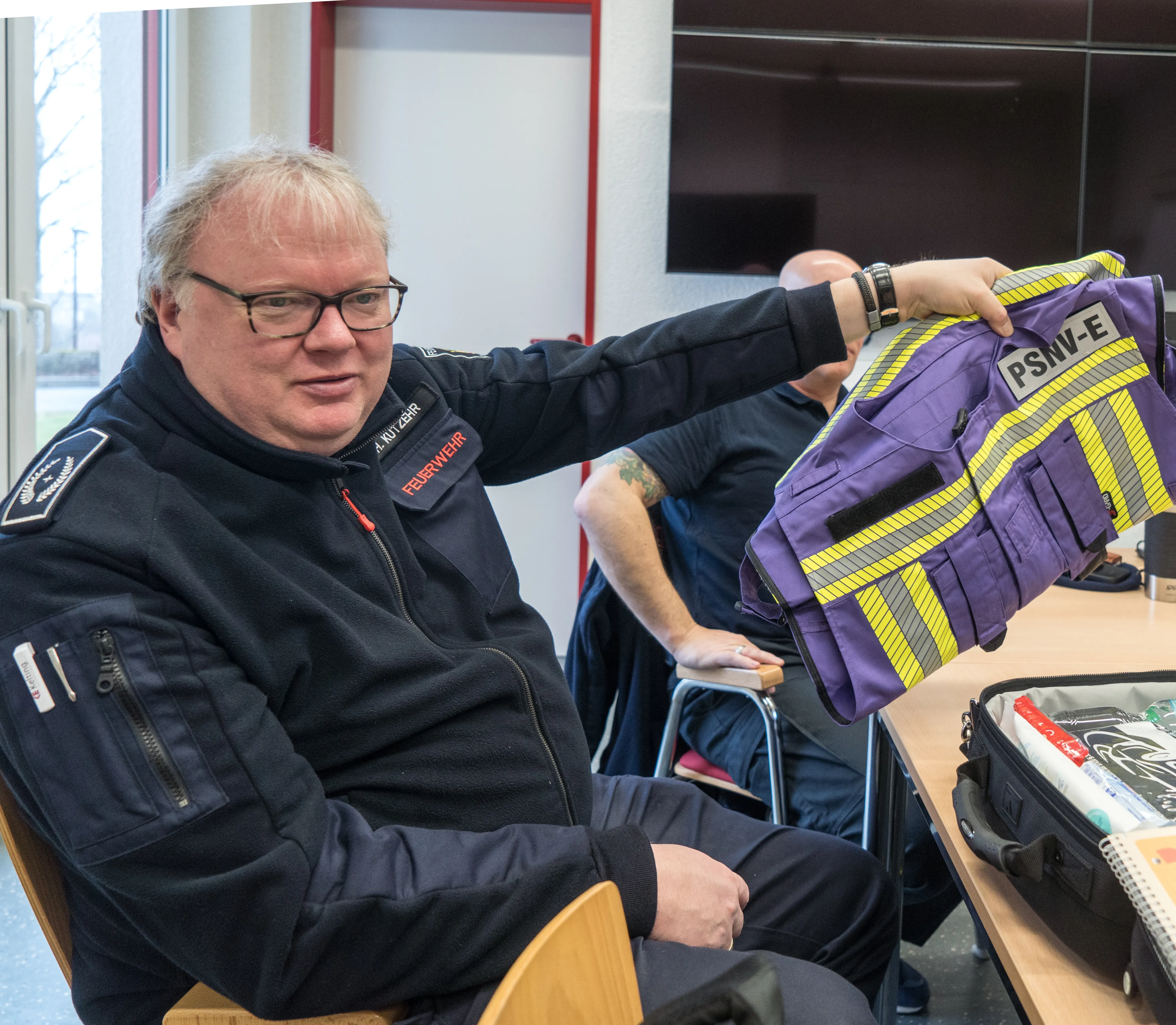 Ausgestattet sind die PSNV-E-Helfer mit violetten Warnwesten und einem Rucksack mit allerlei Dingen, die Einsatzkräften in einer belastenden Situation helfen können. Im Rucksack ist „alles was gut tut“, fasste es Isabelle Kastner zusammen. Angefordert werden die PSNV-E-Helfer bei Bedarf von der Einsatzleitung. Dabei ist die Hilfe nicht nur vor Ort erwünscht, sondern kann auch im Nachgang notwendig sein. Manchmal zeige sich erst Tage später, das die Einsatzkraft eben doch nicht so hartgesotten sei wie angenommen, sondern unter dem zuvor Erlebten leide, räumte Wehrleiter Holger Kutzehr ein.