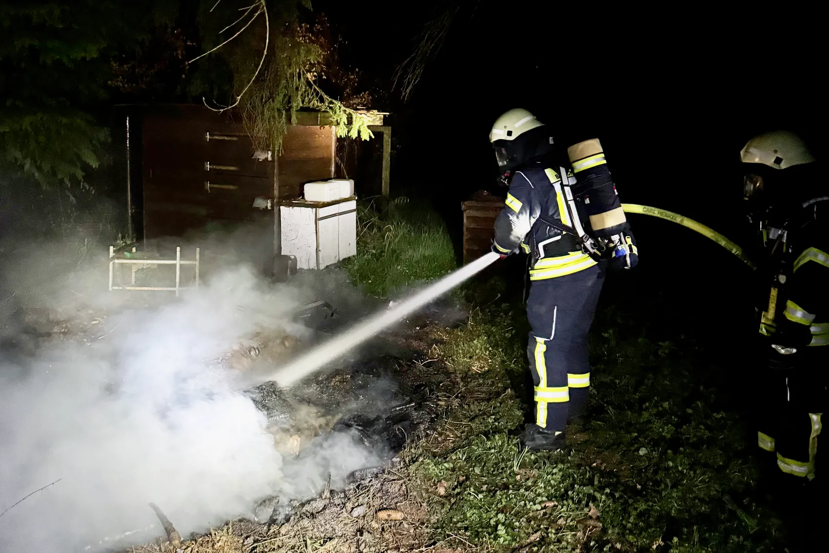 Die Einsatzkräfte des Löschzugs Breckerfeld und der Löschgruppe Delle griffen unter Atemschutz ein und löschten den Brand zügig. Durch das schnelle Vorgehen verhinderten sie ein Übergreifen der Flammen auf die Gartenhütten sowie auf den umliegenden Waldbestand.