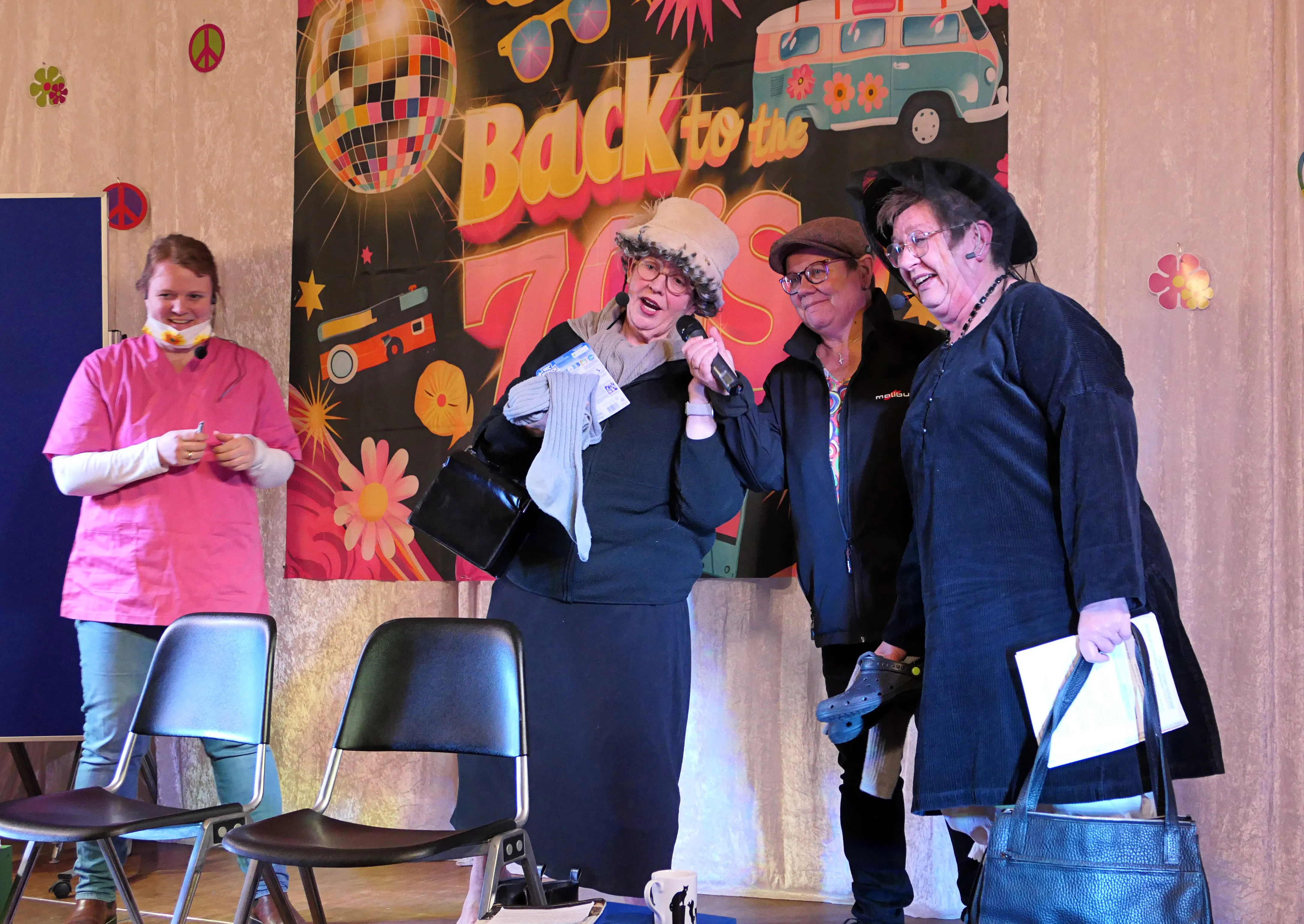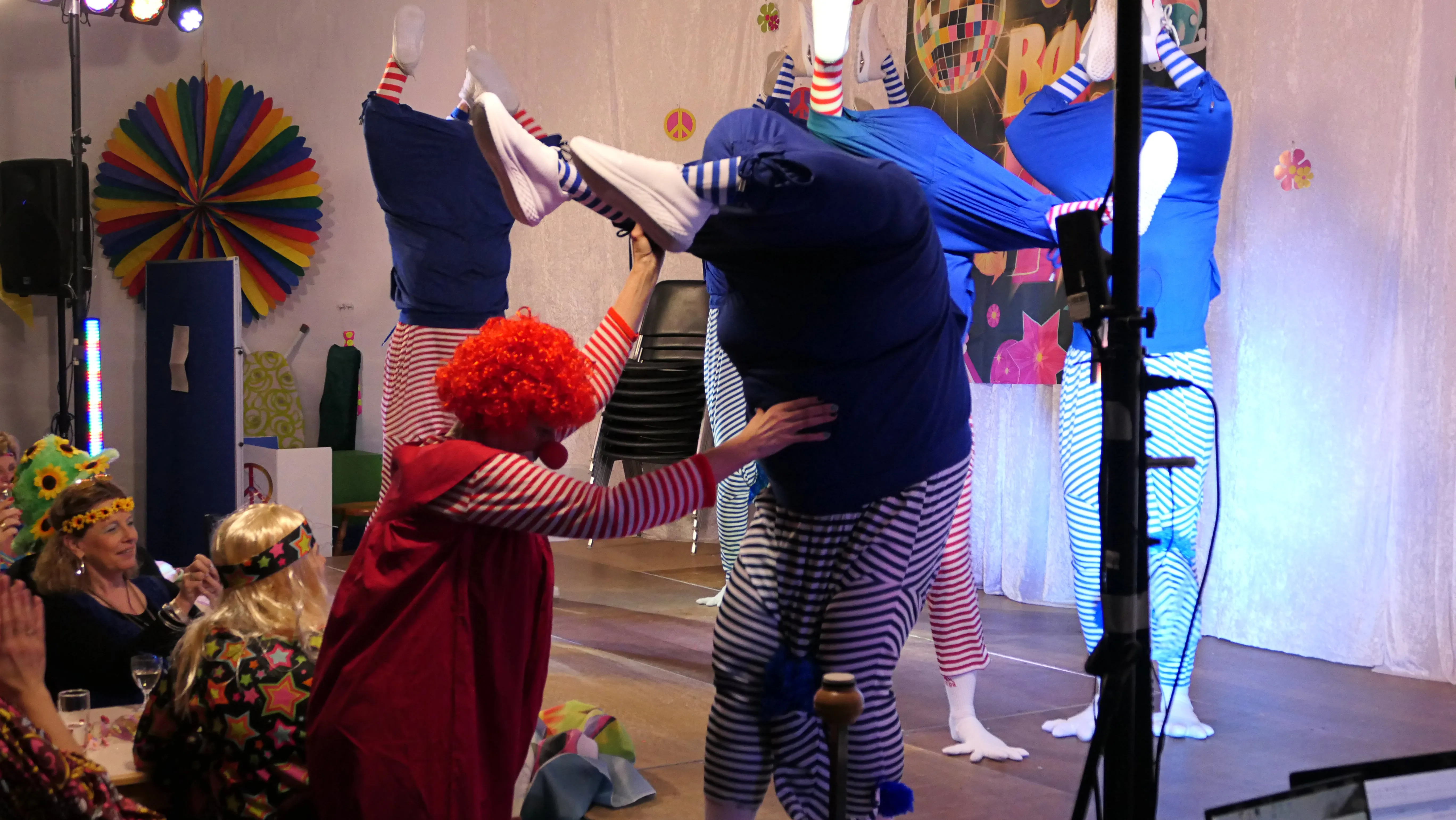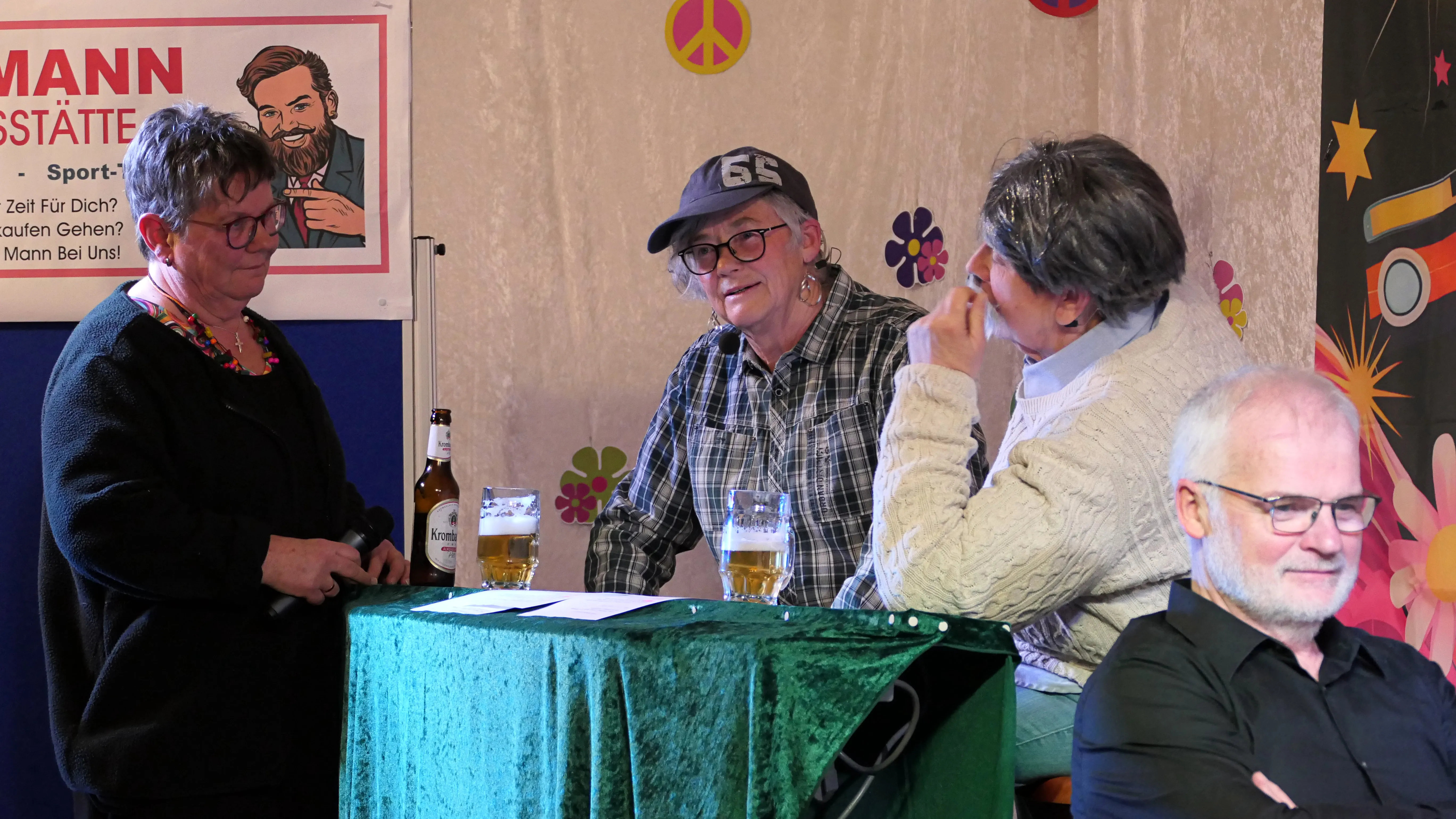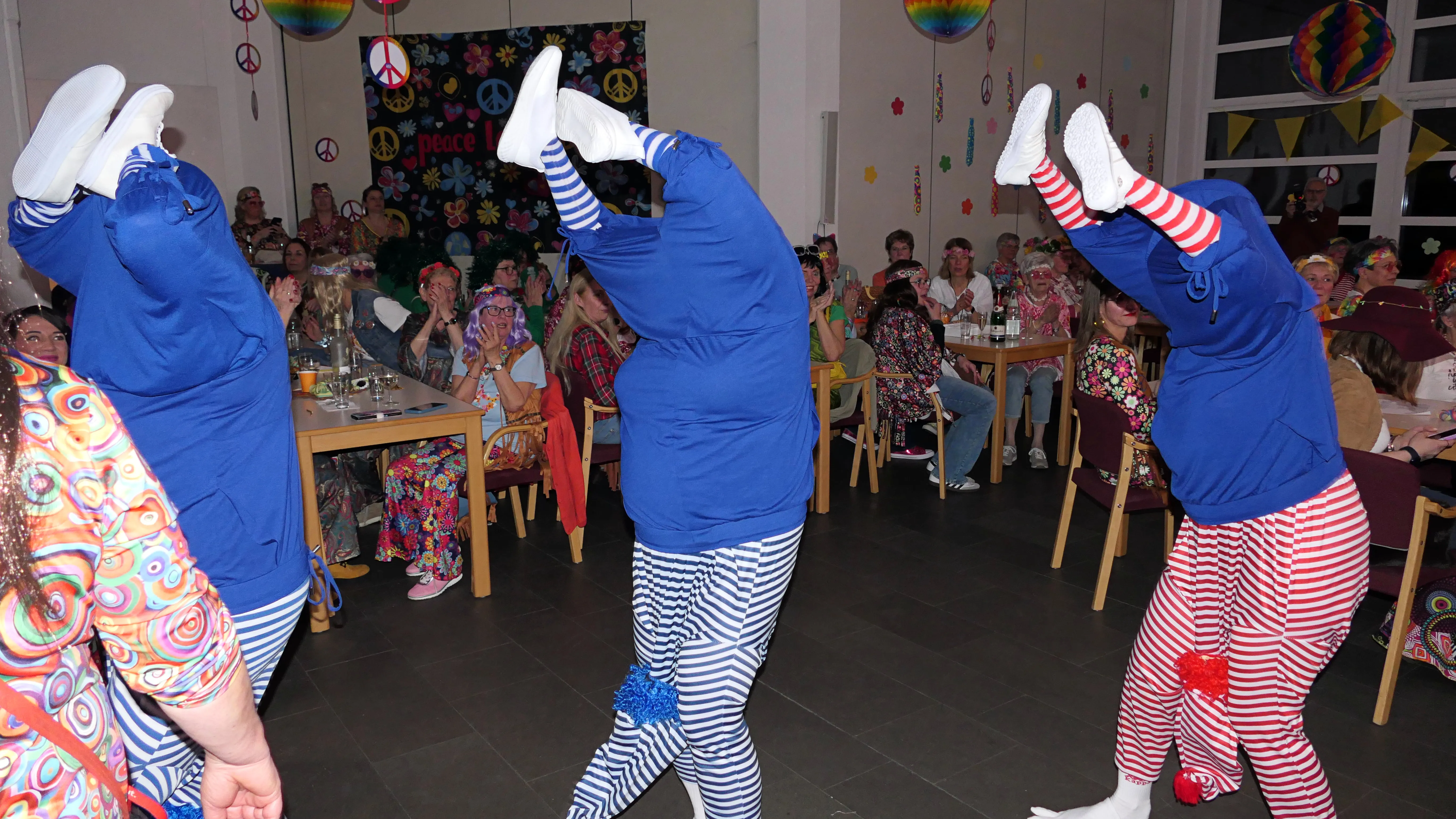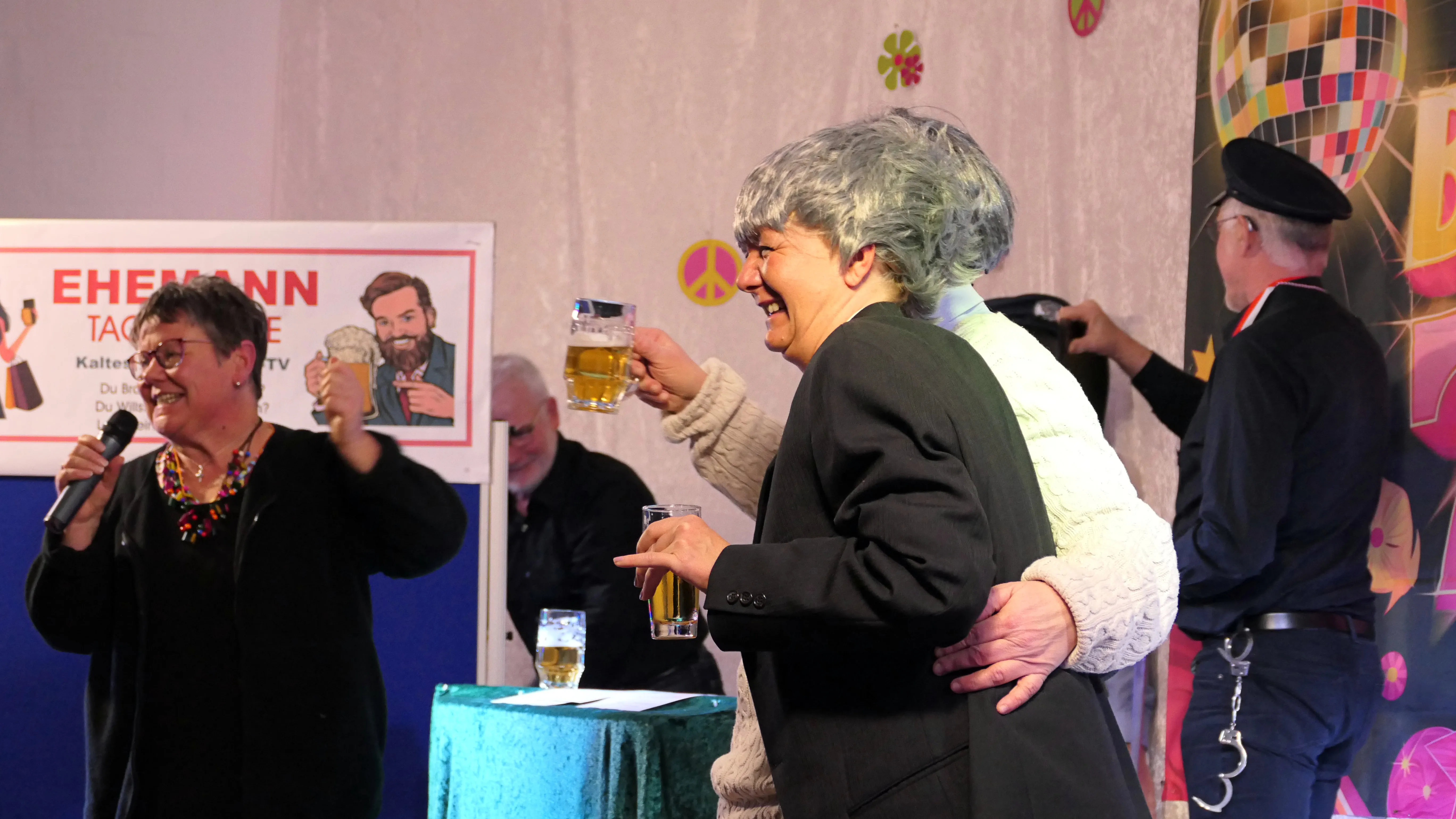 Das gelang mit den Programmpunkten „Die Pilze“ und der „Kneipe Freudenhaus“ ganz vorzüglich. Nach dem „Speeddating“ hatte der „Dä Blödschkopp“ alias Pew Baetzel die komplette, verdiente Aufmerksamkeit des Publikums. Ob die Geschichte von der Wünschelrute oder dem Erlebnis als Stripteasetänzer oder Einräumen der Spülmaschine - als Büttenredner aus Köln gab er alles. „Krankheiten beim Älterwerden“ und ein erster Auftritt der „Gemeindehüpfer Hübl“ beendeten den ersten Teil des Programms.
