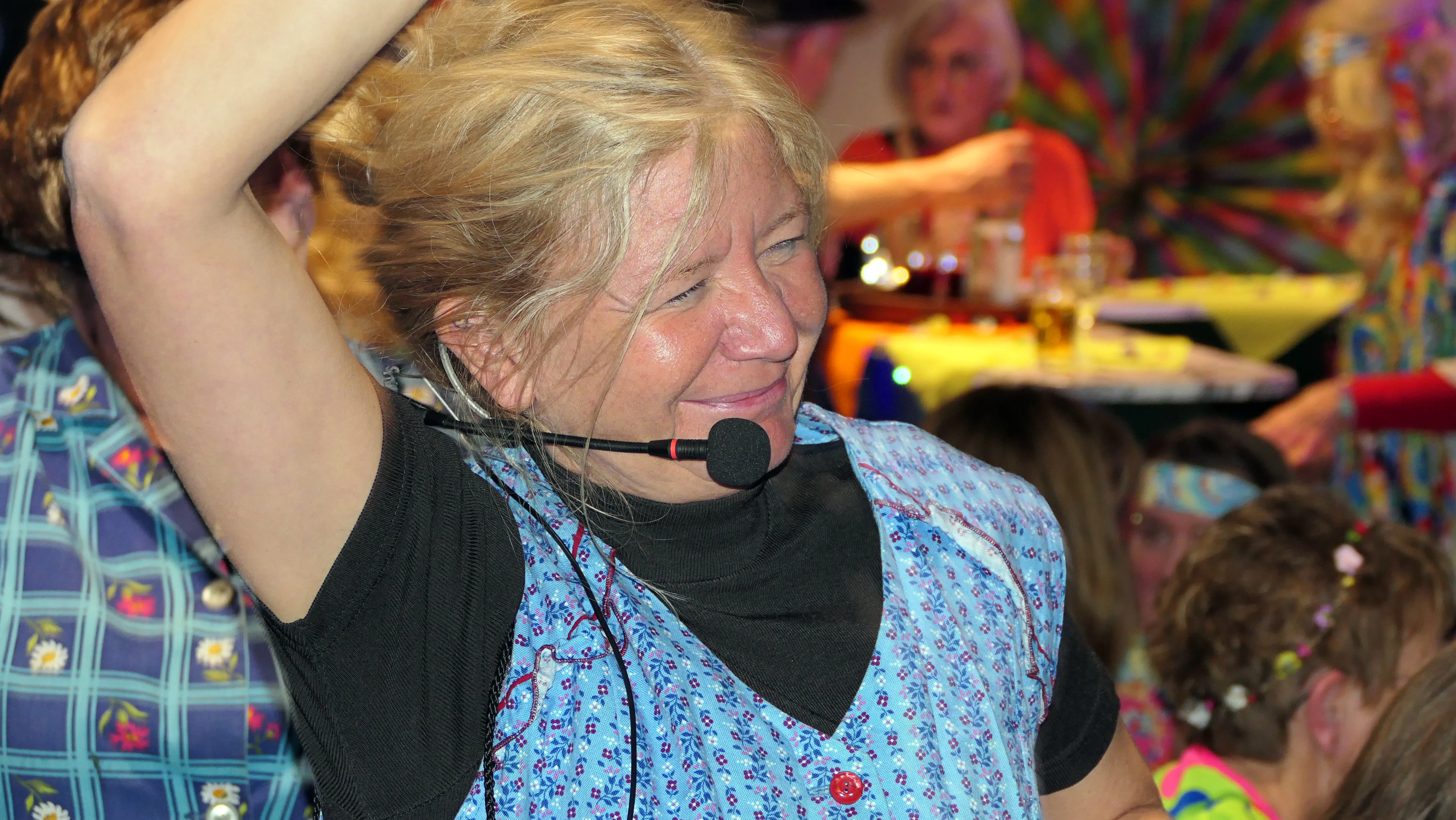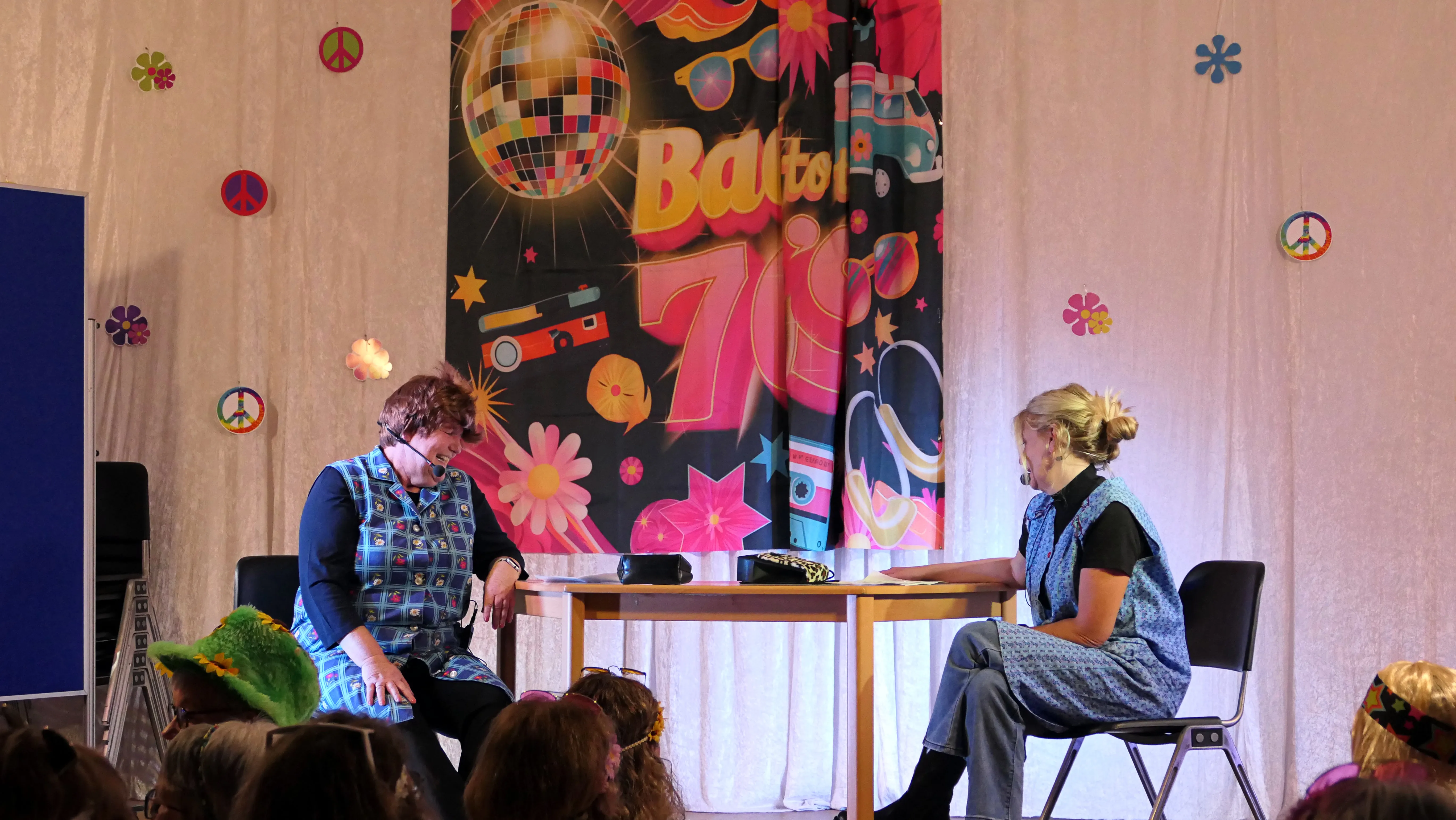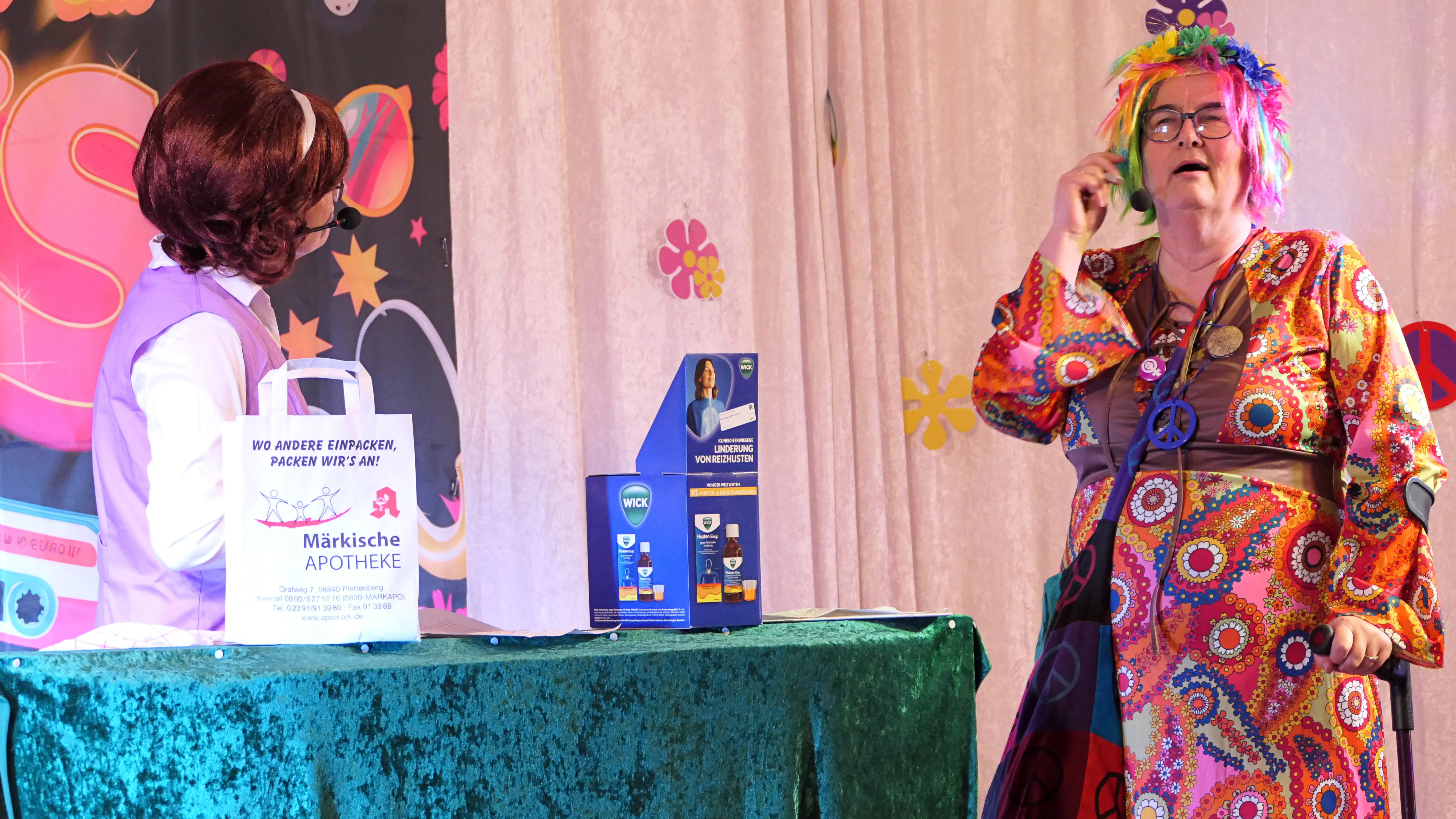 Erlebnisse im Flugzeug und ein sehr launiger Vortrag von Annemie und Gisela über einen Besuch bei der Fußpflege mit Keksen vom Fressnapf und der Erkenntnis, dass „ADHS nur das Kürzel für Andauernden Durst, Hunger und nur Scheiße im Kopf“ bedeute, beendeten diesen viel umjubelten Auftritt. Noch einmal zeigten die Gemeindehüpferinnen ihr Können auf der Bühne. Nach einer weiteren Pause sorgten ein Besuch bei der Rentenkasse und eine Störung der Nachtruhe sowie ein Apothekersketch um Tampons und Tempos für Lachsalven. Das Finale bestritten „Roland Kaiser“ und „Maite Kelly“, die den Saal zum Kochen brachten und nicht ohne Zugabe von der Bühne gelassen wurden.