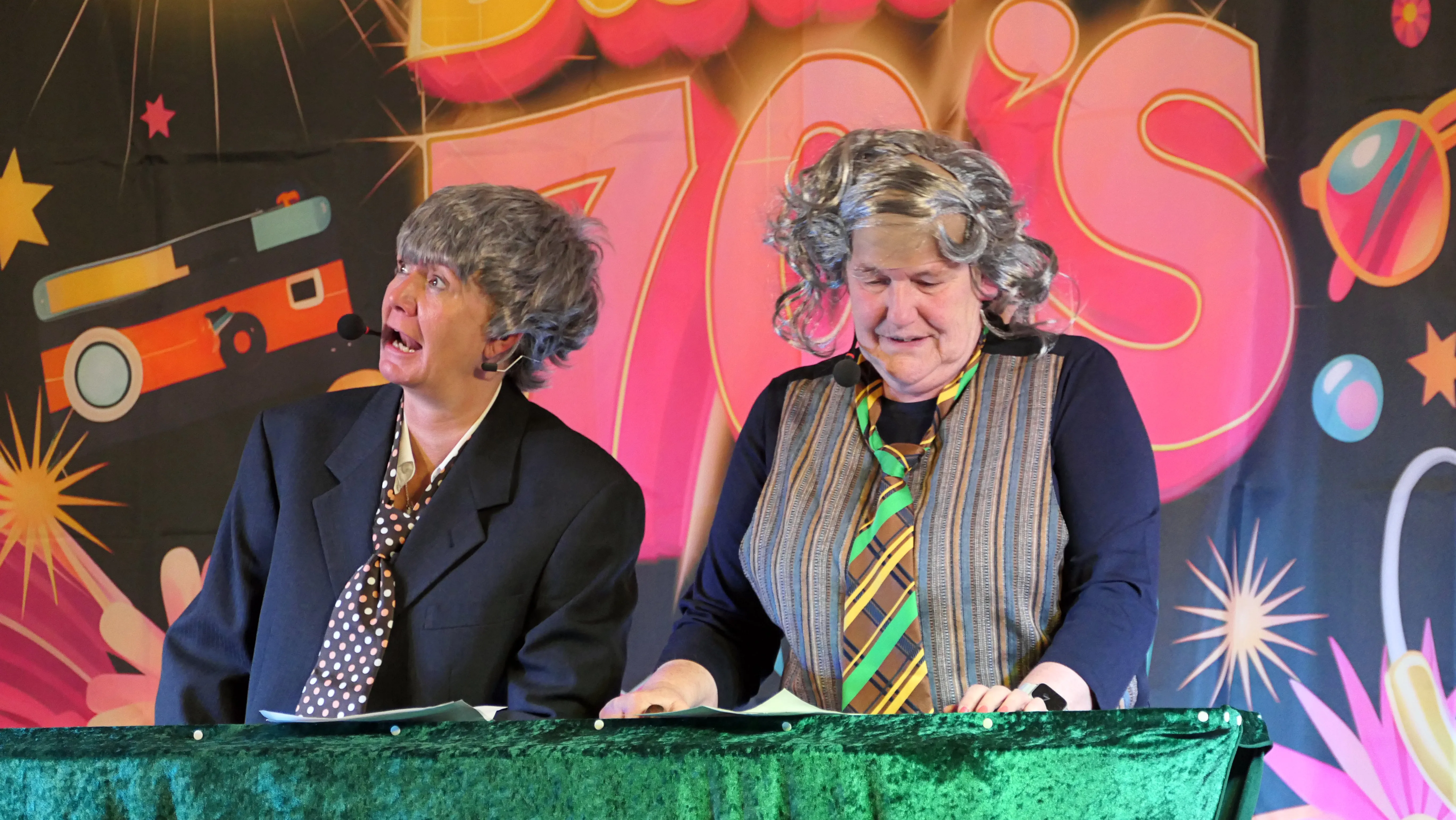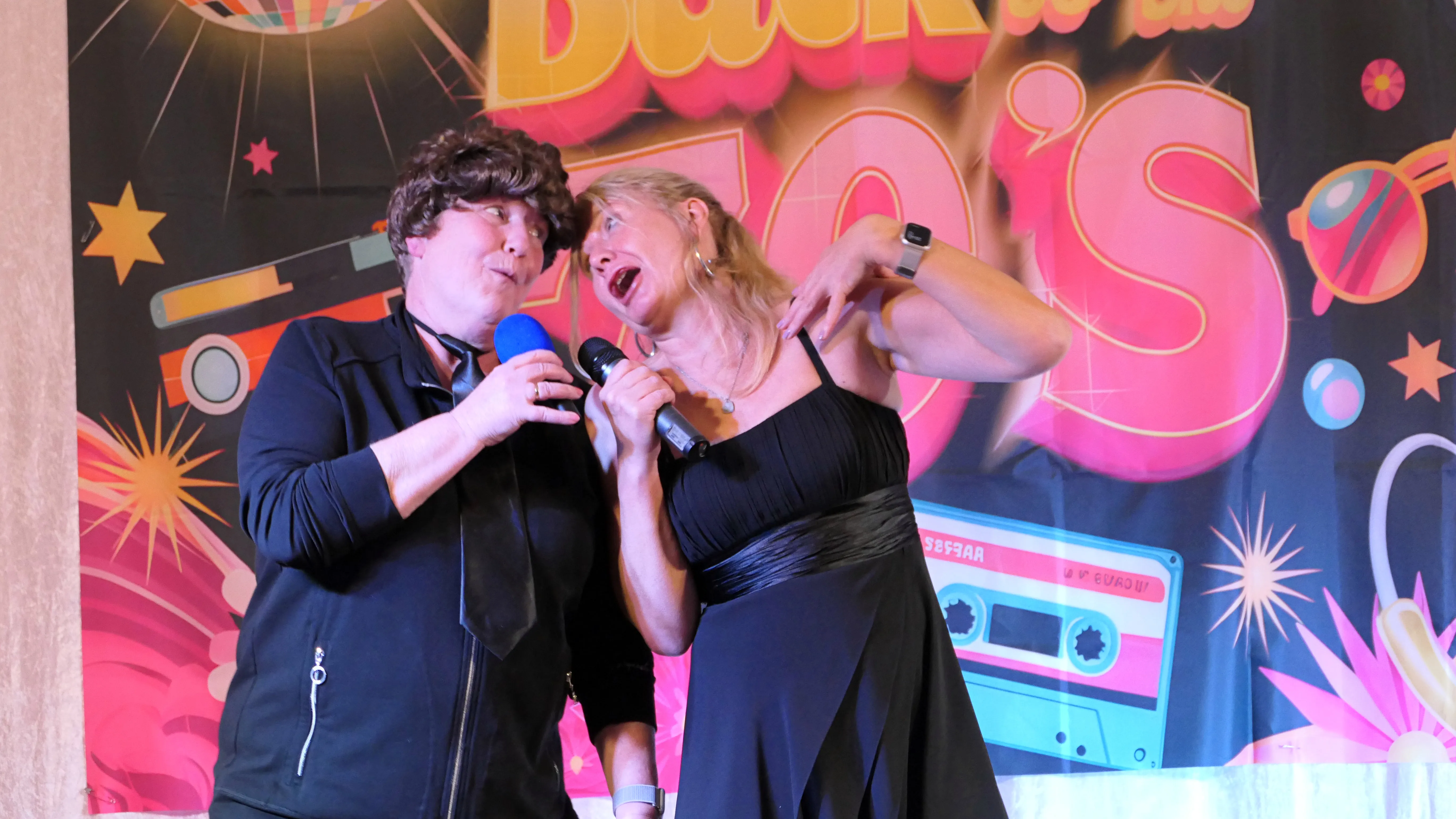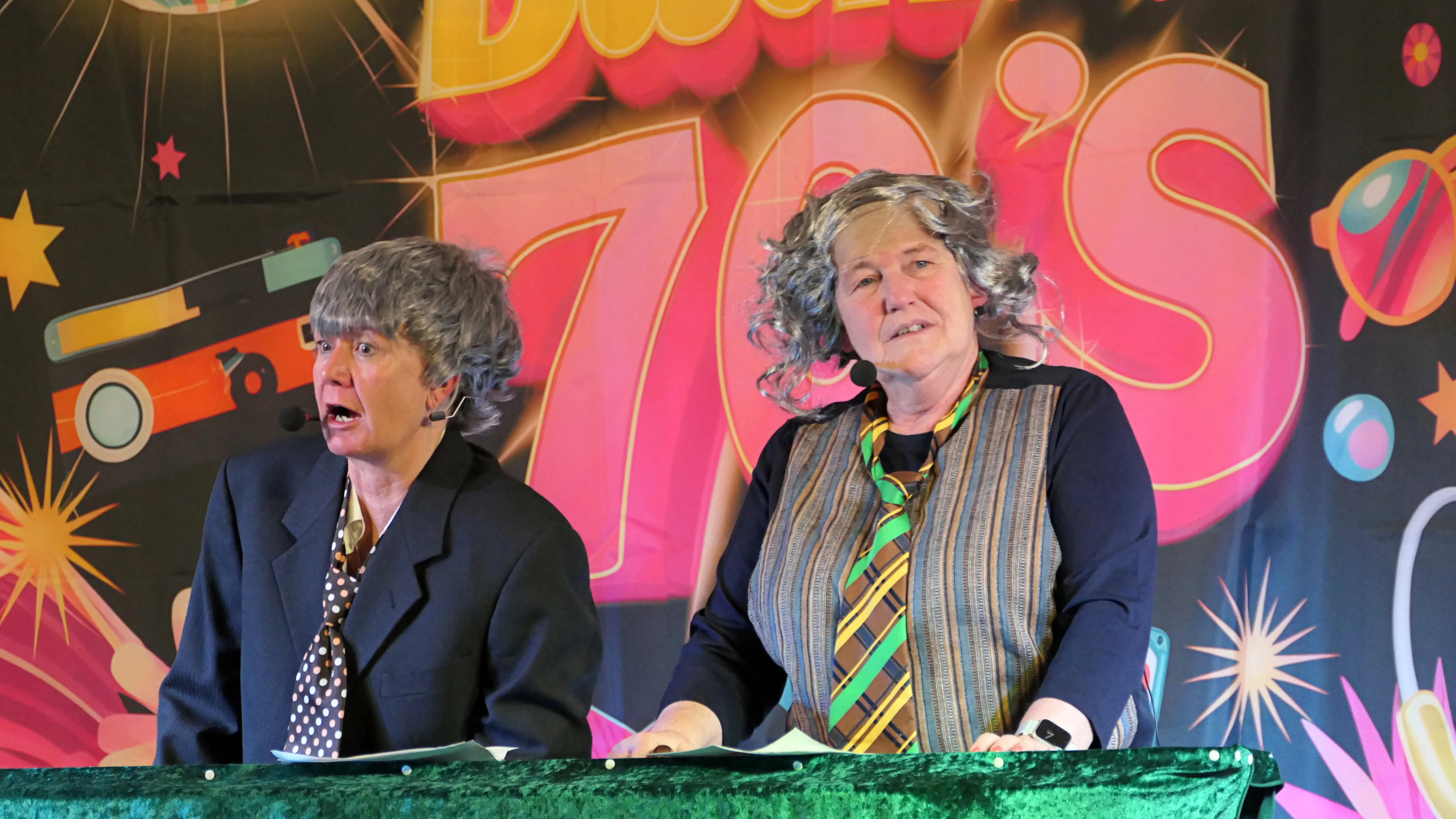 Erlebnisse im Flugzeug und ein sehr launiger Vortrag von Annemie und Gisela über einen Besuch bei der Fußpflege mit Keksen vom Fressnapf und der Erkenntnis, dass „ADHS nur das Kürzel für Andauernden Durst, Hunger und nur Scheiße im Kopf“ bedeute, beendeten diesen viel umjubelten Auftritt. Noch einmal zeigten die Gemeindehüpferinnen ihr Können auf der Bühne. Nach einer weiteren Pause sorgten ein Besuch bei der Rentenkasse und eine Störung der Nachtruhe sowie ein Apothekersketch um Tampons und Tempos für Lachsalven. Das Finale bestritten „Roland Kaiser“ und „Maite Kelly“, die den Saal zum Kochen brachten und nicht ohne Zugabe von der Bühne gelassen wurden.
