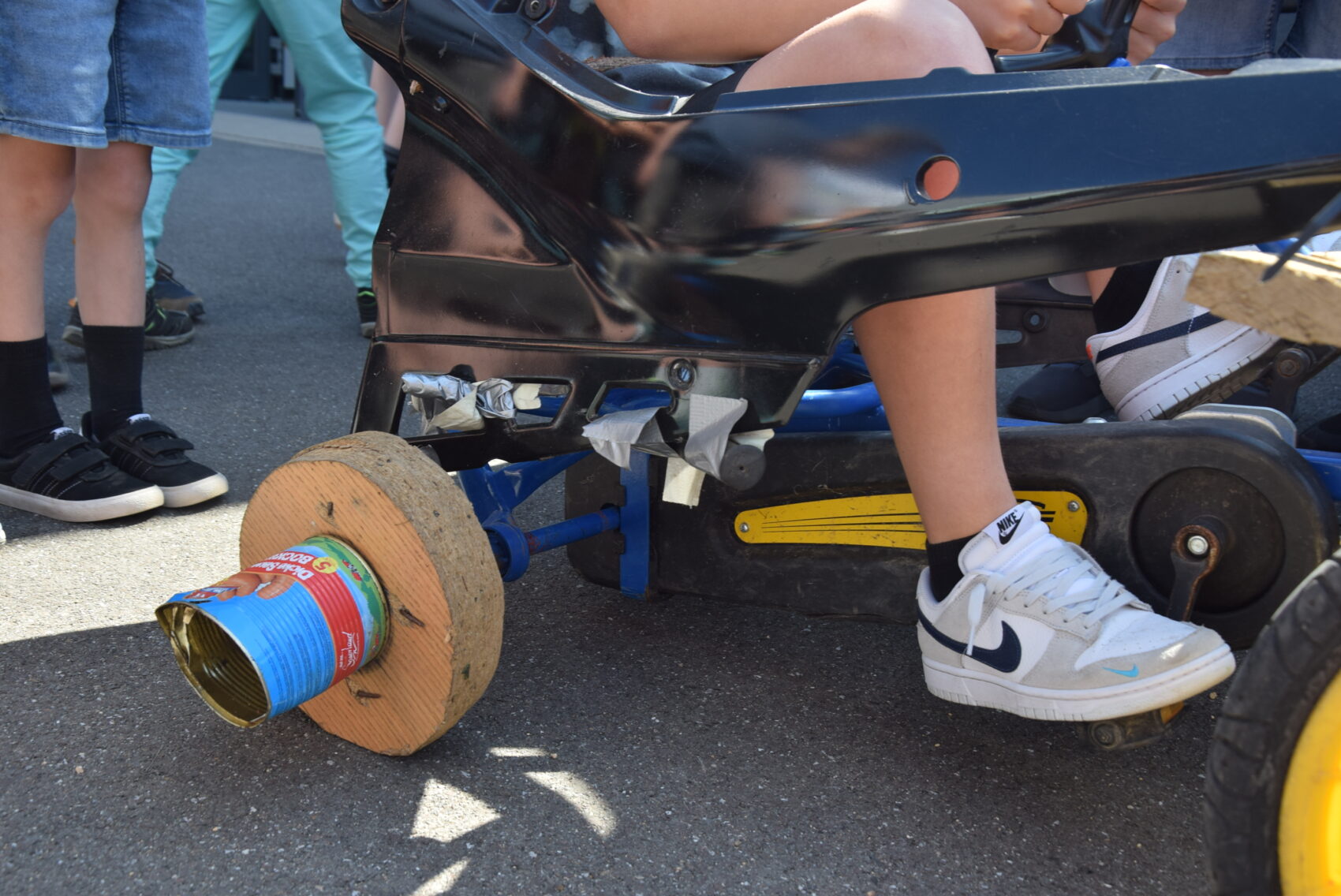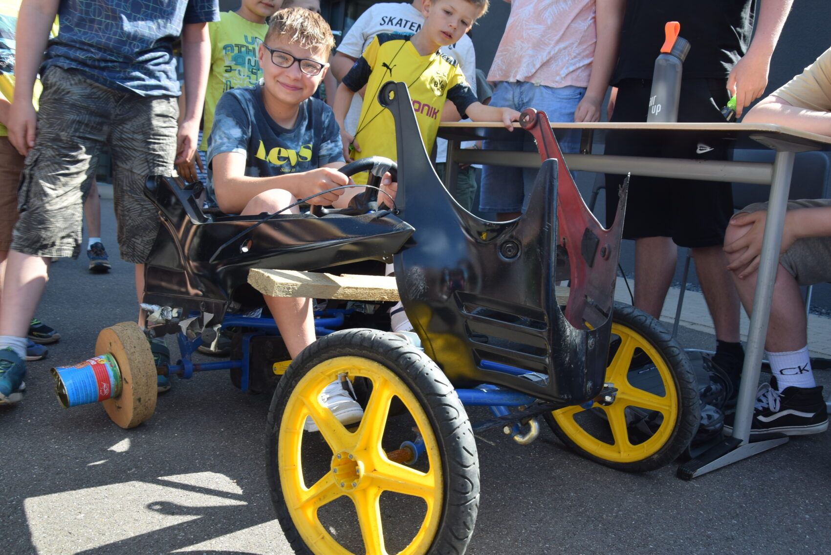 Mit großer Begeisterung wurde auch ein Rennwagen bewundert, der alles andere als gewöhnlich war. Denn alle Teile dieses Fahrzeugs wurden aus dem Sperrmüll entnommen und selbstständig von den Primusschülern zusammengebaut.