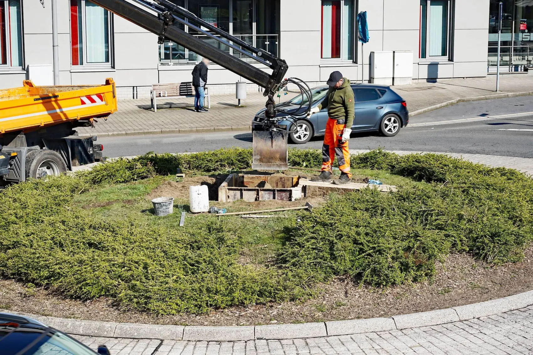 Passanten hatten in den vergangenen Tagen beobachten können, dass im Zentrum des Kreisverkehrs Erdarbeiten durchgeführt wurden. Hintergrund ist die Vorbereitung für den neuen Maibaum, der voraussichtlich zum 1. Mai aufgestellt werden soll.