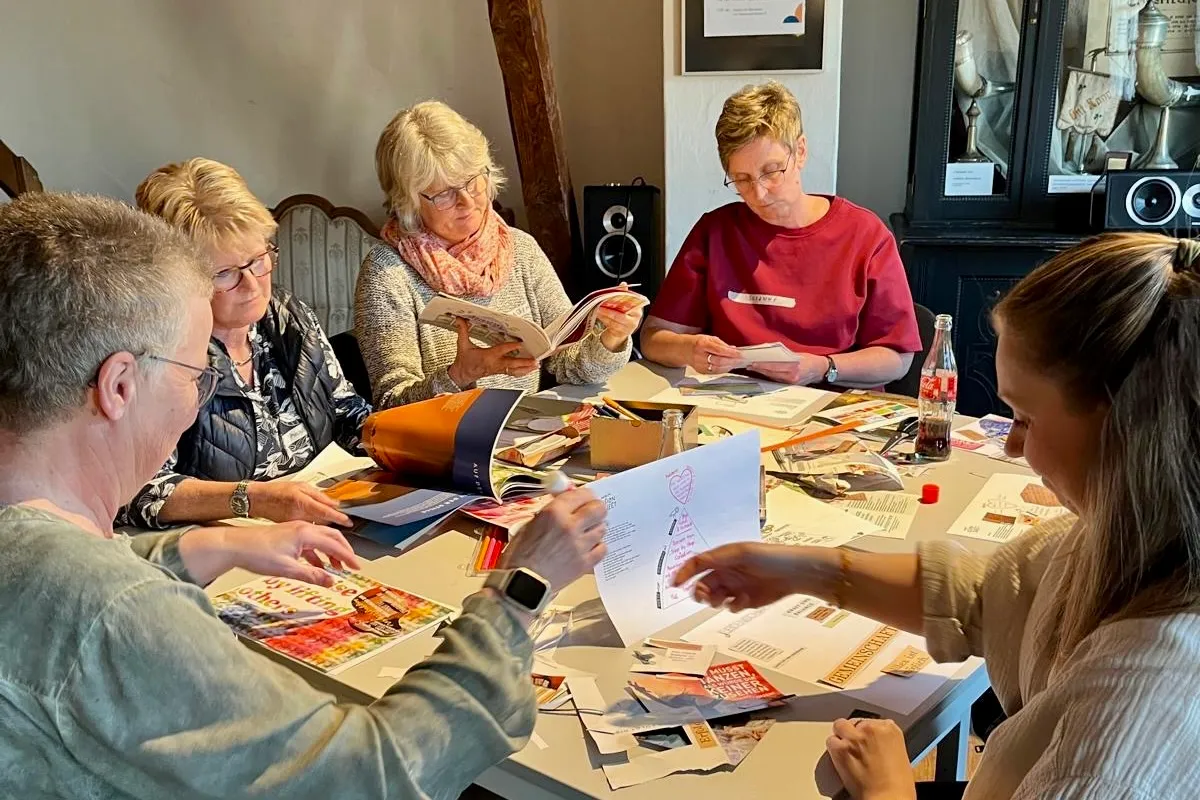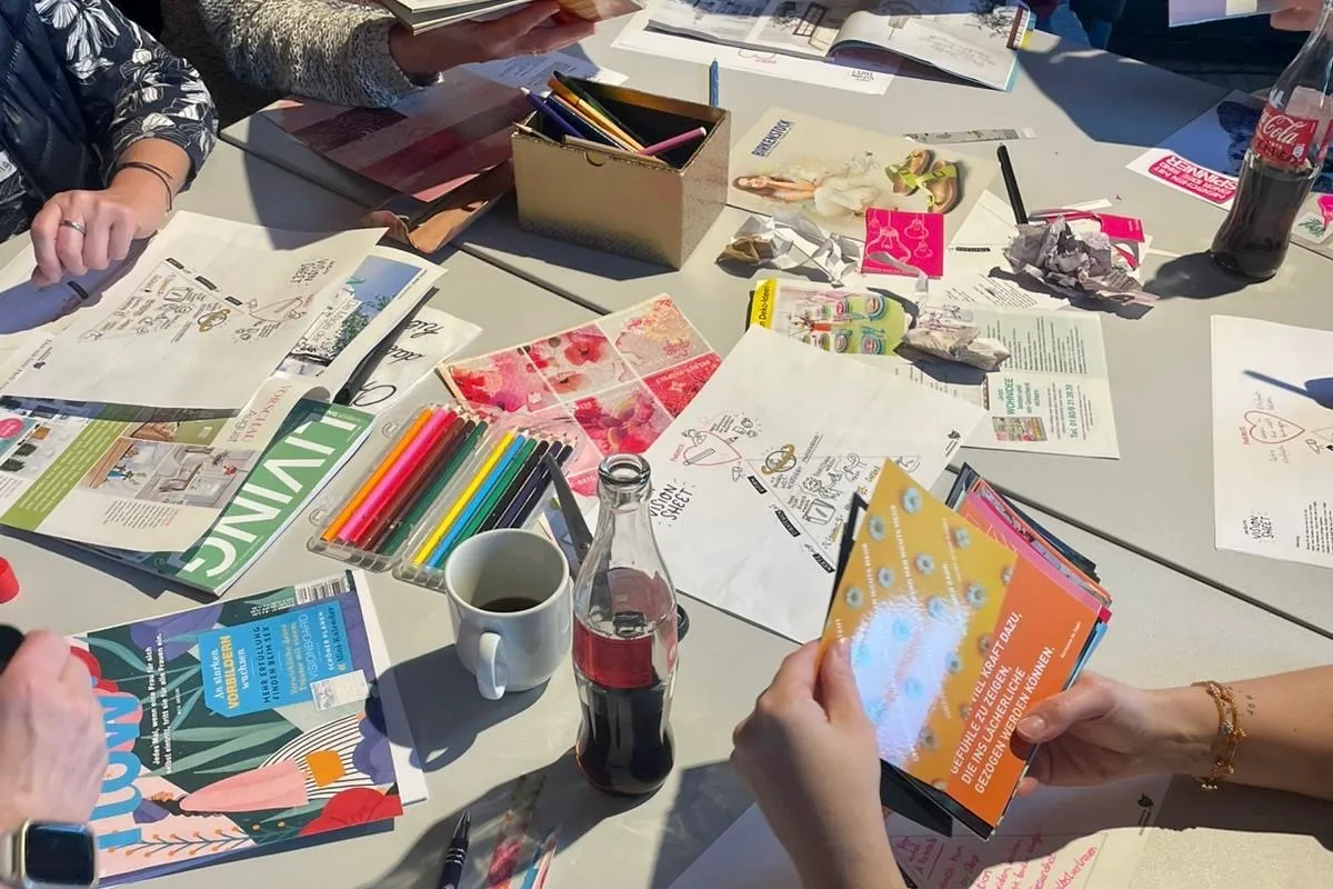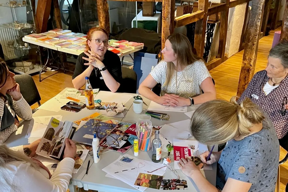 Nach der aktiven Einstimmung ging es kreativ weiter. Unter dem Programmpunkt „Vision“ gestalteten die Teilnehmerinnen Collagen aus Bildern, Worten und Symbolen, um die persönliche Ziele und Wünsche sichtbar machen.