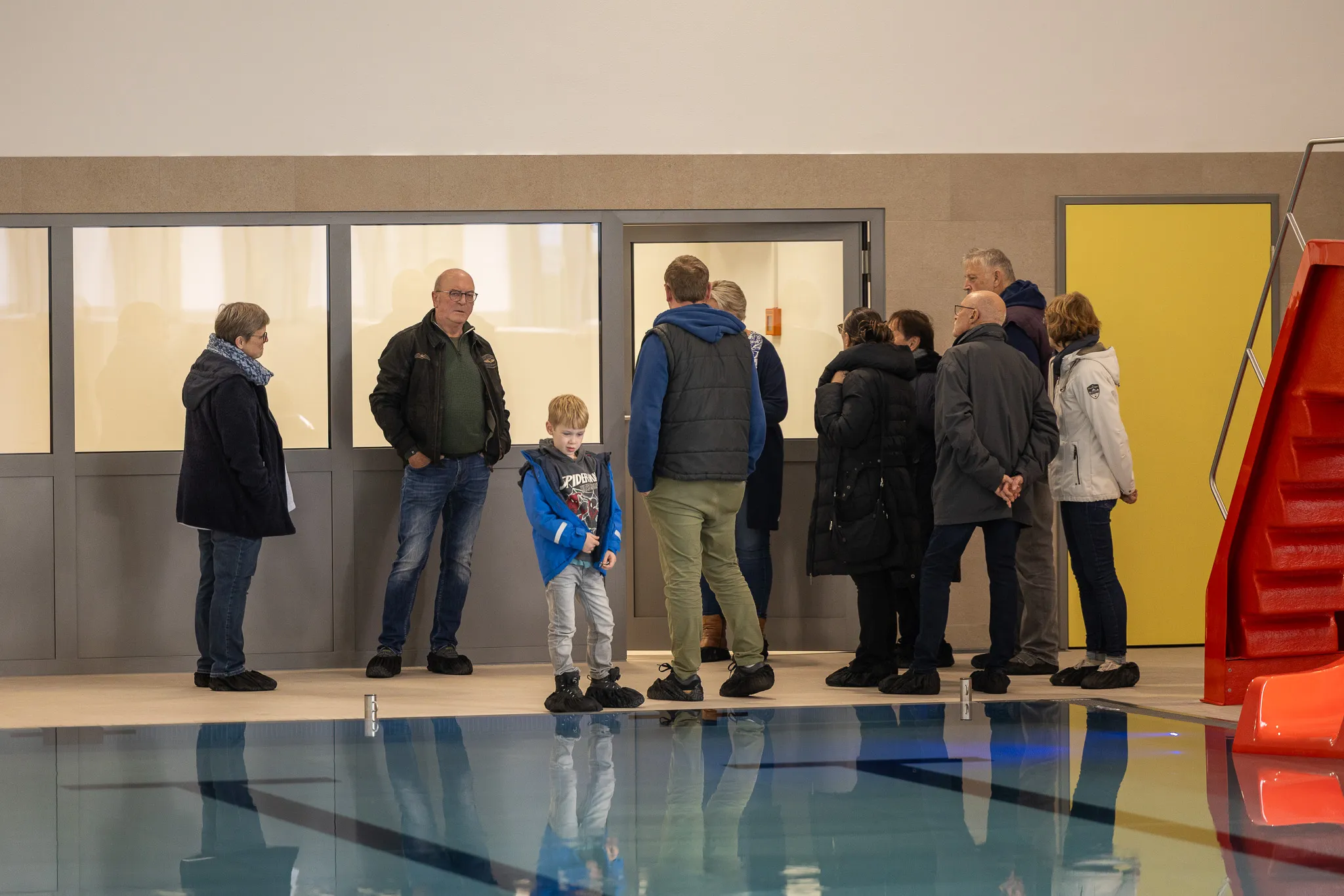 "Rehakurse an Land sind einfach nicht das Gleiche", sagt eine Besucherin. Vor der Tür haben sich einige Frauen versammelt, die sonst gemeinsam einen Kurs belegten. Sie dürfen als erstes ins Bad. Die erste Aufgabe: "Bitte nutzen Sie die Schuhüberzieher. Sonst können wir nicht in den Barfußbereich." Wer die schwarzen Schutzschuhe nicht alleine überziehen kann, der bekommt Hilfe - unter anderem auch von Kämmerer Heiko Tegeler oder auch von Bürgermeisterin Birgit Tupat. Dann geht es los.