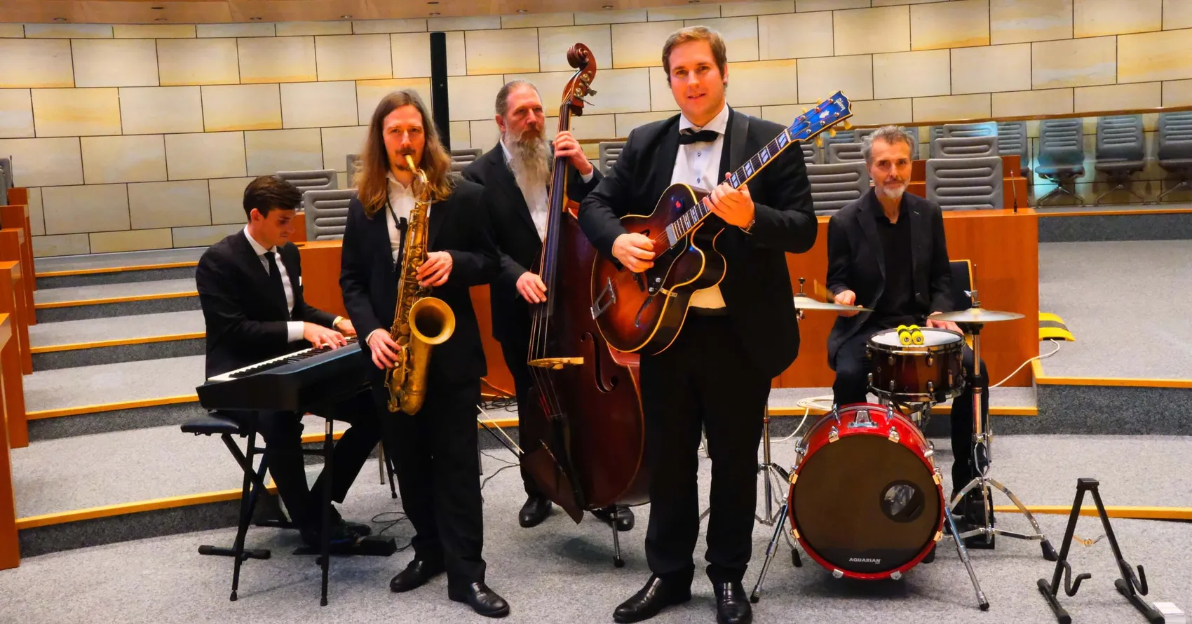Zum Kranich Kollektiv gehören neben Alexander Kranich (Gitarre) Max Jalaly aus Lüdenscheid (Kontrabass), Florian Boos (Saxofon), Axel Reichard (Klavier) und Andy Smyrek (Schlagzeug).