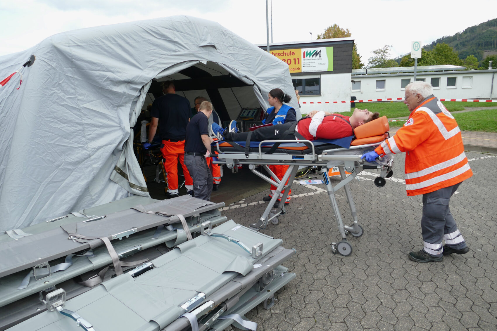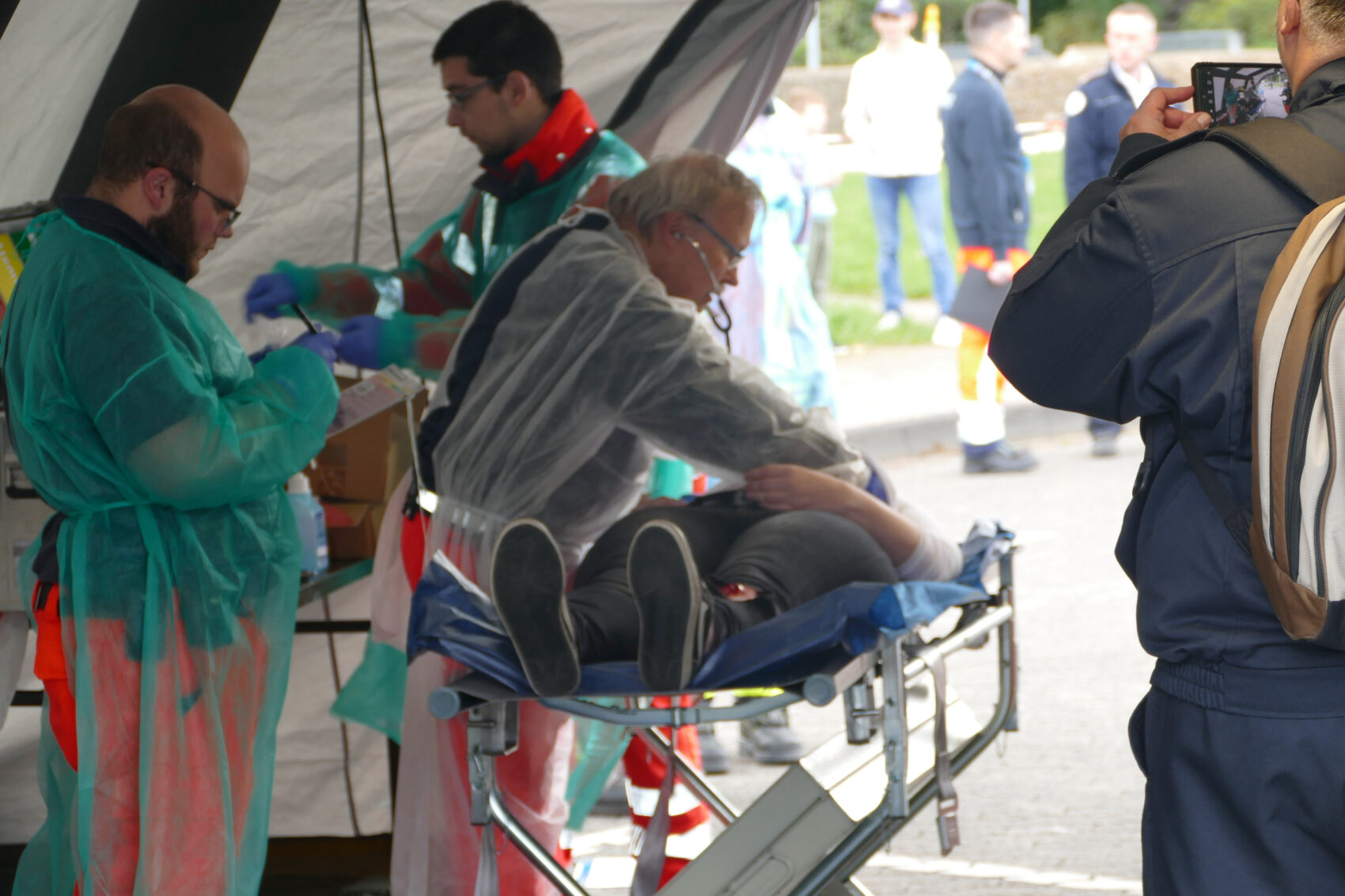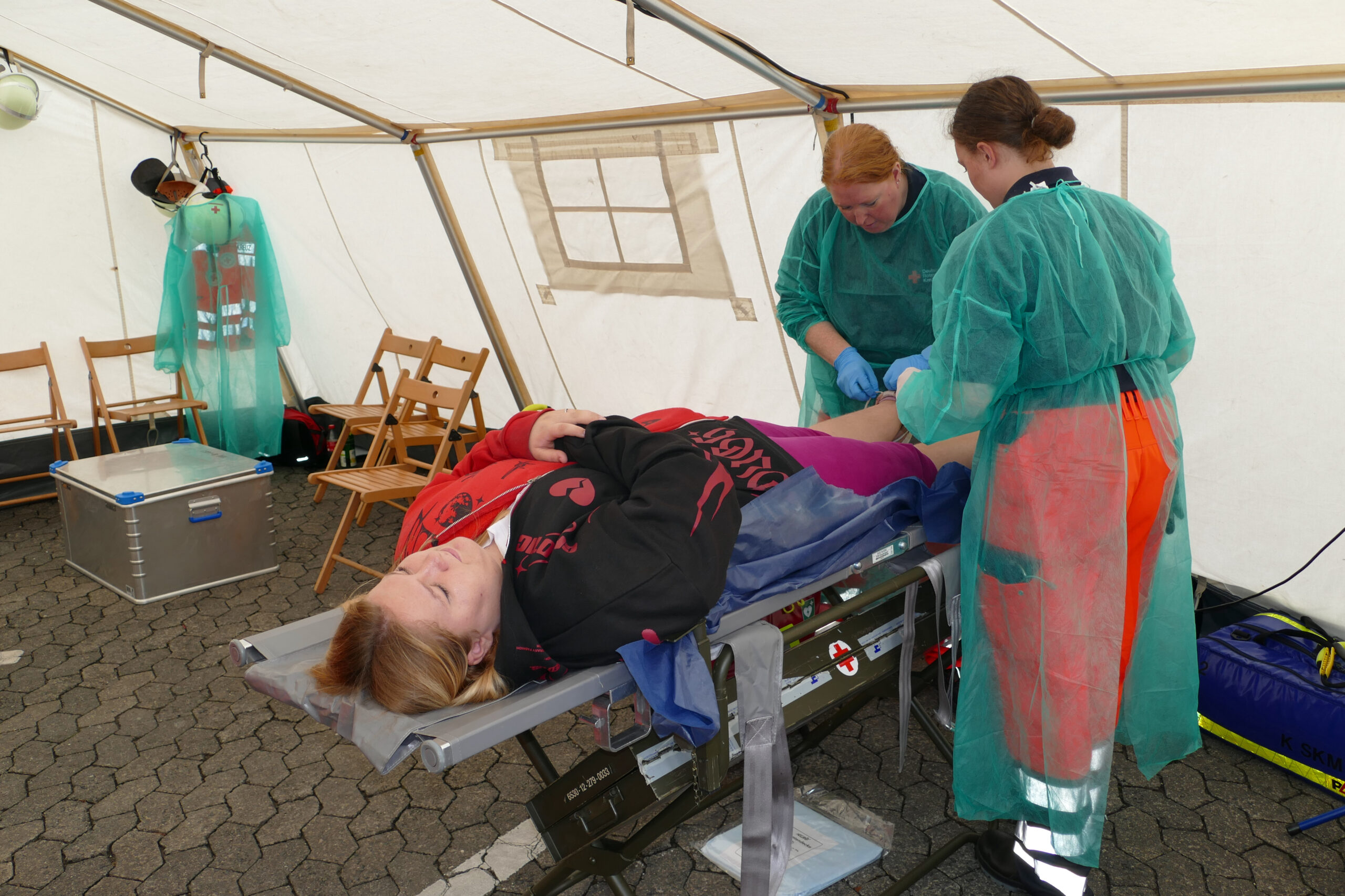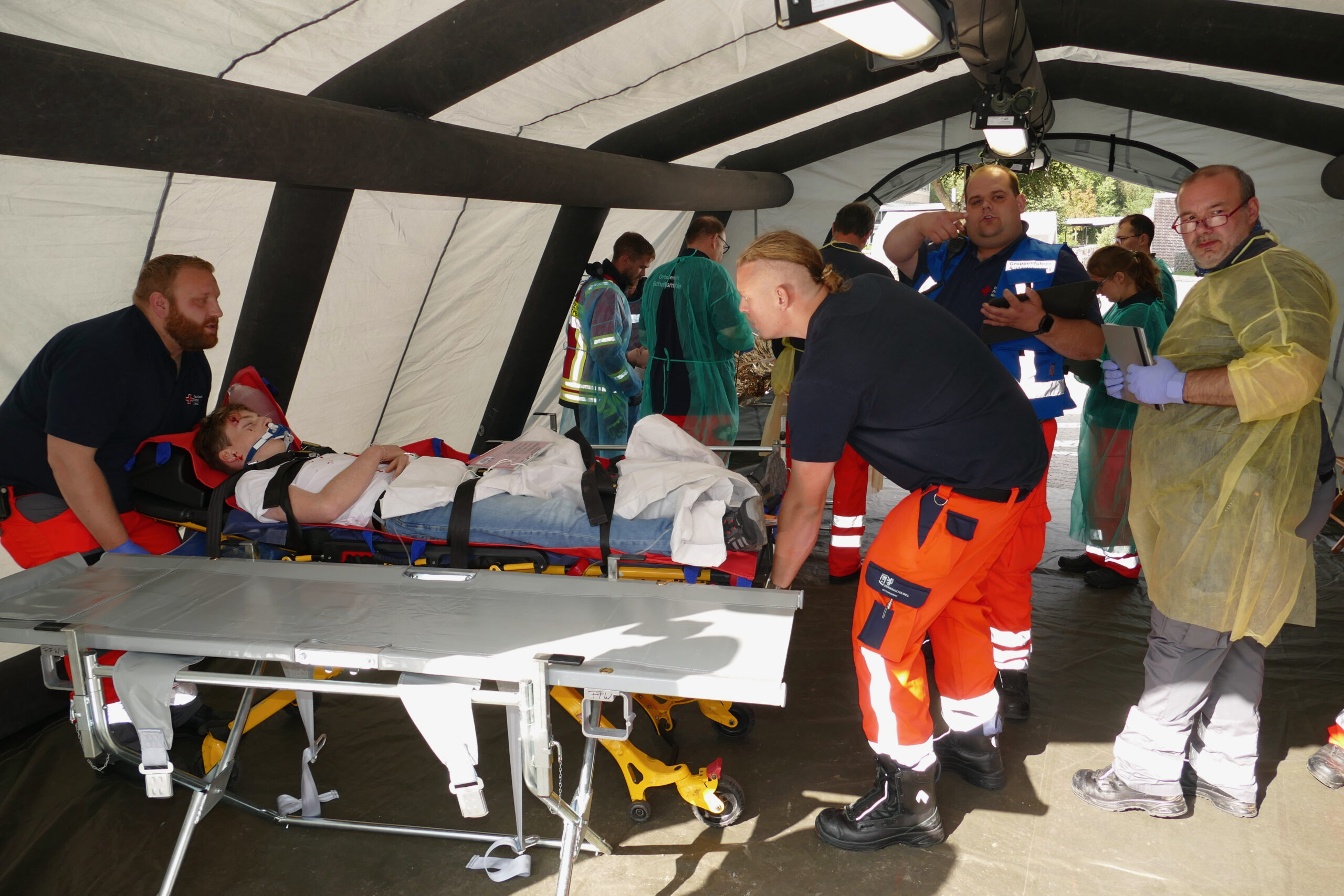 Im Minutentakt wurden Verletzte heran transportiert. Sie wurden im Eingangszelt untersucht und erstbehandelt, dann je nach Schwere der Verletzung in eines der drei farblich kategorisierten Behandlungszelte weitergeleitet. Schmerzensschreie von Verletzten schallten über den Platz. Eine offenbar unter Schock stehende Mutter musste beruhigt werden. Erkenntnis für die Beobachter: Die Abläufe funktionierten auch unter diesen wirklichkeitsnahen Bedingungen. Verbesserungsmöglichkeiten wurden notiert und in der Nachbereitung angesprochen.