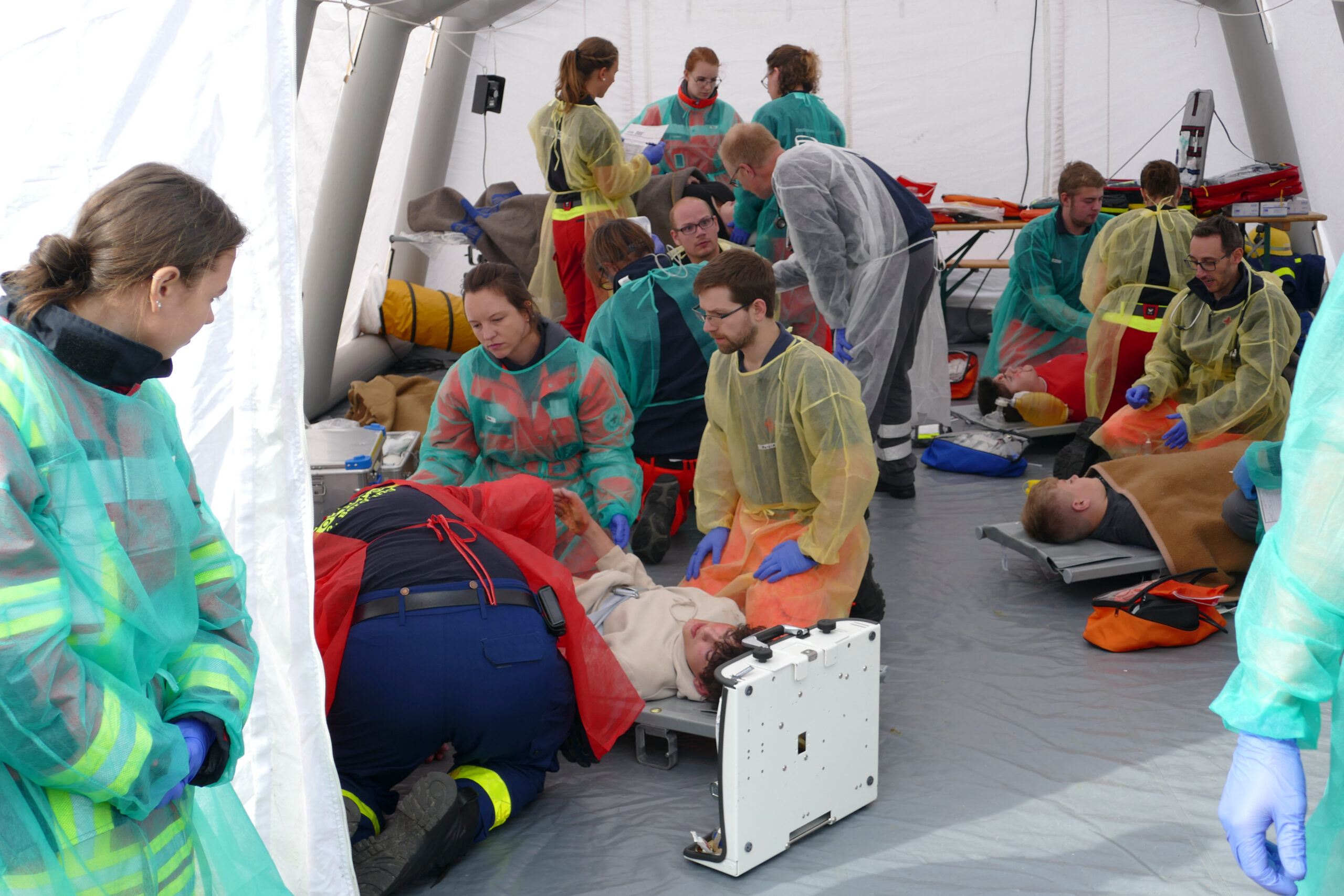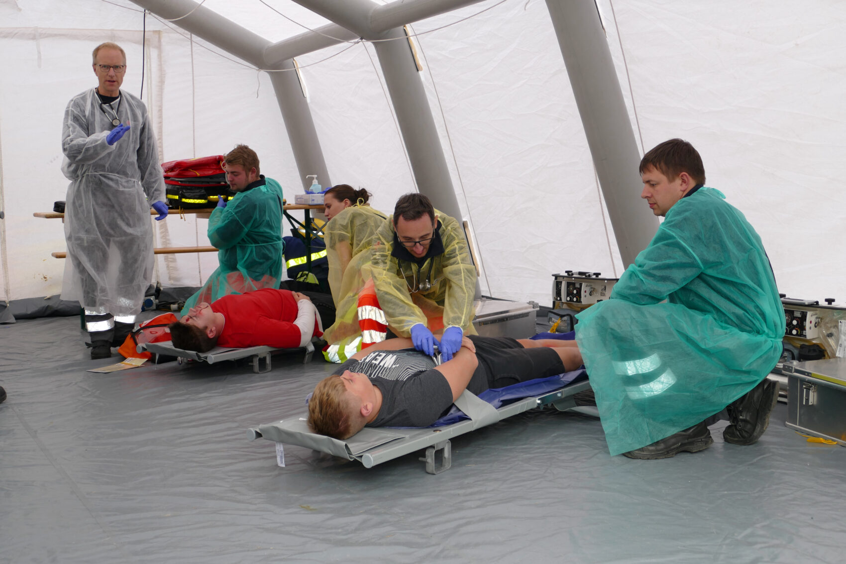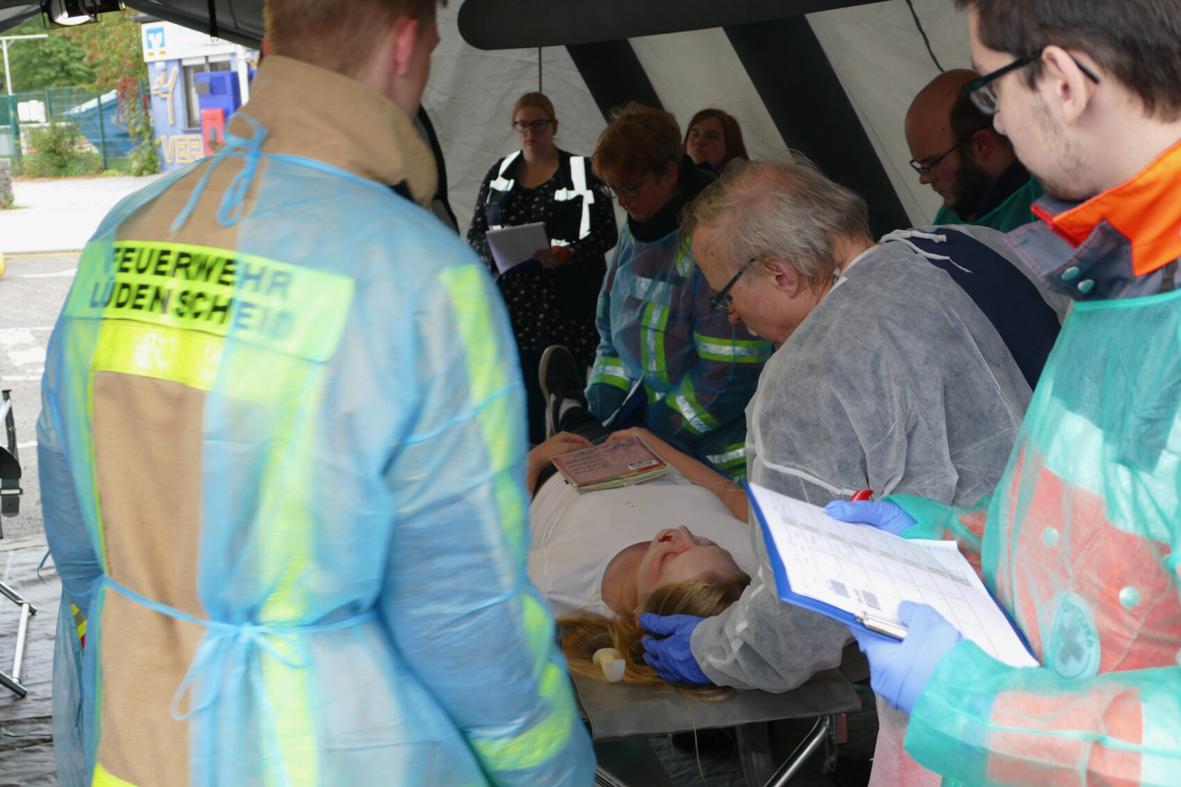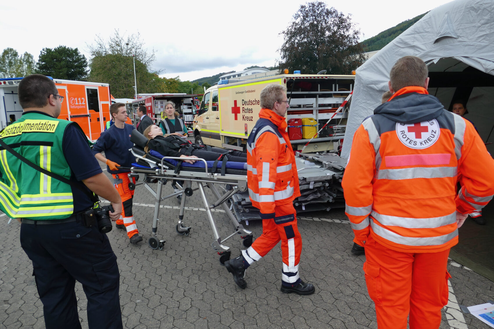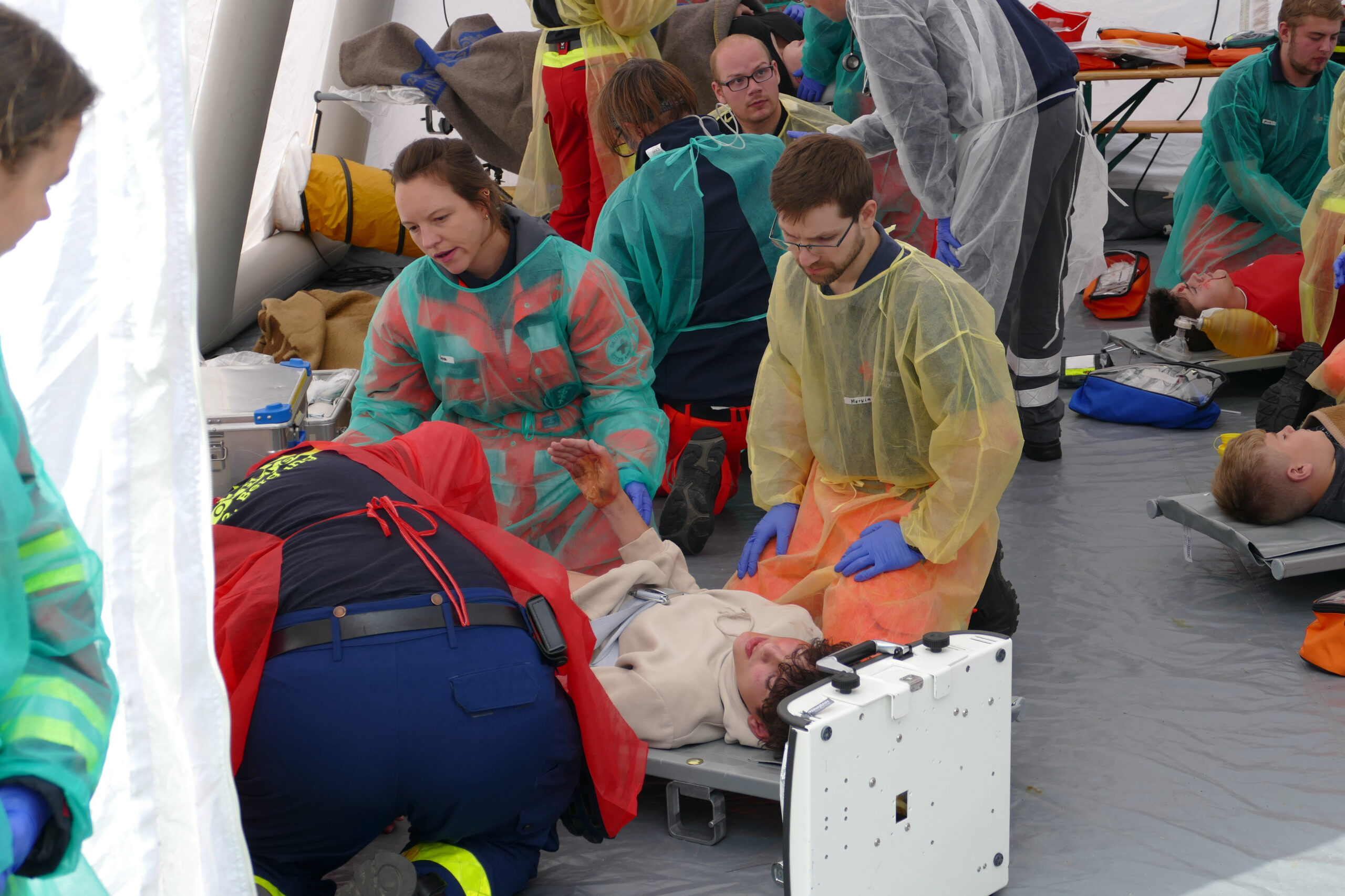 Im Minutentakt wurden Verletzte heran transportiert. Sie wurden im Eingangszelt untersucht und erstbehandelt, dann je nach Schwere der Verletzung in eines der drei farblich kategorisierten Behandlungszelte weitergeleitet. Schmerzensschreie von Verletzten schallten über den Platz. Eine offenbar unter Schock stehende Mutter musste beruhigt werden. Erkenntnis für die Beobachter: Die Abläufe funktionierten auch unter diesen wirklichkeitsnahen Bedingungen. Verbesserungsmöglichkeiten wurden notiert und in der Nachbereitung angesprochen.