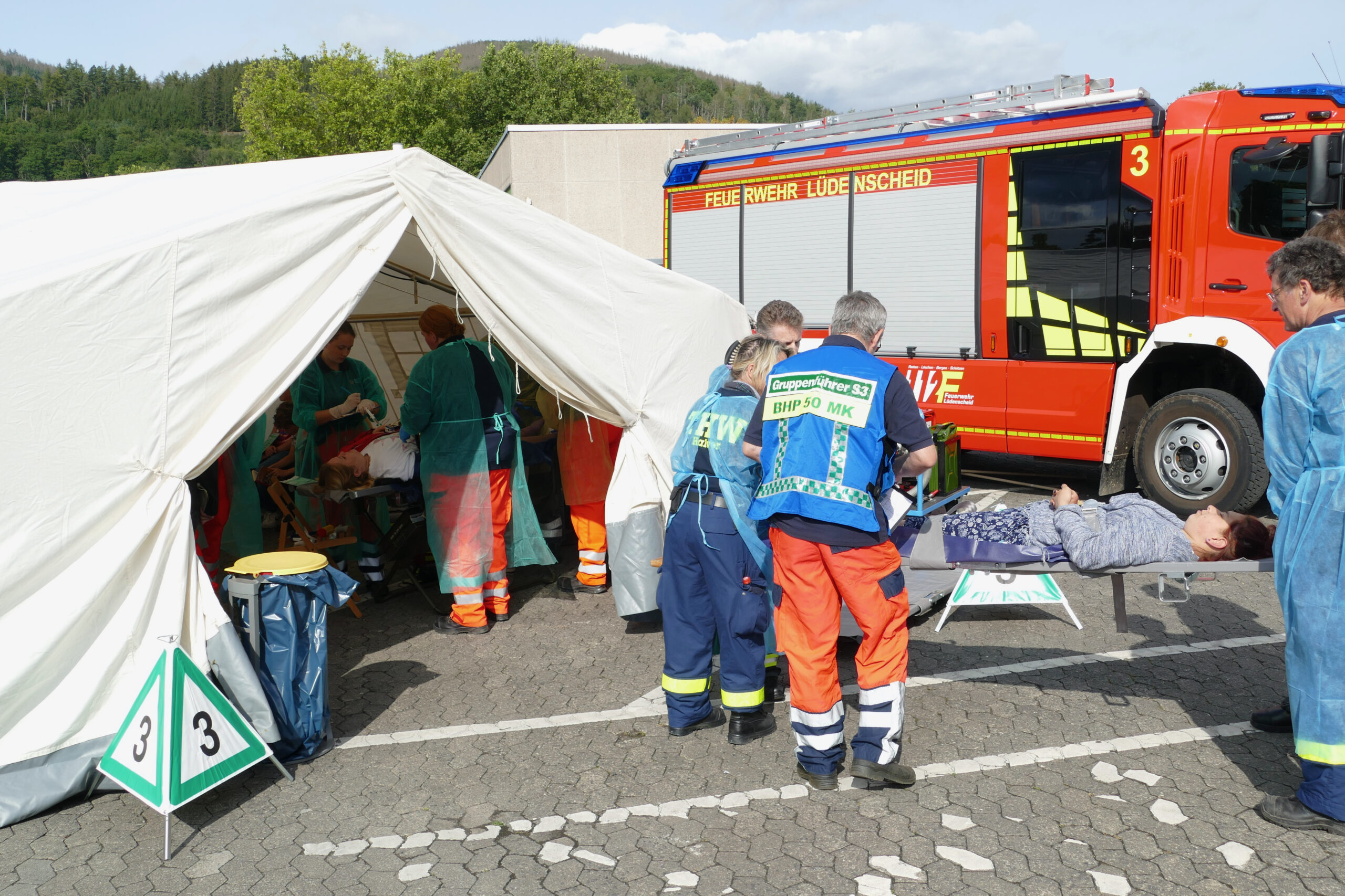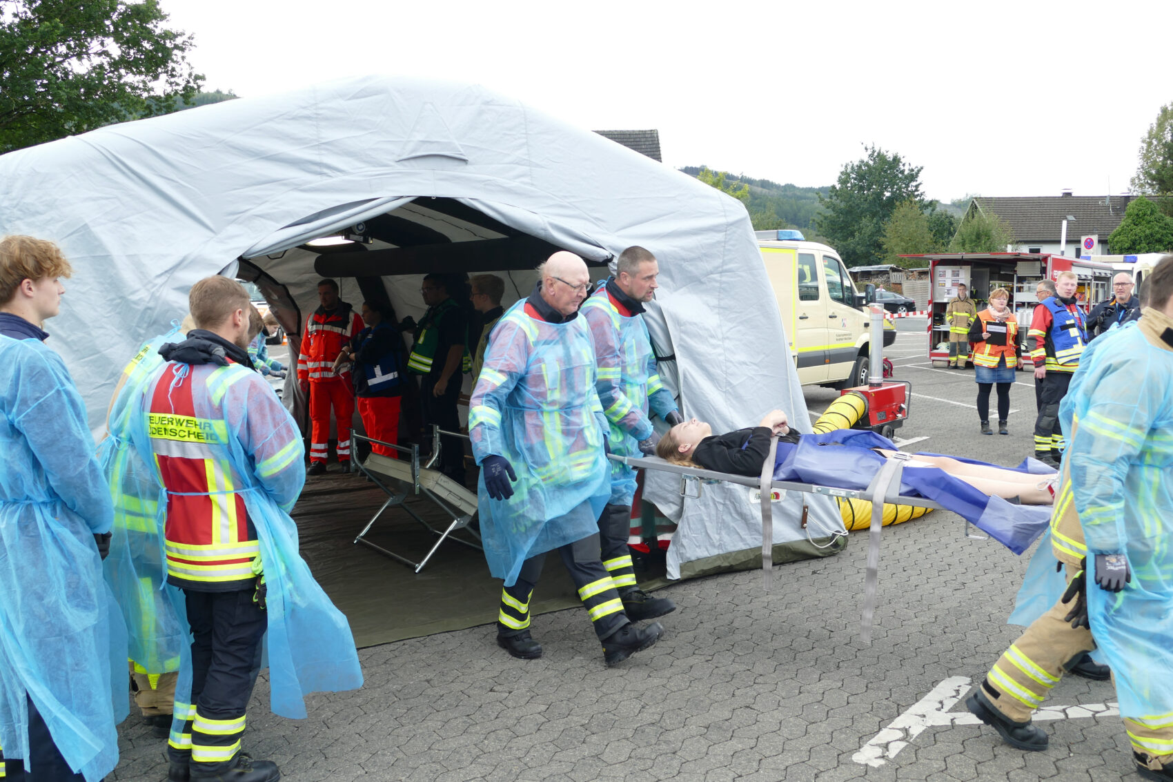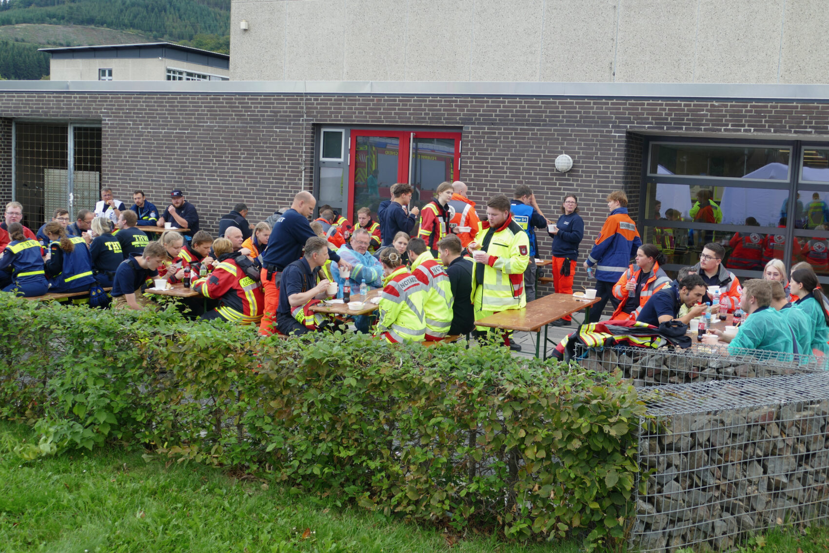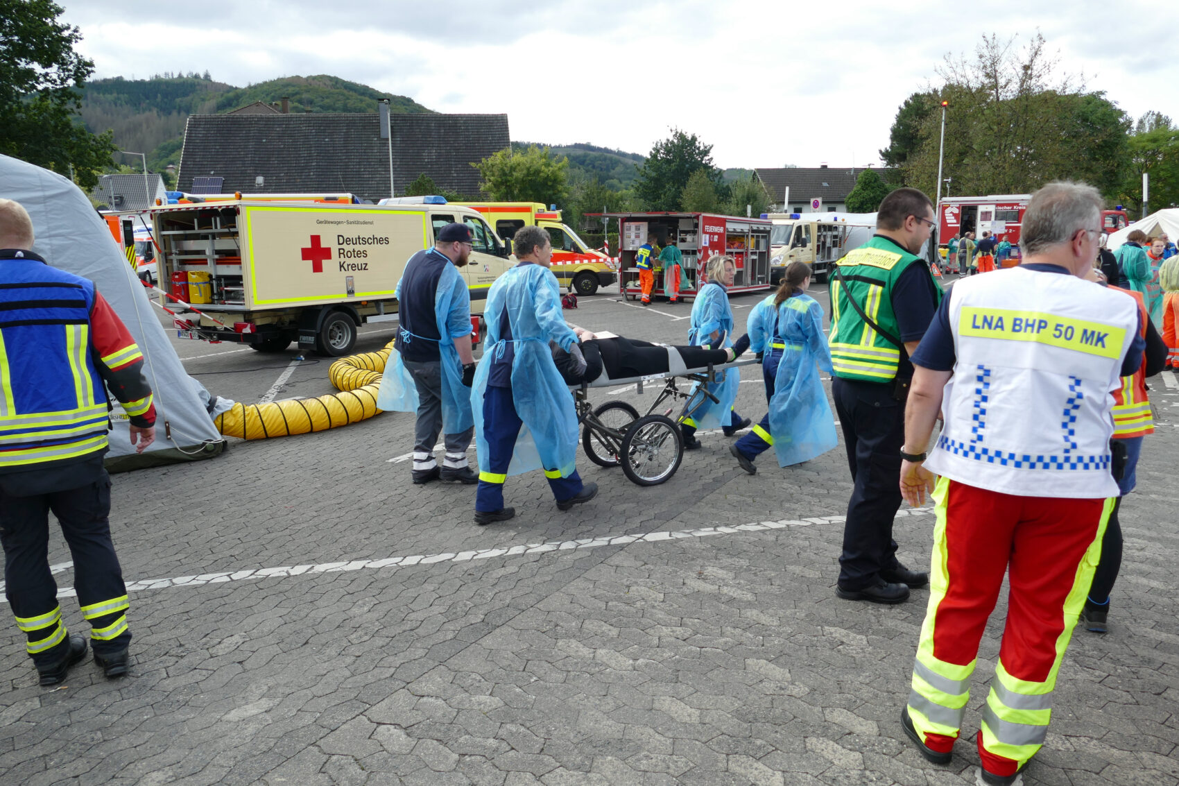 Nach einer Pause, in der die Übungsteilnehmer von der Feldküche der Feuerwehr Plettenberg versorgt wurden, folgte der zweite Übungsteil mit etwa 25 Verletztendarstellern, die versorgt und deren Weitertransport in geeignete Krankenhäuser geplant und organisiert werden mussten. Die zuvor geübten Abläufe wurden dabei unter realitätsnahen Bedingungen auf die Probe gestellt.