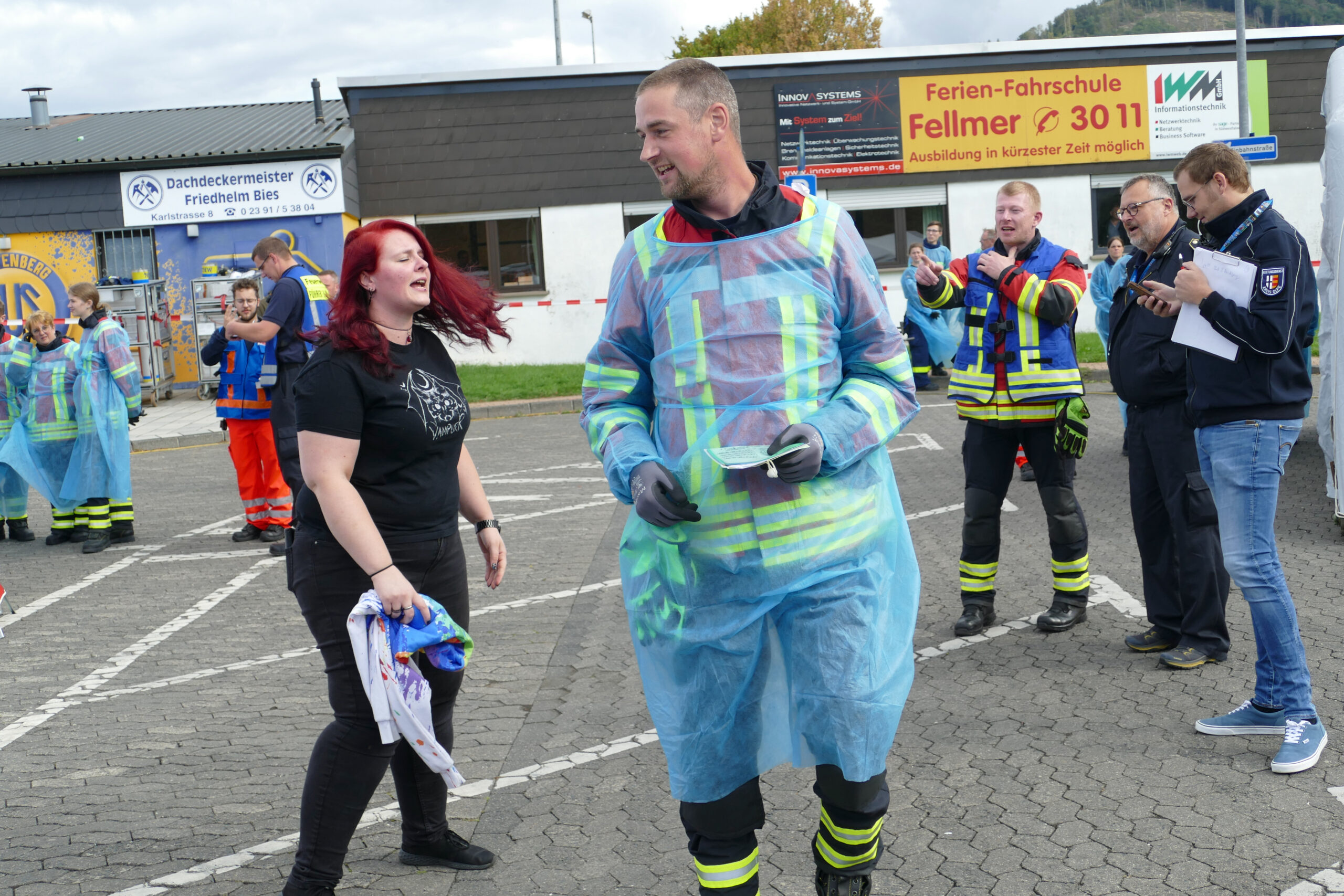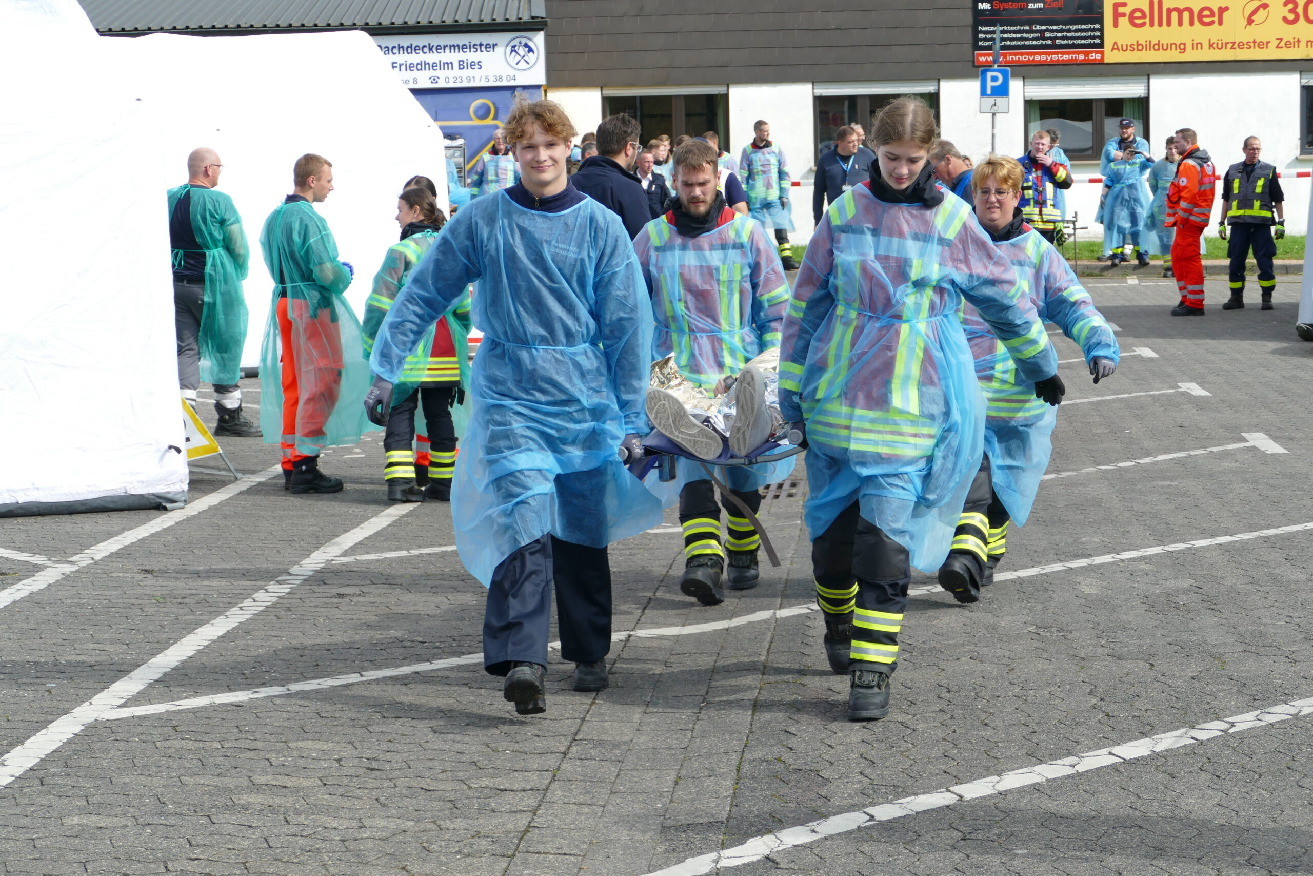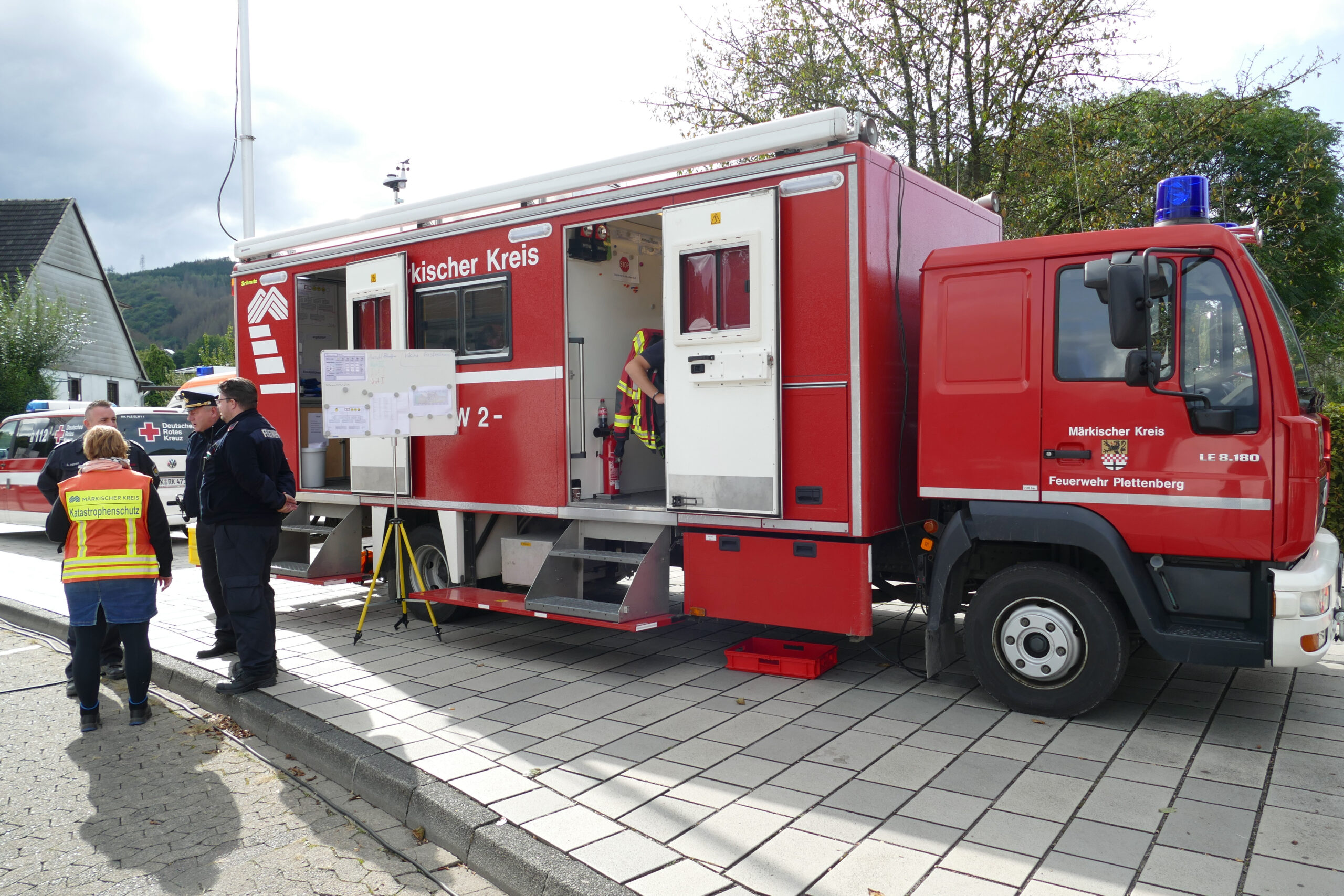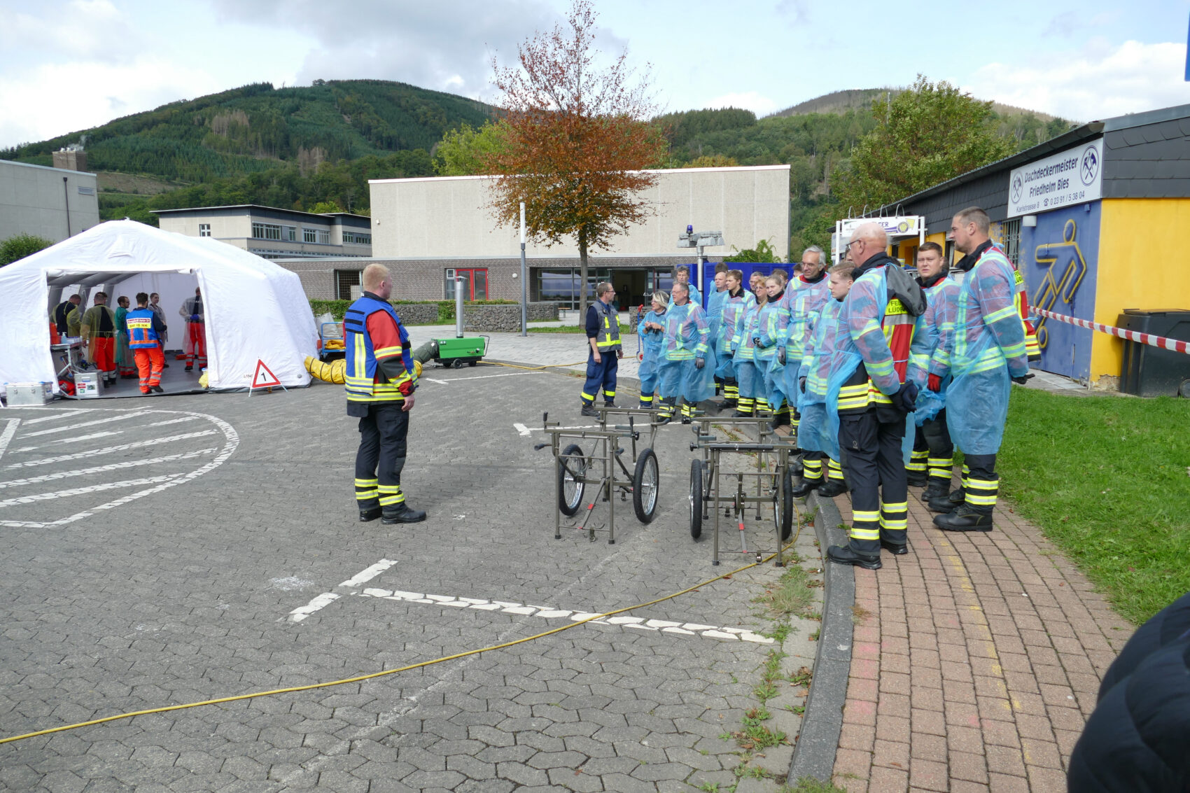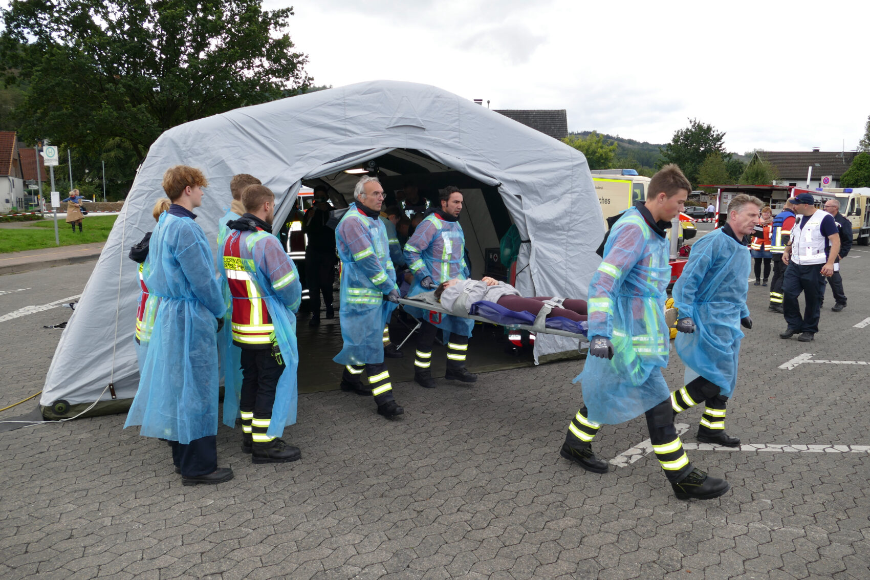 Nach einer Pause, in der die Übungsteilnehmer von der Feldküche der Feuerwehr Plettenberg versorgt wurden, folgte der zweite Übungsteil mit etwa 25 Verletztendarstellern, die versorgt und deren Weitertransport in geeignete Krankenhäuser geplant und organisiert werden mussten. Die zuvor geübten Abläufe wurden dabei unter realitätsnahen Bedingungen auf die Probe gestellt.