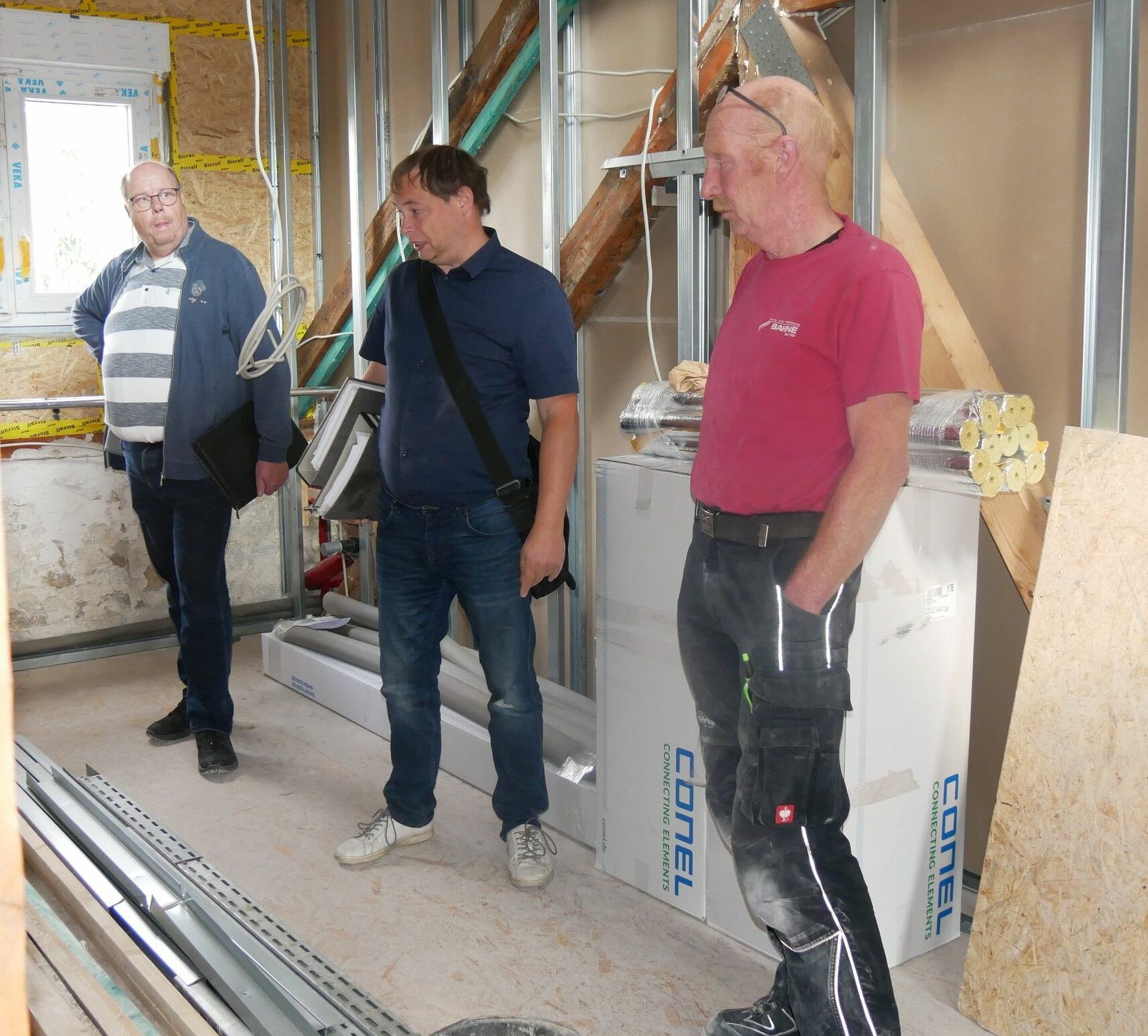 In der kommenden Woche soll das neu angebaute Treppenhaus eine Aluminium-Glas-Fassade bekommen. Während Timo Dittner gerade anfängt zu erklären, wie das aussehen soll, kommt auch schon die nächste Frage. Die Dachdecker haben ein Problem mit dem Kamin festgestellt. Dieser habe einen Mangel, da müsse noch einmal durch die andere Firma nachgearbeitet werden. Zudem gab es Fragen zu Brandschutzleisten. Für den Architekten ist das Alltag. Routiniert und geduldig beantwortet er alle Fragen. Inzwischen sind auch die Elektriker da. Im Gepäck haben sie die Ergebnisse des Sachverständigen. Fachsimpelei unter Experten. Doch die Stimmung ist allgemein gut. Denn es geht voran und in großen Schritten kommen die Baufirmen der Fertigstellung immer näher.
