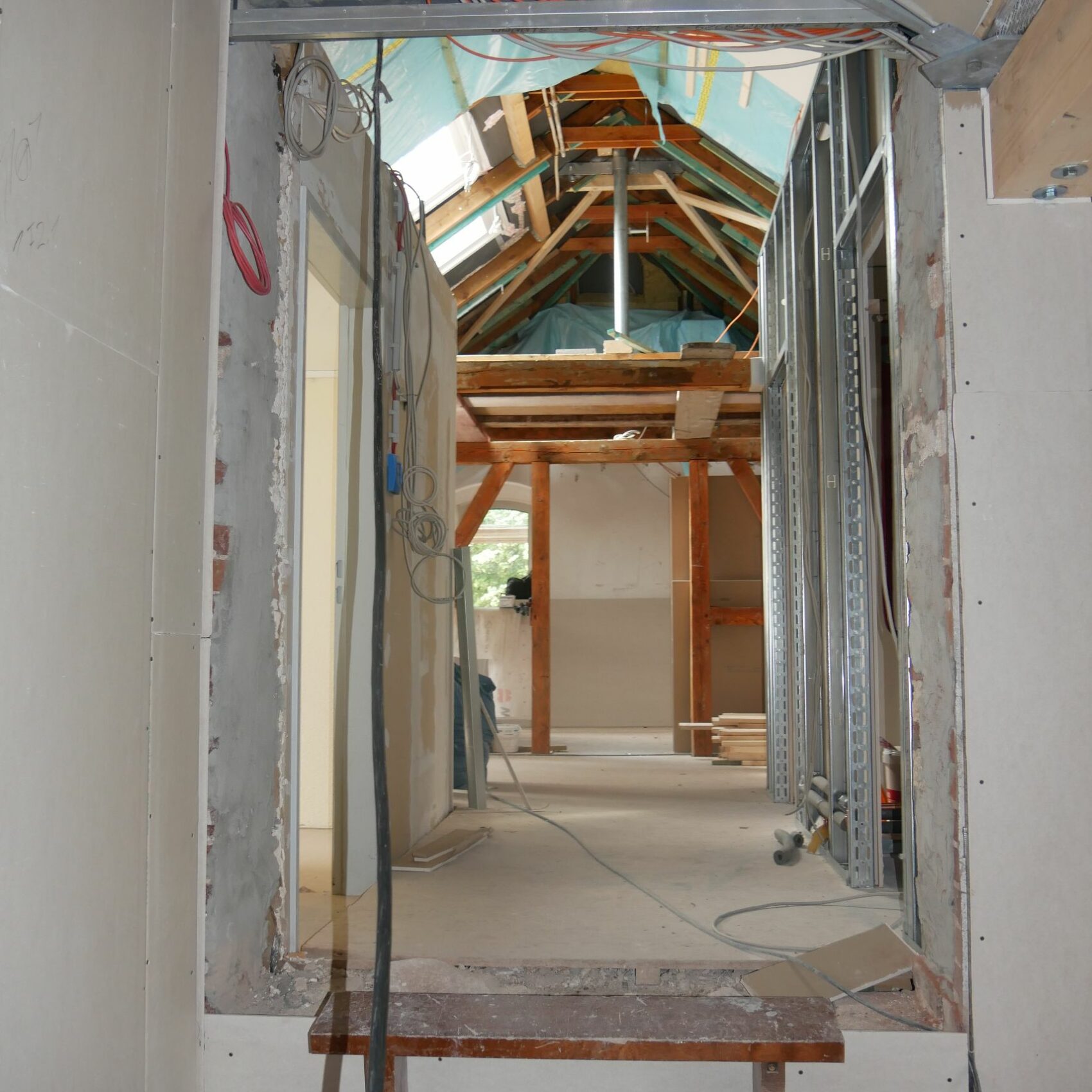 Während der Architekt mit den Mitarbeitern der Sanitärfirma, Natascha Handschak und Sascha Panne in der zukünftigen Teeküche diskutiert, tragen die Elektriker kistenweise Leitungskanäle nach oben, ein anderer steht auf einer Leiter und montiert etwas. Die Trockenbauer sind am hämmern und sägen. Durch das Dachfenster sind die Dachdecker zu sehen. Ein Gewusel wie auf einem Ameisenhaufen. Aber Natascha Handschak und Timo Dittmer stimmt das organisierte Chaos fröhlich. „Die Gewerke greifen aktuell gut ineinander. Ich denke, dass wir im August soweit sind, dass es an den Feinschliff der Inneneinrichtung geht“, erklärt der Architekt.