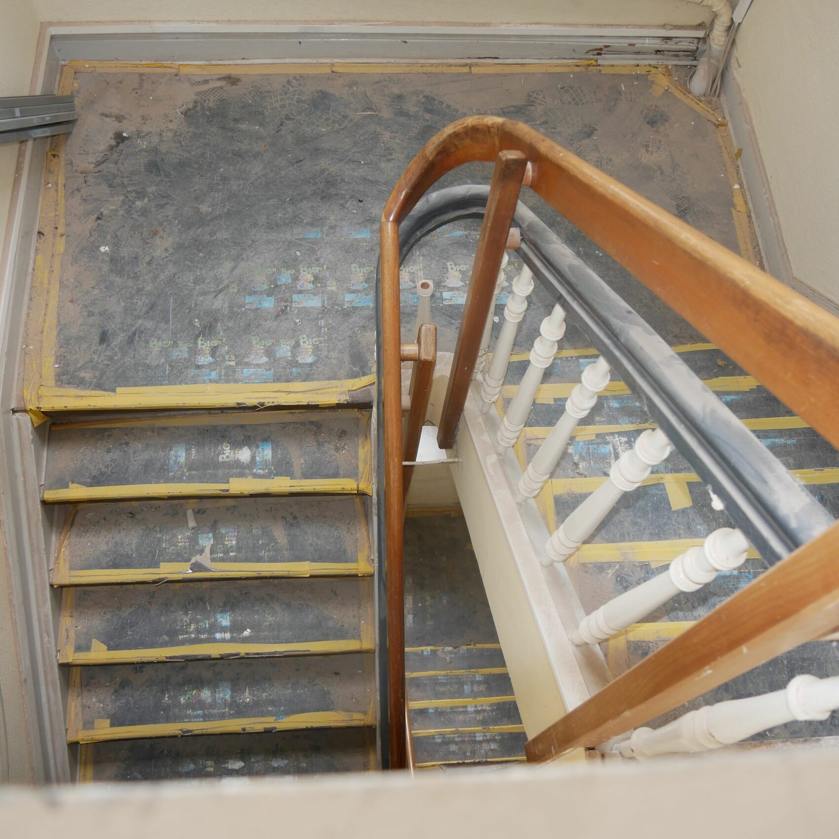 „Die Elektriker sind noch mit dem Sachverständigen unterwegs. Dann fangen wir mit euch an“, sagt er zu den Leitern der Sanitärfirma. Mit Klemmbrett und Elan geht es hinauf über das alte, kleine Treppenhaus in die erste Etage. „Das Treppenhaus ist eigentlich das einzige, was in diesem Gebäude nahezu erhalten bleibt“, erklärt der Architekt auf dem Weg nach oben. Das alte und verhältnismäßig enge Treppenhaus habe nämlich Bestandsschutz. „Wenn wir das angehen würden, müssten wir alles neu und größer machen. Das wären irre Kosten und ein riesen Aufwand. So bleibt das Treppenhaus – das ja lediglich ein Nebenzugang ist und als Fluchtweg dient – erhalten und wird etwas an die neuen Sicherheitsvorschriften angepasst“, erklärt Timo Dittner. Zu sehen sei eine solche Anpassung beispielsweise am Geländer, das bereits im Vorfeld erhöht wurde.