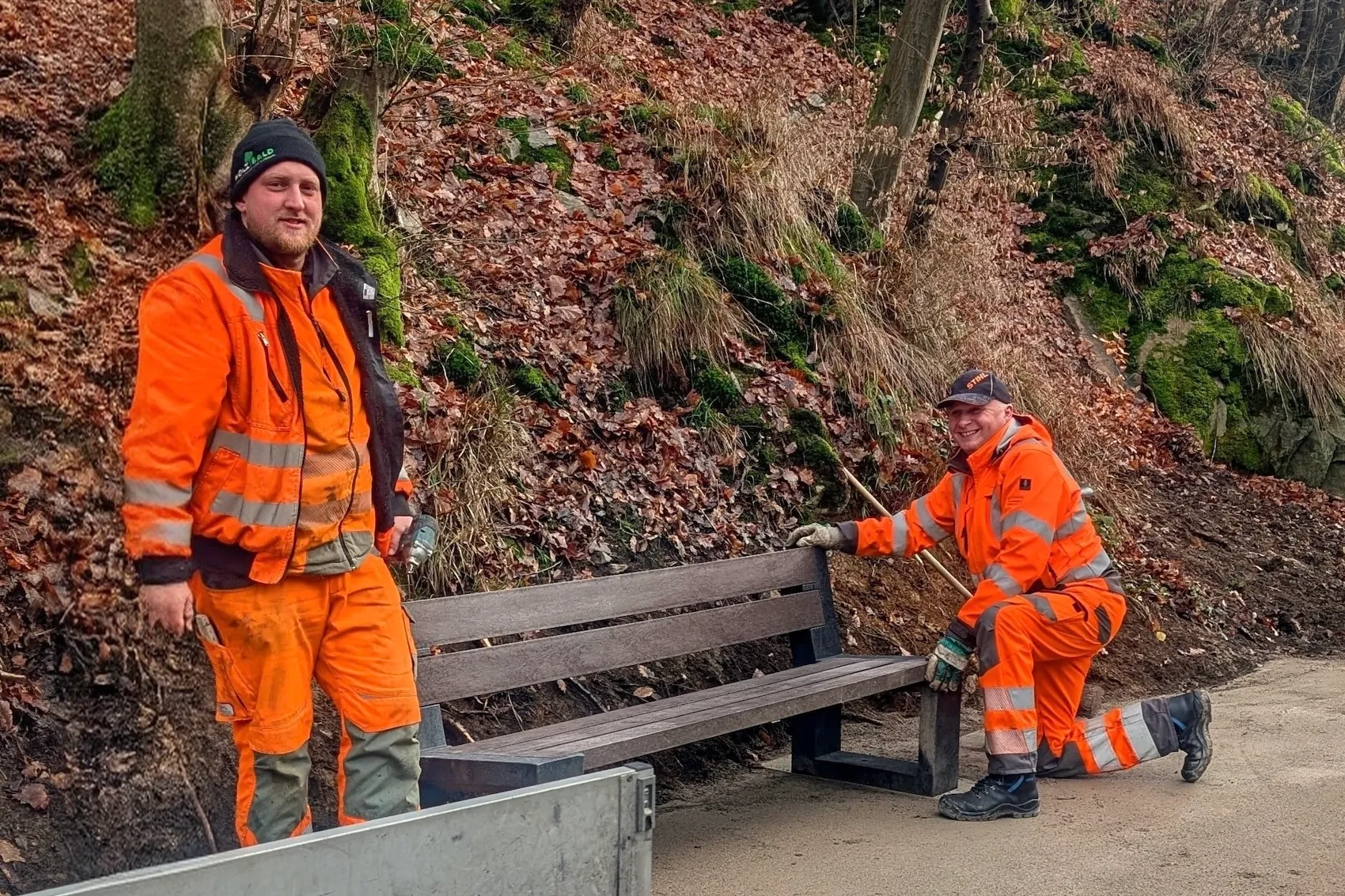 Für die Umsetzung sorgten die Bauhof-Mitarbeiter Osman Rizvic und Winfried Kappel. Mit handwerklichem Einsatz hoben sie die Bänke so an, dass das Hinsetzen und Aufstehen nun deutlich leichter sein und dadurch den Komfort für Spaziergängerinnen und Spaziergänger erhöhen soll.