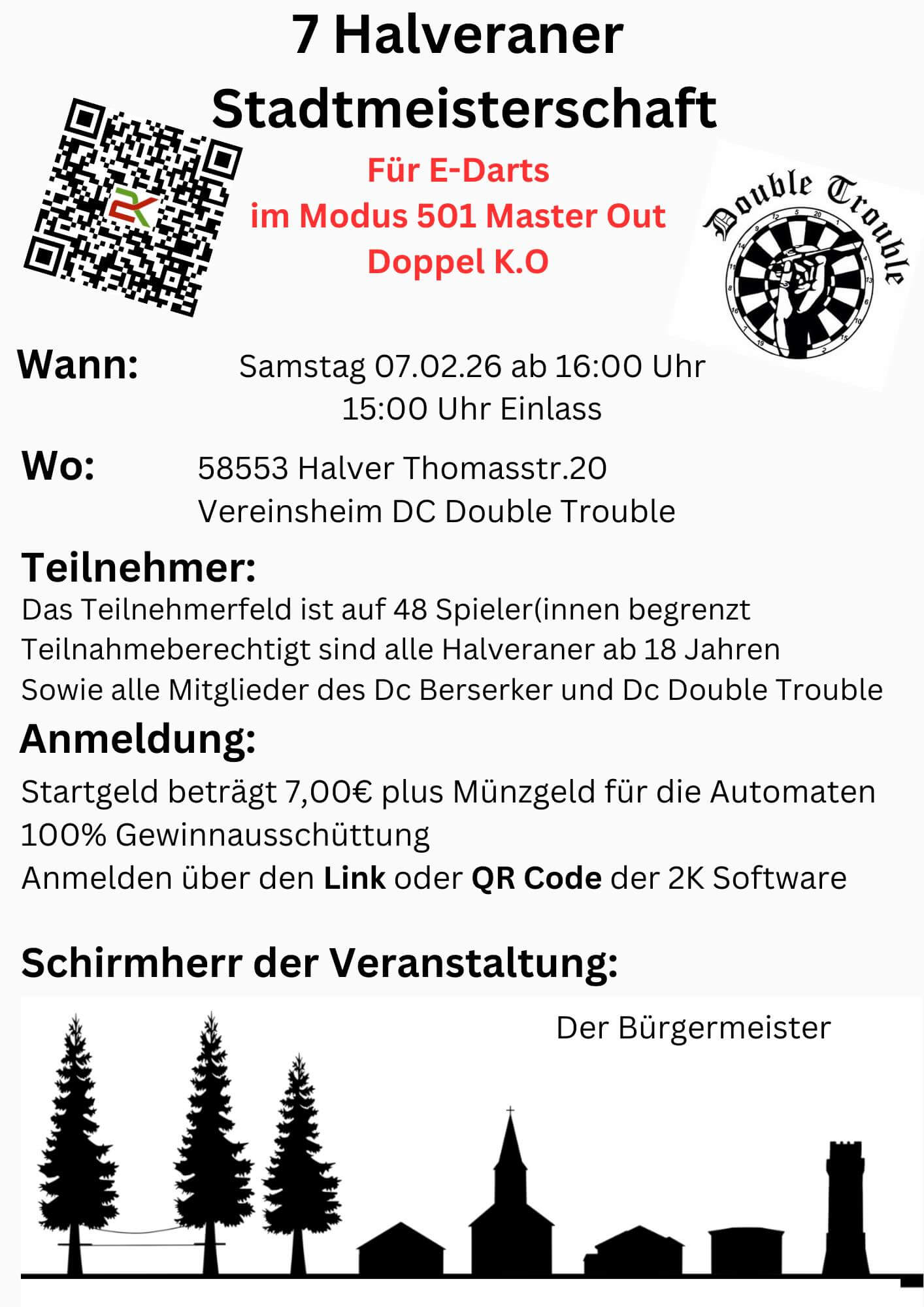 Der Halveraner Dartsverein DC Double Trouble lädt am Samstag, 7. Februar, zur siebten Halveraner Stadtmeisterschaft im E-Darts ein. Los geht's um 16 Uhr im Vereinsheim an der Thomasstraße 20.