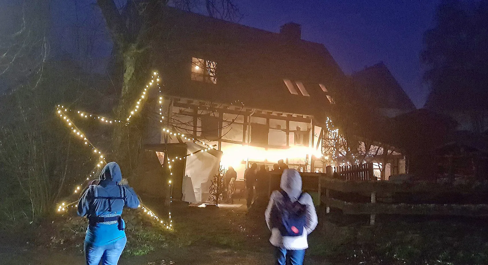 Draußen flackern Holzscheite in der Feuerschale. In einer Hütte brutzeln Reibeplätzchen, werden Punsch und Liköre ausgeschenkt. Liebevoll dekoriert mit Sahnehäubchen. Zwischendurch verteilt Lena Schalenbach vom Organisationsteam Textblätter, und flugs findet sich Besucher zu einem spontanen Chor zusammen, der, begleitet von einem Blockflöten-Trio, weihnachtliche Lieder anstimmt – den Text in der einen, den Glühwein in der anderen Hand. Das Ende am Samstagabend: offen. „Der Letzte macht die Türe zu“, schmunzelt Lena Schalenbach. Leger, entspannt, familiär. Friedvolle Weihnachtszeit, wie man sie sich wünscht.