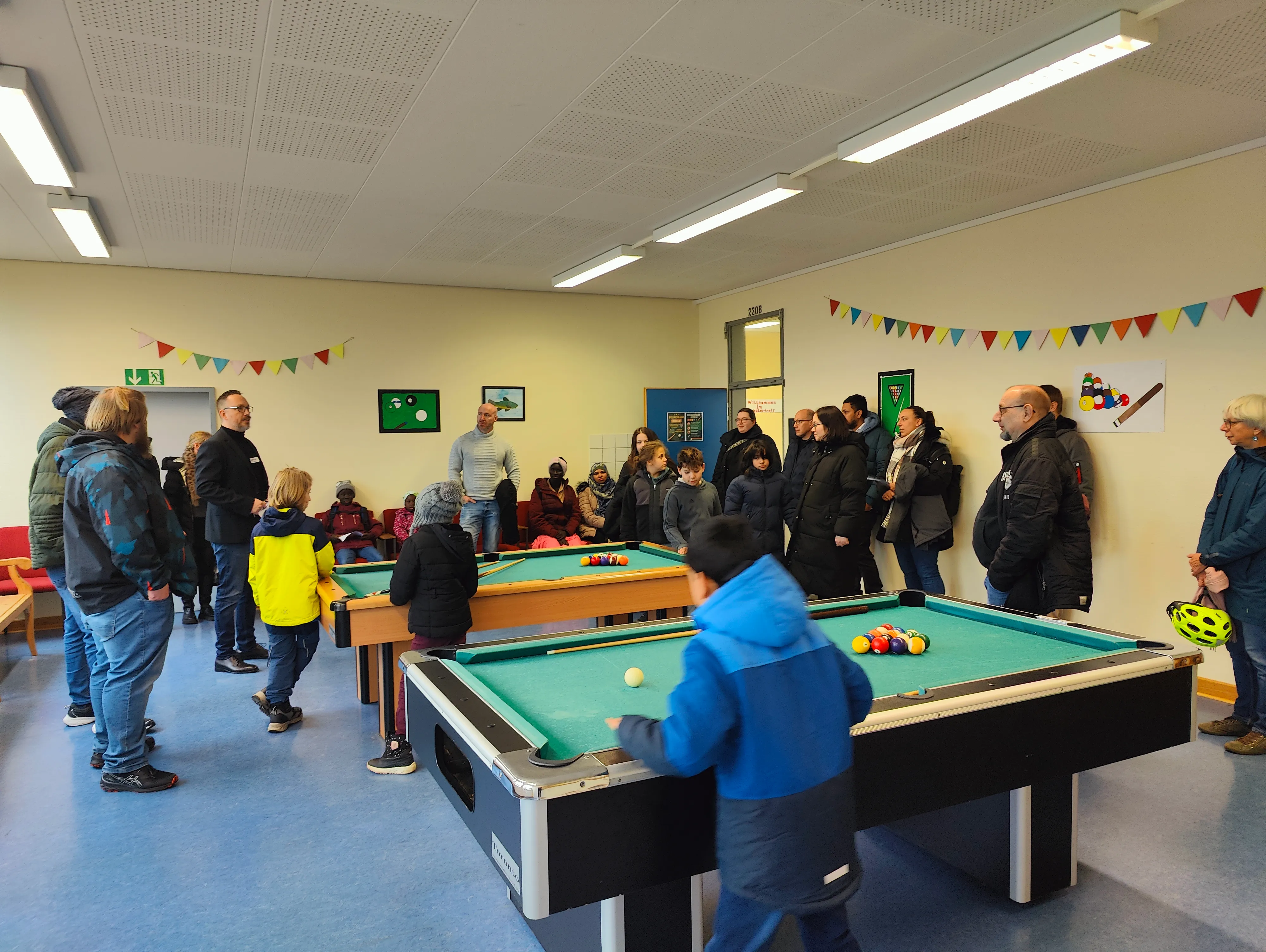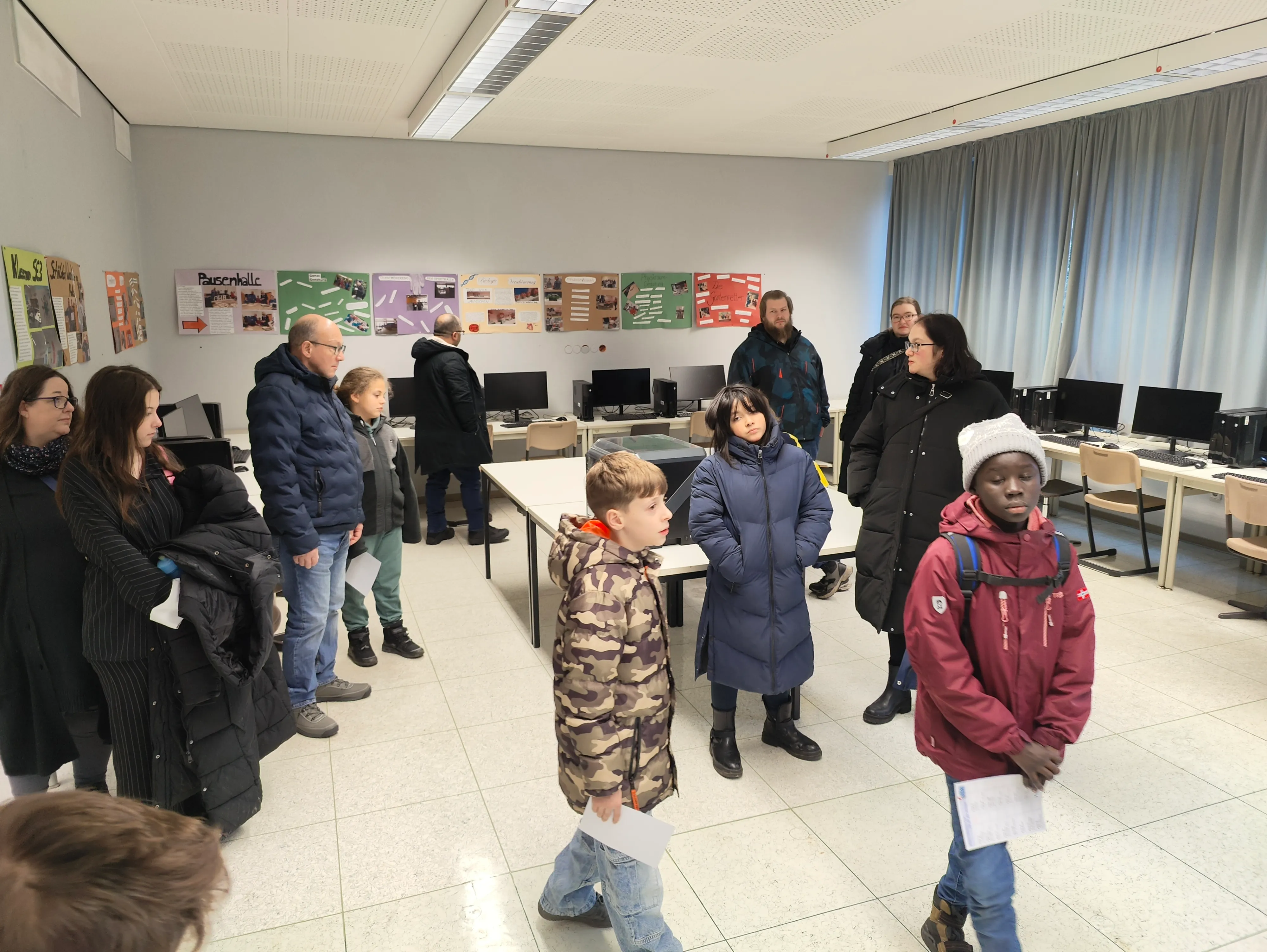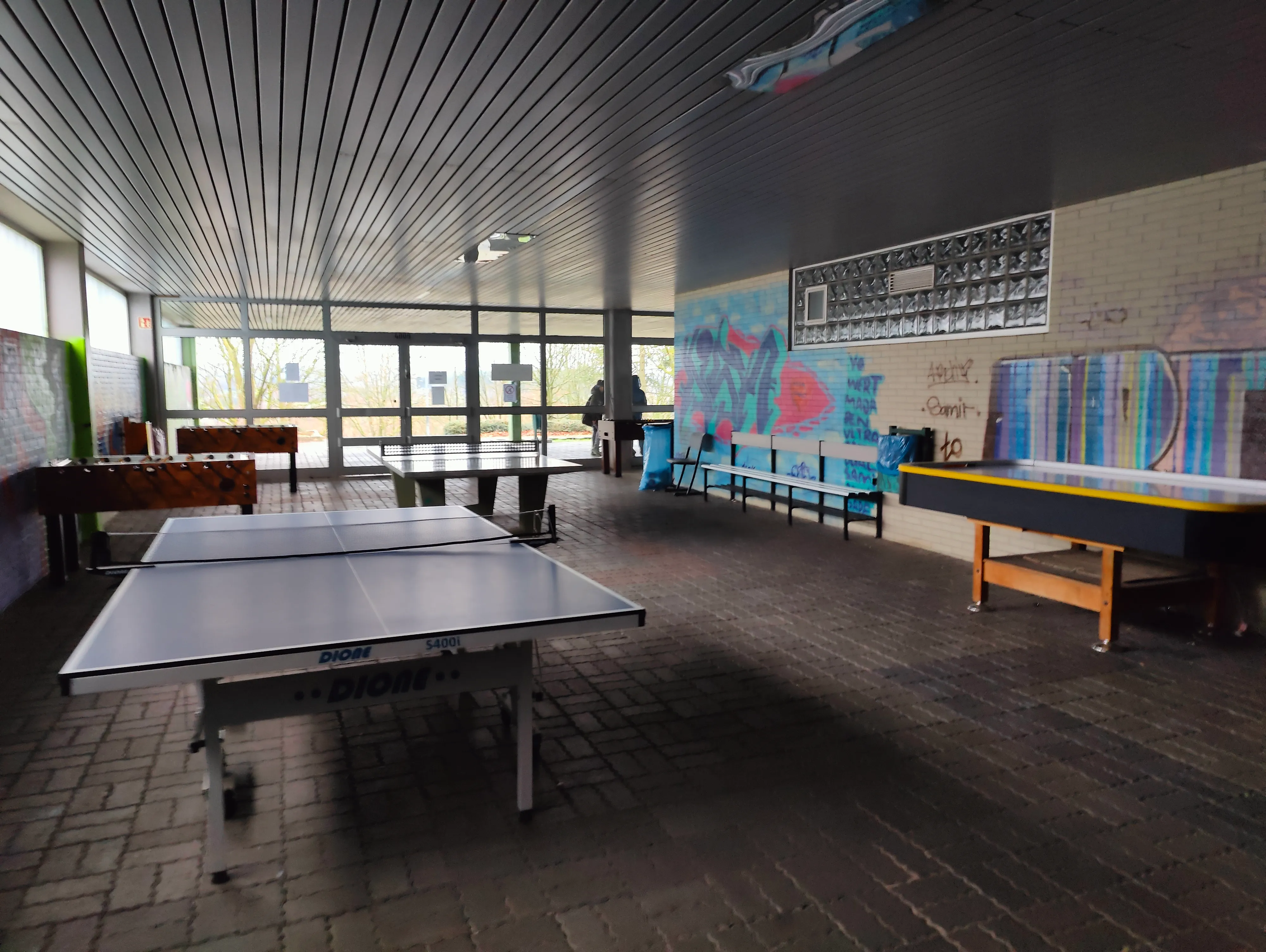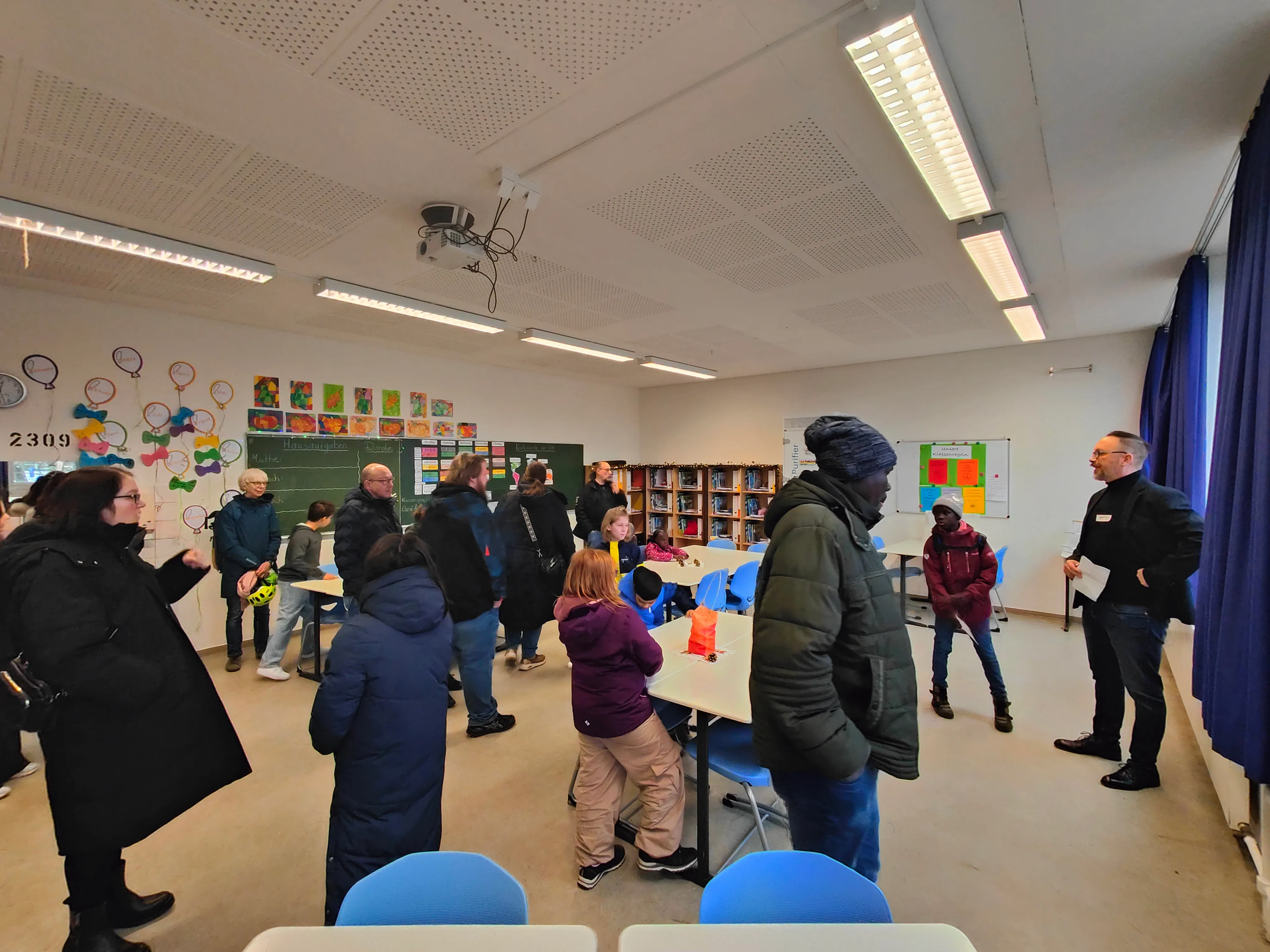 Im Anschluss gab es für alle Interessierten einen Rundgang durch die Schule. Damit eine aktive Pause stattfinden kann, gibt es einen Raum mit Tischtennisplatten, Kickern und Airhockey. Einen Puck, Ball oder Tischtennisschläger bekommen die Schüler im Tausch für ein kleines Pfand, welches zum Ende der Pause wieder zurückgegeben wird.