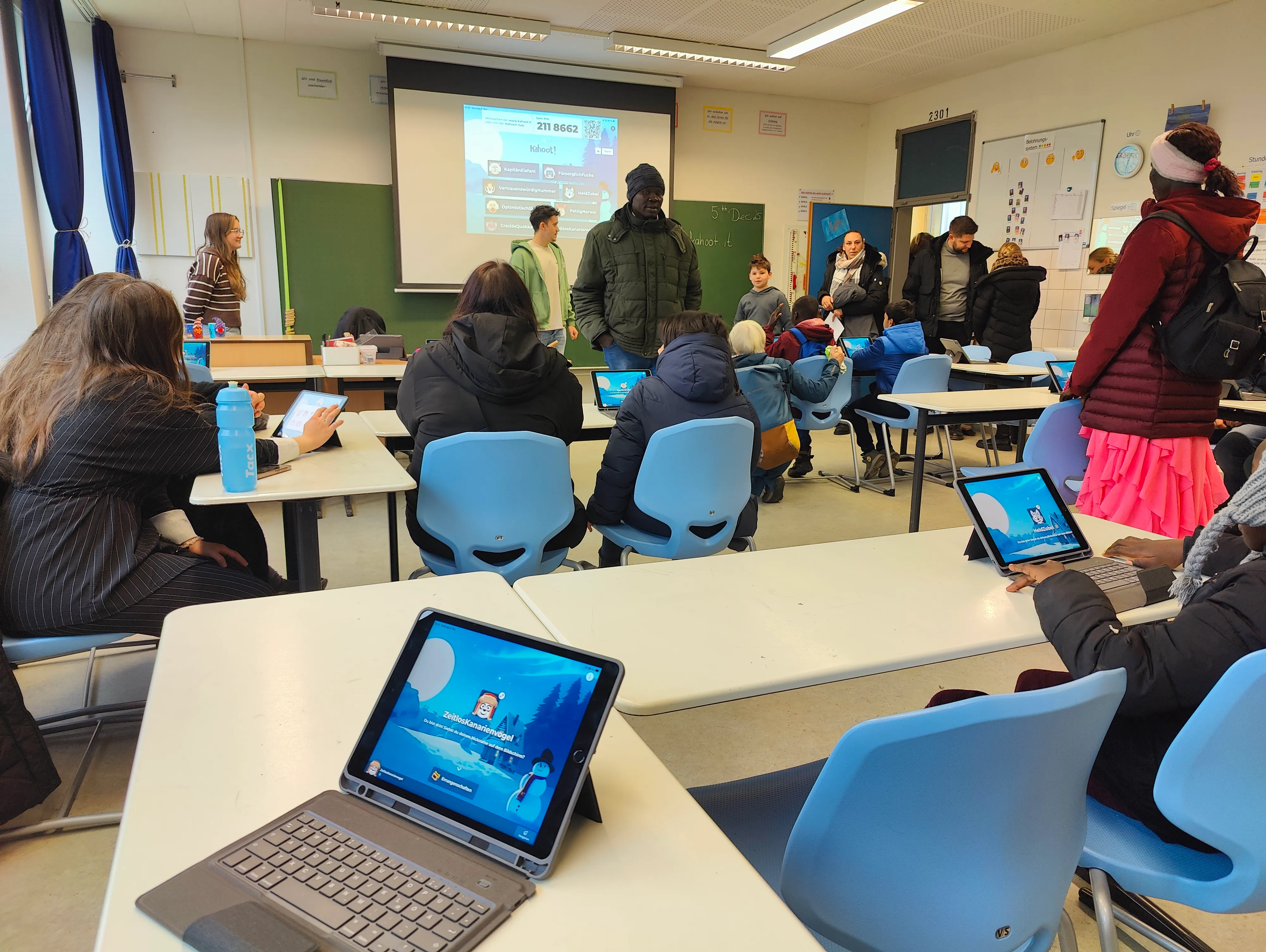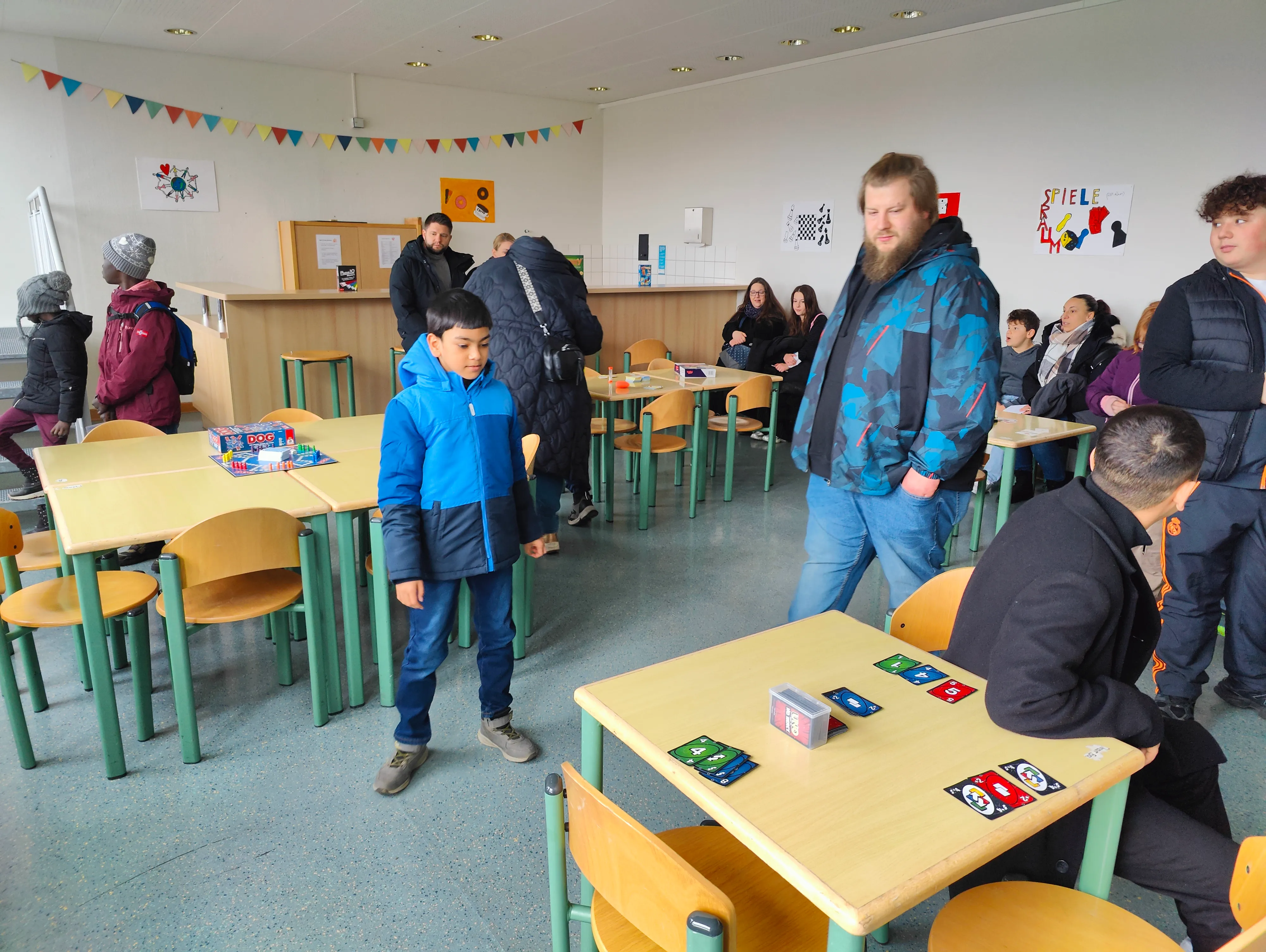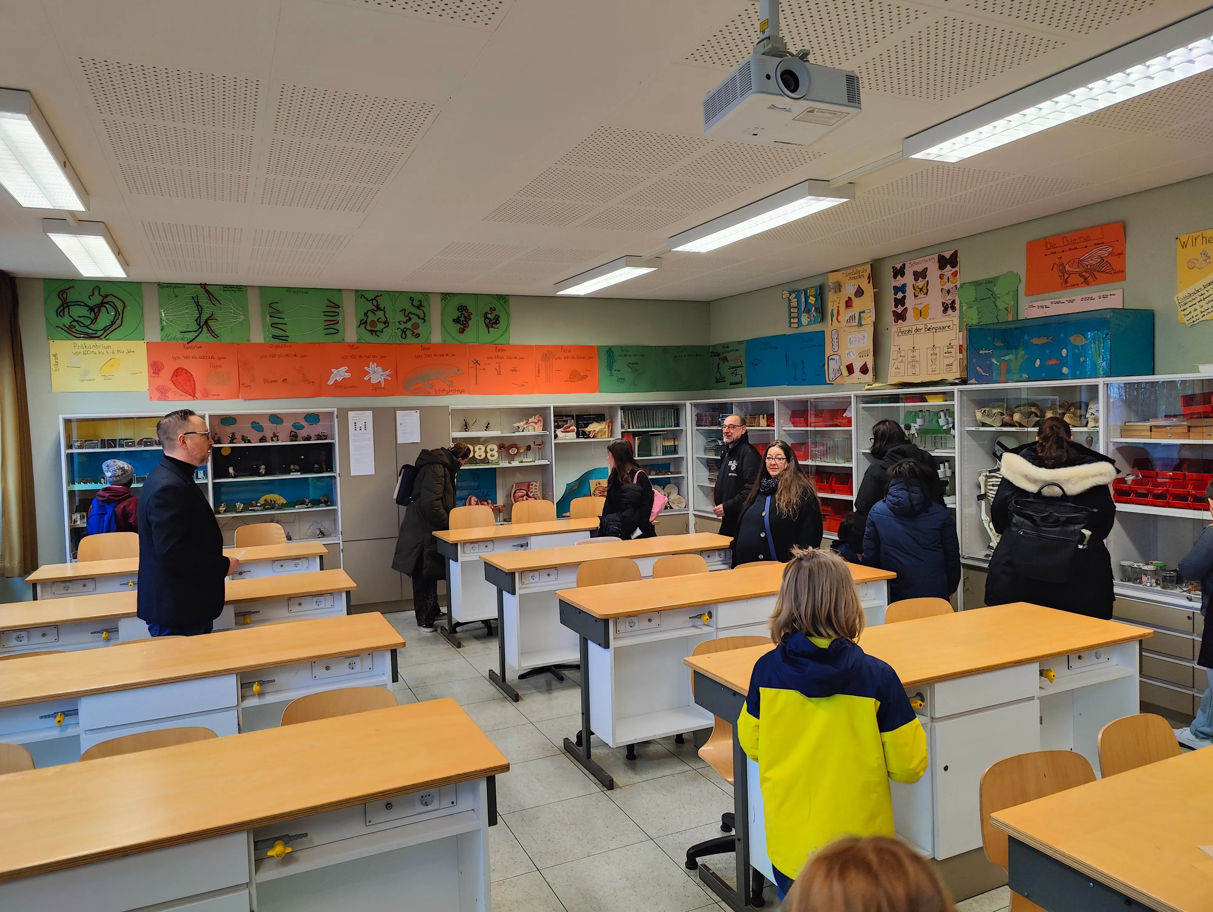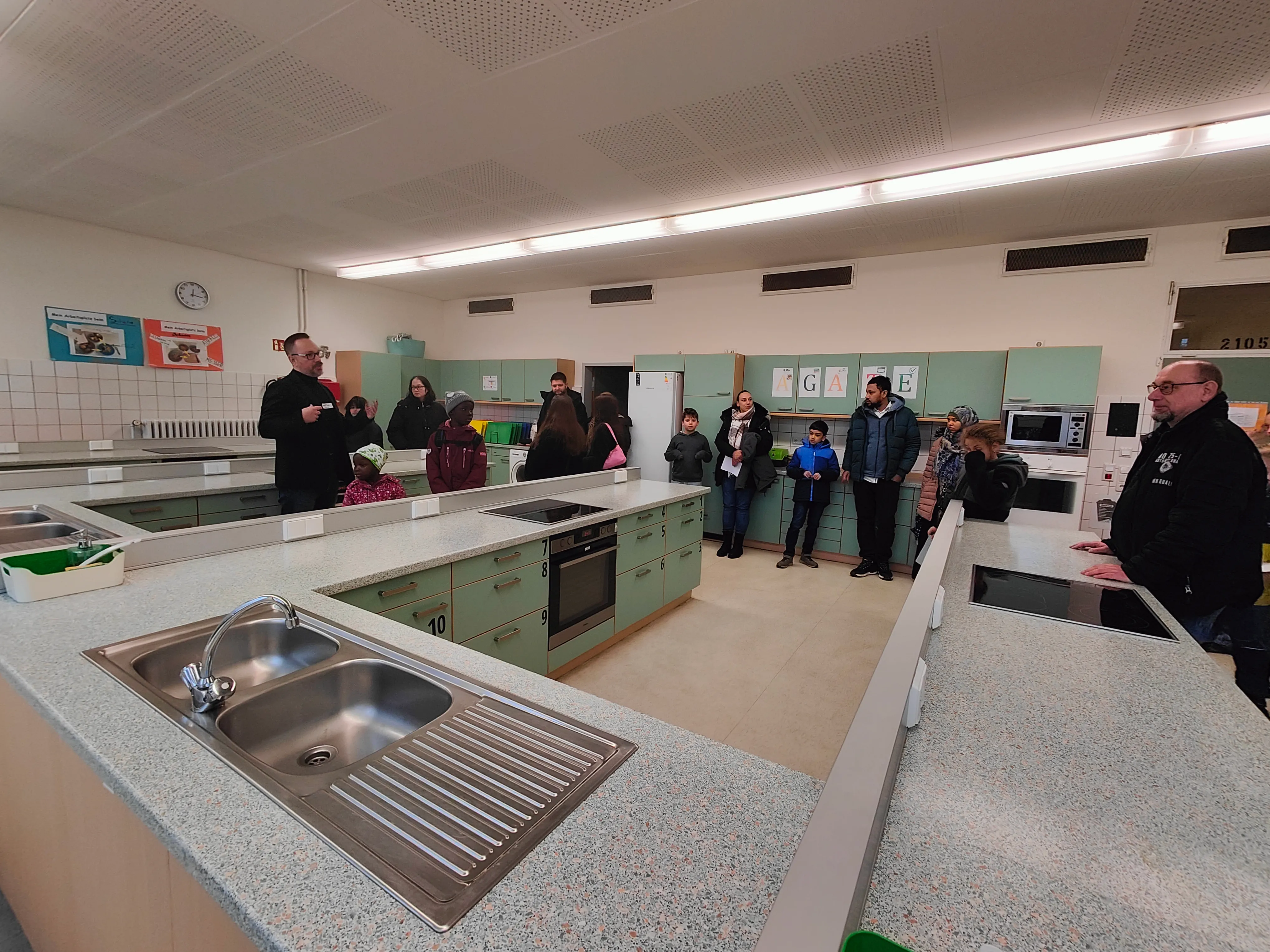 Im Anschluss gab es für alle Interessierten einen Rundgang durch die Schule. Damit eine aktive Pause stattfinden kann, gibt es einen Raum mit Tischtennisplatten, Kickern und Airhockey. Einen Puck, Ball oder Tischtennisschläger bekommen die Schüler im Tausch für ein kleines Pfand, welches zum Ende der Pause wieder zurückgegeben wird.