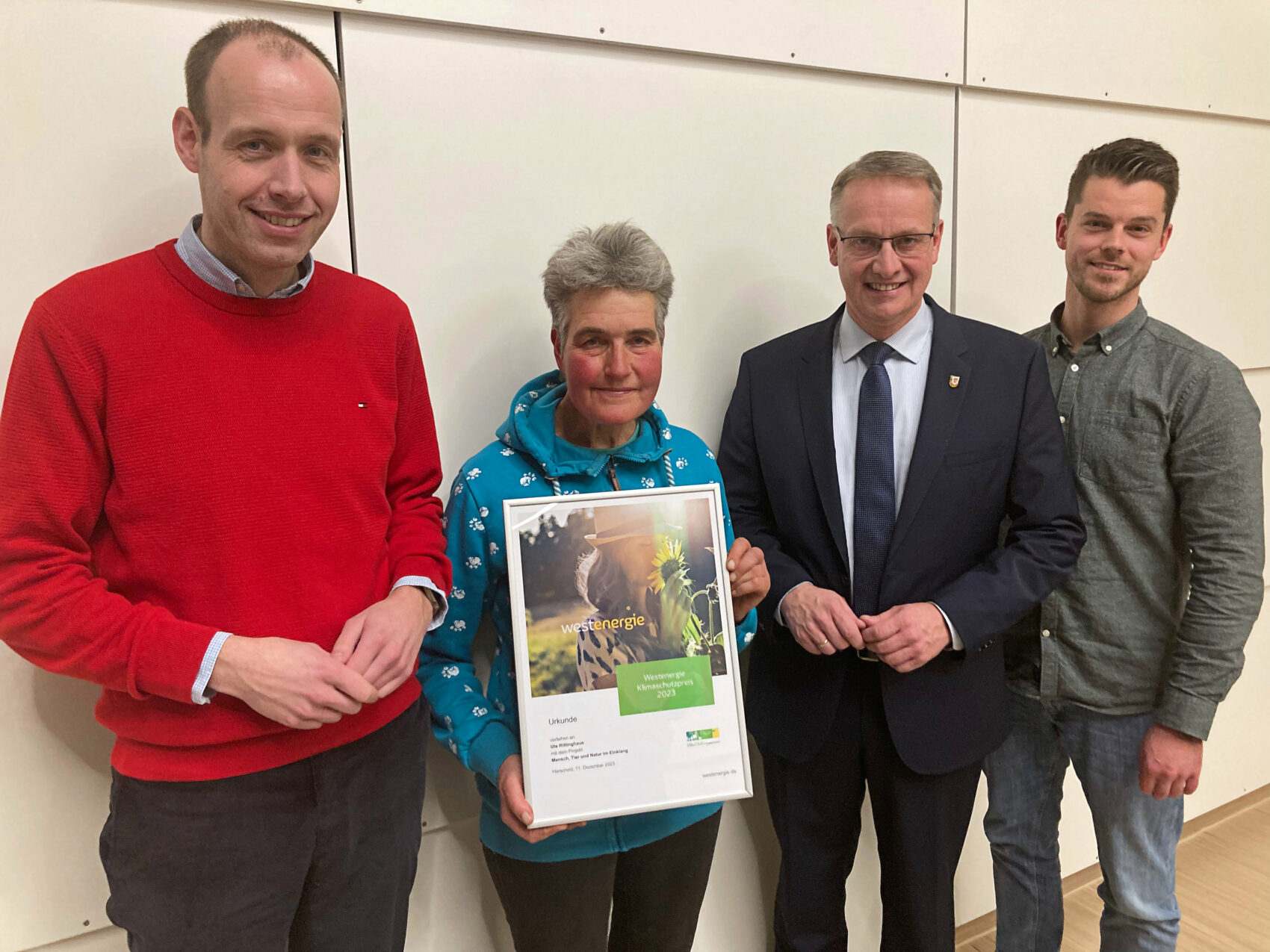 Während die Prämien für den Heimatpreis vom Land NRW zur Verfügung gestellt werden, sponsert der Energieversorger Westenergie den Klimaschutzpreis. 1000 Euro gehen diesmal an Ute Rittinghaus und ihren Gnadenhof Hervel. „Hier leben Mensch, Tier und Natur im Einklang“, würdigte Klimaschutzmanager Simon Mai den Hof, der von Ute Rittinghaus naturbelassen bewirtschaftet werde.