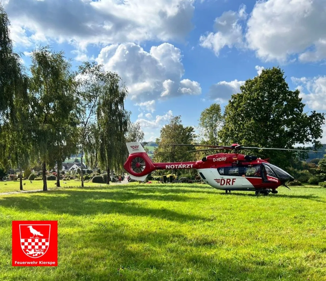 Bei einem häuslichen Unfall erlitt ein Kind am Sonntag, 28. September, Verbrennungen und musste mit dem Rettungshubschrauber in eine Spezialklinik geflogen werden. Die Wiese oberhalb des Friedhofs diente als Landeplatz und wurde von der Feuerwehr Kierspe abgesichert.