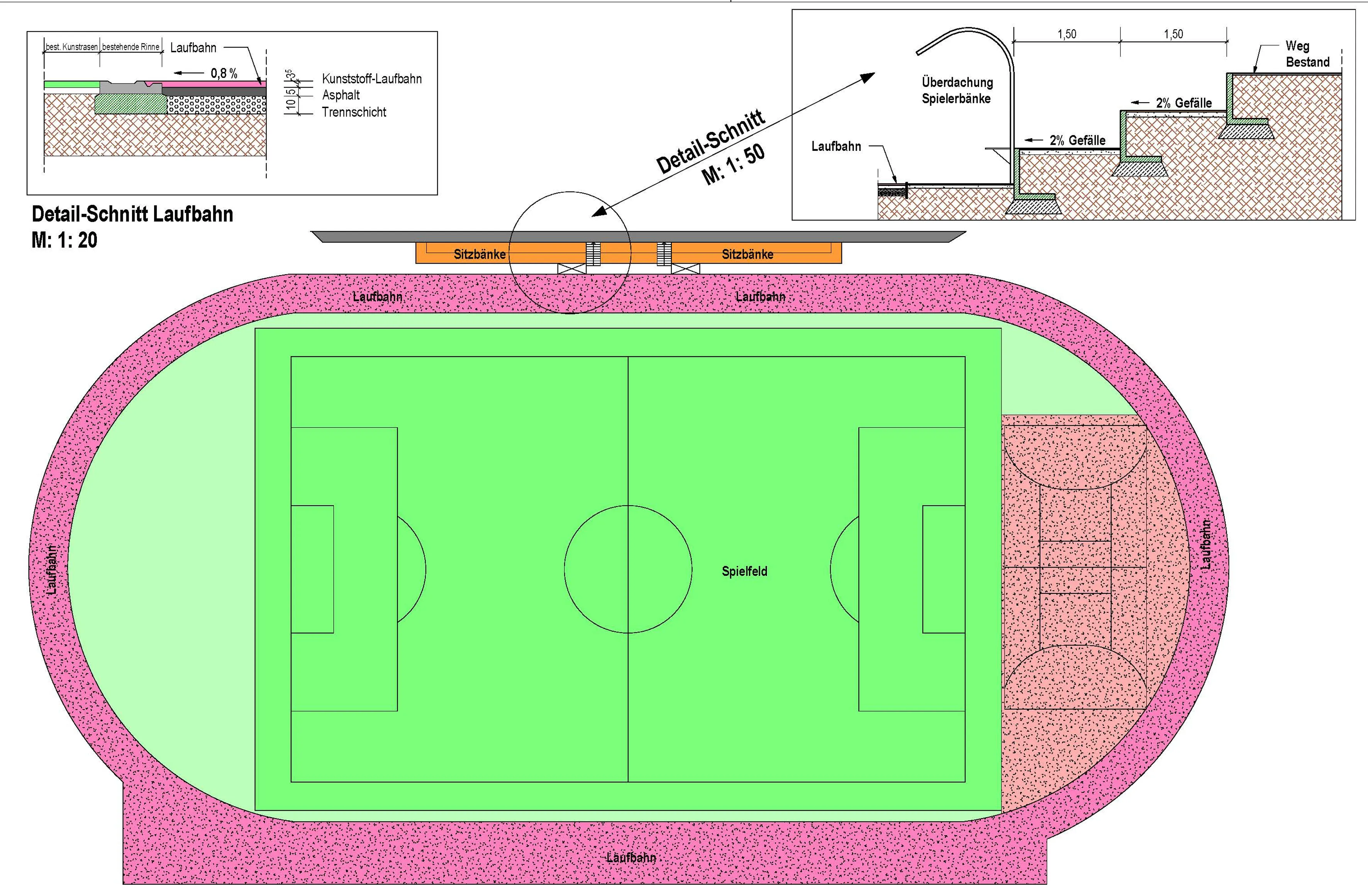 Die alte Flutlichtanlage wurde bereits ausgetauscht. Die jetzige Laufbahn sei über 40 Jahre alt und sanierungsbedürftig. Sie entspreche schon seit längerer Zeit nicht mehr den Anforderungen für die Durchführung von leichtathletischen Wettbewerben. Die dringende Erneuerung der Laufbahn solle durch einen Kunststoffbelag geschehen.
