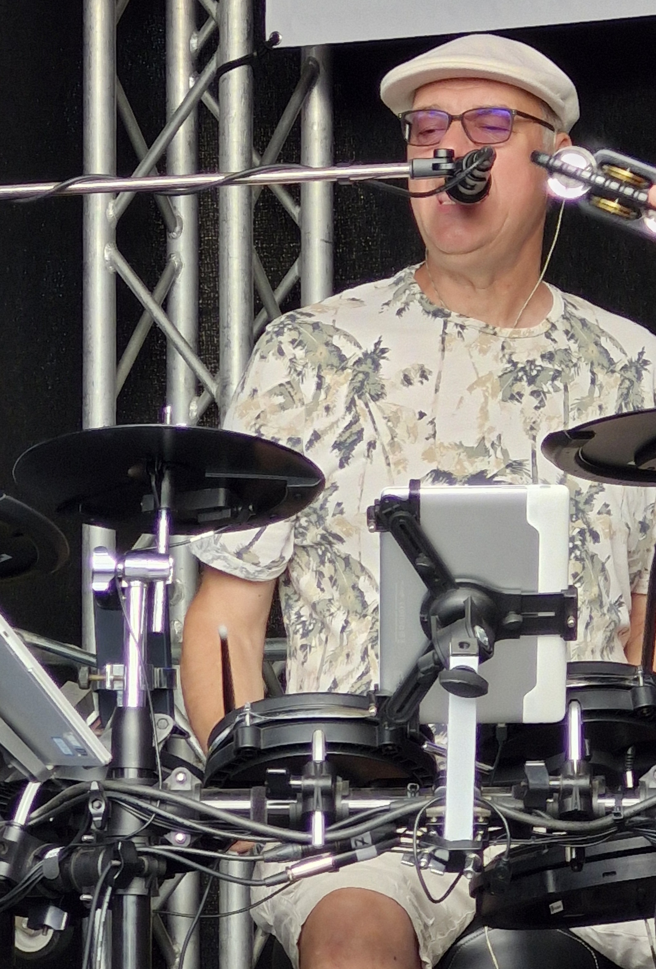 Für die "Hitsköpfe" war es das zweite Mal, dass sie beim Musik-Treff auftraten. Während sie am Mittwoch, 25. Juni, im prallen Sonnenlicht schwitzten und mit roten Gesichtern ihrem mehrdeutigen Bandnamen Ehre machten, war ihr Auftritt im vergangenen Jahr ein Wasserkonzert. Das berichtete Christine Thiel, Leadsängerin und Managerin der Band: "Es hat in Strömen geregnet." Eigentlich wollte man damals den Auftritt verkürzen. "Aber es waren 15 Zuschauer da, die haben unter Pavillons und im Regen getanzt." Es sei eine tolle Stimmung gewesen, bestätigten Tim und Charlie, Zuschauer von damals und immer noch begeistert.