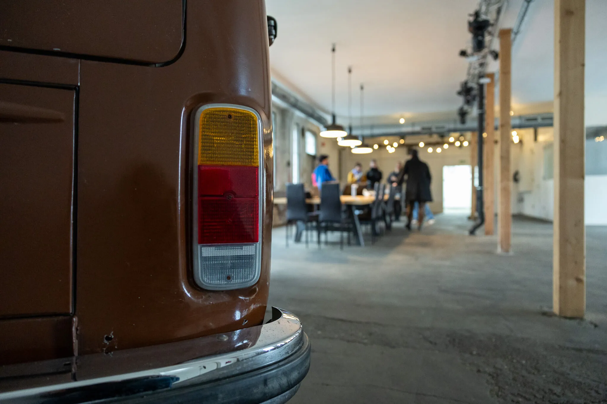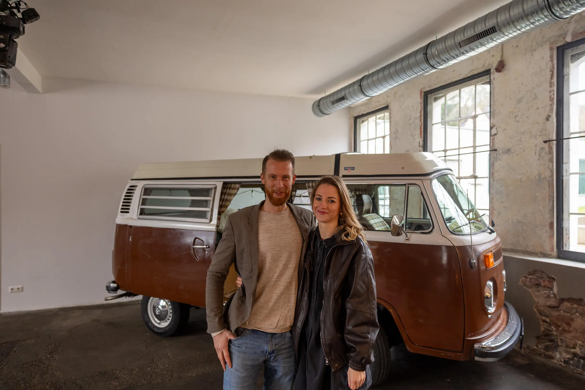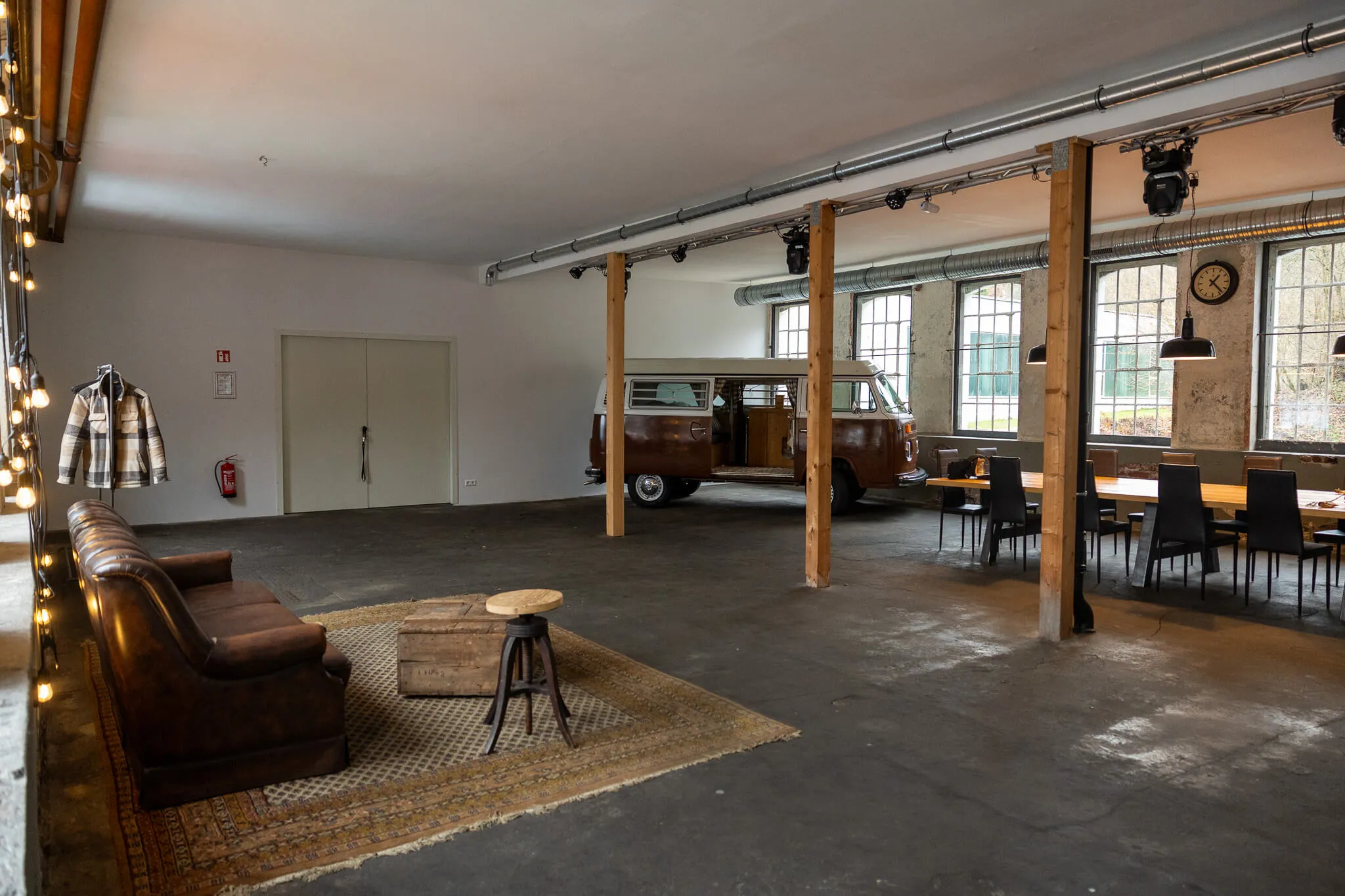 Gesagt, getan: Bereits seit 2022 habe das Ehepaar nun "viel Zeit, Geld und Herzblut", wie Gion Patz betont, in das Projekt investiert. So blieben die Fenster der ehemaligen Schraubenfabrik zwar erhalten, wurden aber komplett neu isoliert, die Toiletten barrierefrei umgebaut und eine Lüftungsanlage installiert. Knapp drei Jahre später — und nach Überwindung zahlreicher bürokratischer Hürden — kann die Location nun ab sofort gebucht werden. Und nicht nur das: Auch der braune VW T2 Camper "Giulio" des Ehepaares steht für Shootings und Events zur Verfügung, genauso wie eine alte Vespa.