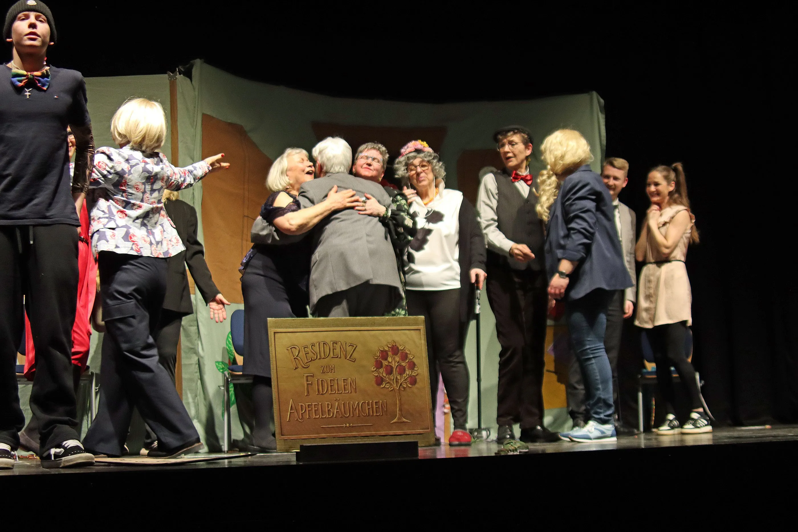 Als der pflegerische Notstand droht, stehen alle zusammen, versuchen durch eine Fete Geld für den Förderverein zu generieren. Lebensweisheiten wie „Wenn wir wollen, dass es den Alten gut geht, müssen wir uns selbst kümmern“ oder „Es gibt nichts Gutes, außer man tut es“ werden zu Handlungsanleitungen, das Schicksal selbst in die Hand zu nehmen. Mit Line-Dance-Auftritt, Erzählcafé, Repair-Station, Musical-Songs bringen sich alle ein, ziehen Alt und Jung an einem Strang, um die Lage zu verbessern. So wird in 150 Minuten aus der Einrichtung „Zur letzten Oase“ die „Residenz zum fidelen Apfelbaum“ getreu dem lutherschen Motto, nicht zu verzagen, selbst aktiv zu werden, die Hoffnung nicht aufzugeben.