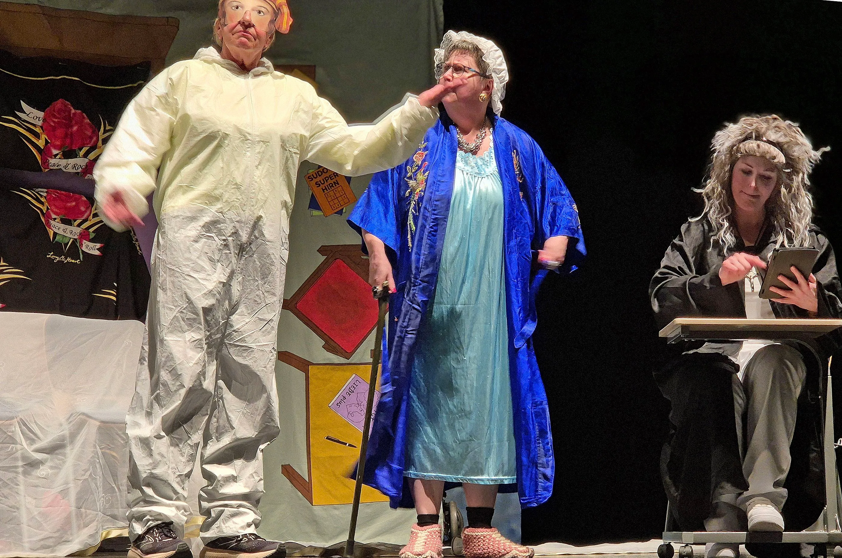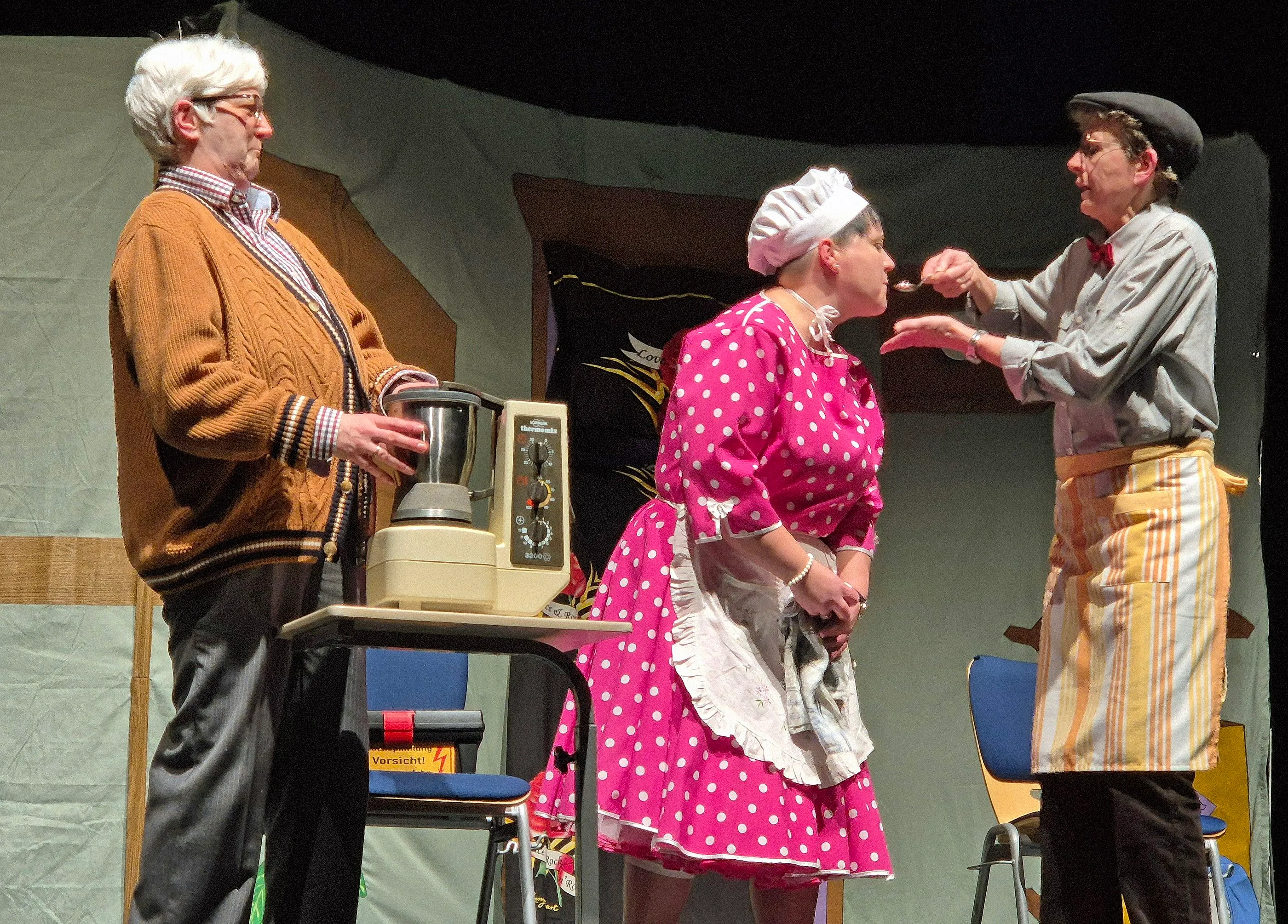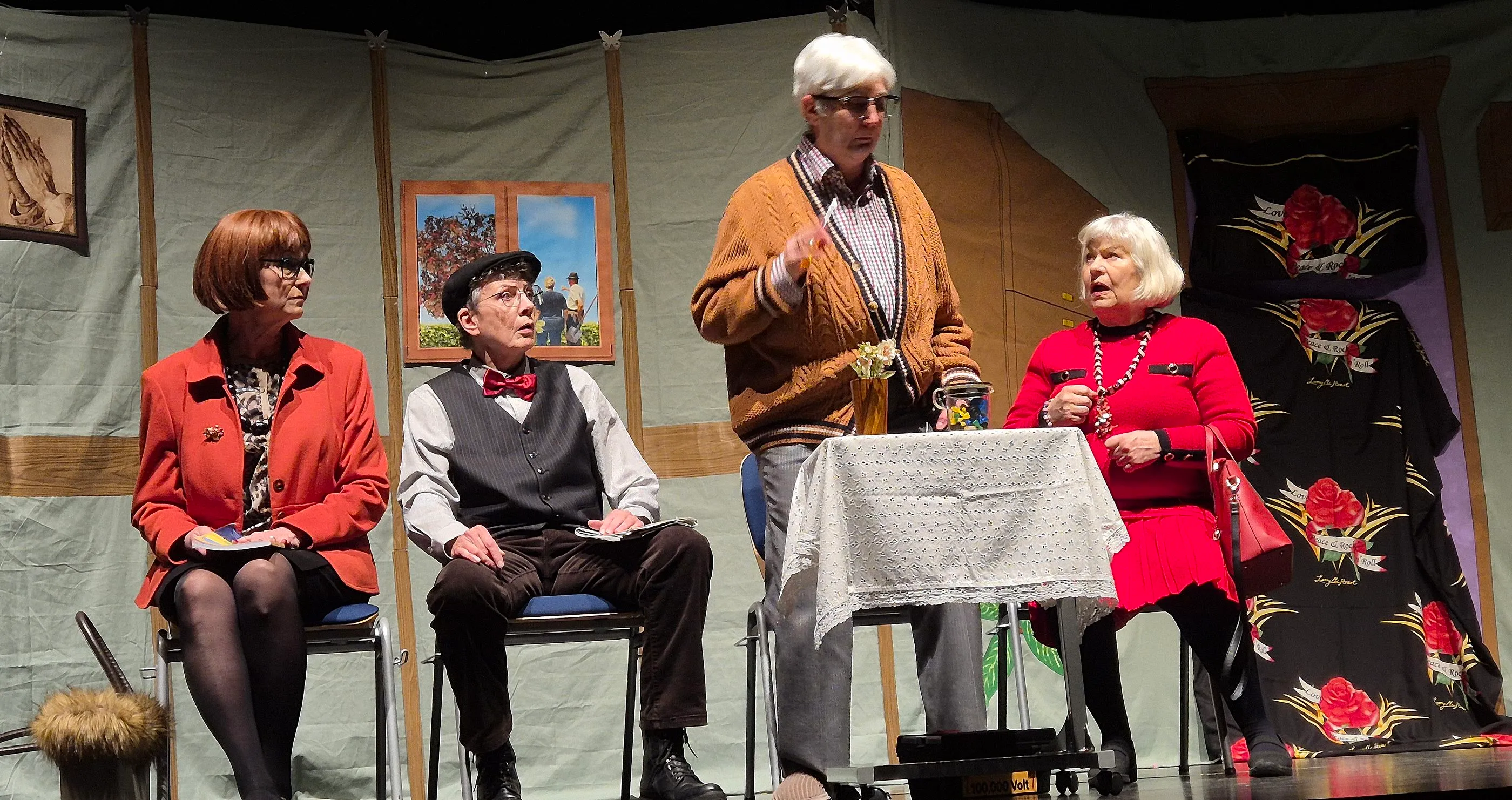 Da passt es, dass der „Zivi“ Gebisse eingesammelt, aber vergessen hat, die Besitzer zu kennzeichnen. Die wohl skurrilste Szene: die Bewohner tauschen auf offener Bühne reihum die Gebisse, bis alle wieder auf den eigenen Zähnen kauten. Die „etwas prätentiöse“ Tante der neuen Heimleiterin, die meinte als „Freifrau von Ahrensburg, geschiedene von Großstetten-Habach, verwitwete Valenthern, geborene Kornelius“ „was Besseres“ zu sein, setzt sich in Szene, wird aber von den Bewohnern generös eingenordet. Denn: „Jeder verdient eine zweite Chance.“ Und mit Hilfe des TV-Formats „Bitte melde dich!“ findet Bastler Manfred nach Jahrzehnten seine Tochter wieder.