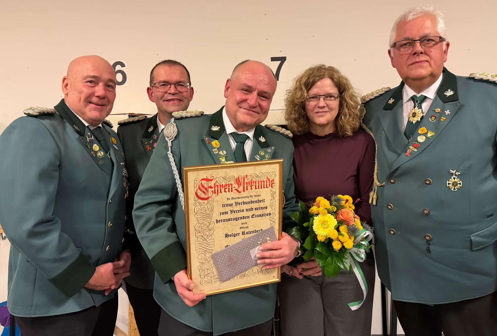 Es war gleich in mehrfacher Hinsicht eine besondere Jahreshauptversammlung für die Schützen aus Hülscheid. Mit Standing Ovations, der ein oder anderen Träne und mit vielen Geschenken schied Holger Rutenbeck nach 18 Jahren als Vorsitzender aus dem Vorstand aus. Fortan, so haben es sich seine Vorstandskollegen überlegt, trägt er neben Wilfried Patermann den Titel "Ehrenvorsitzender".