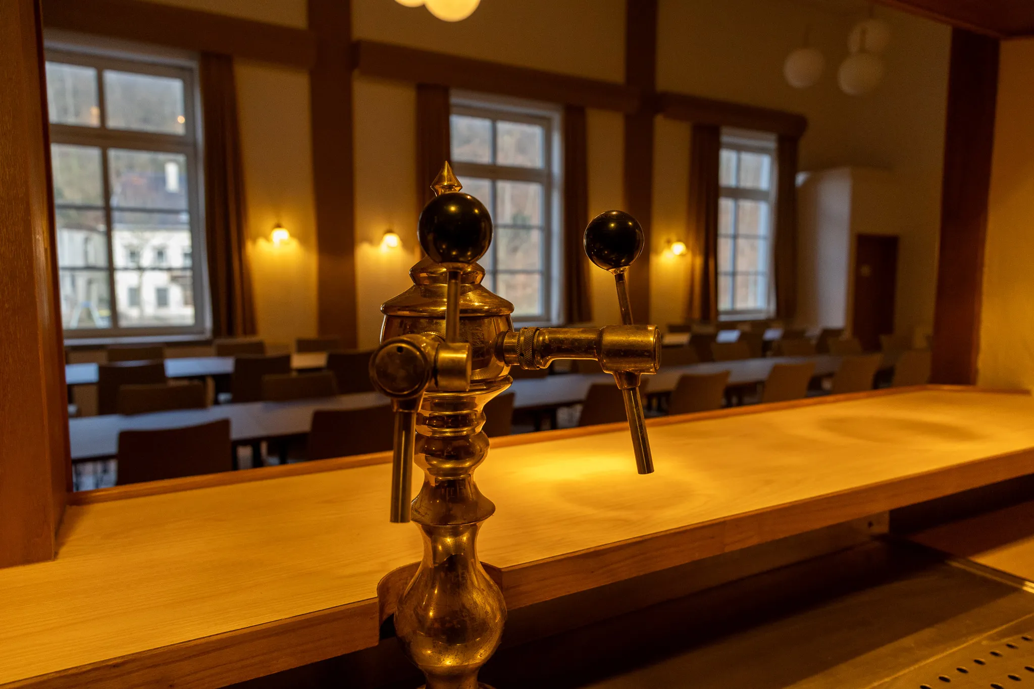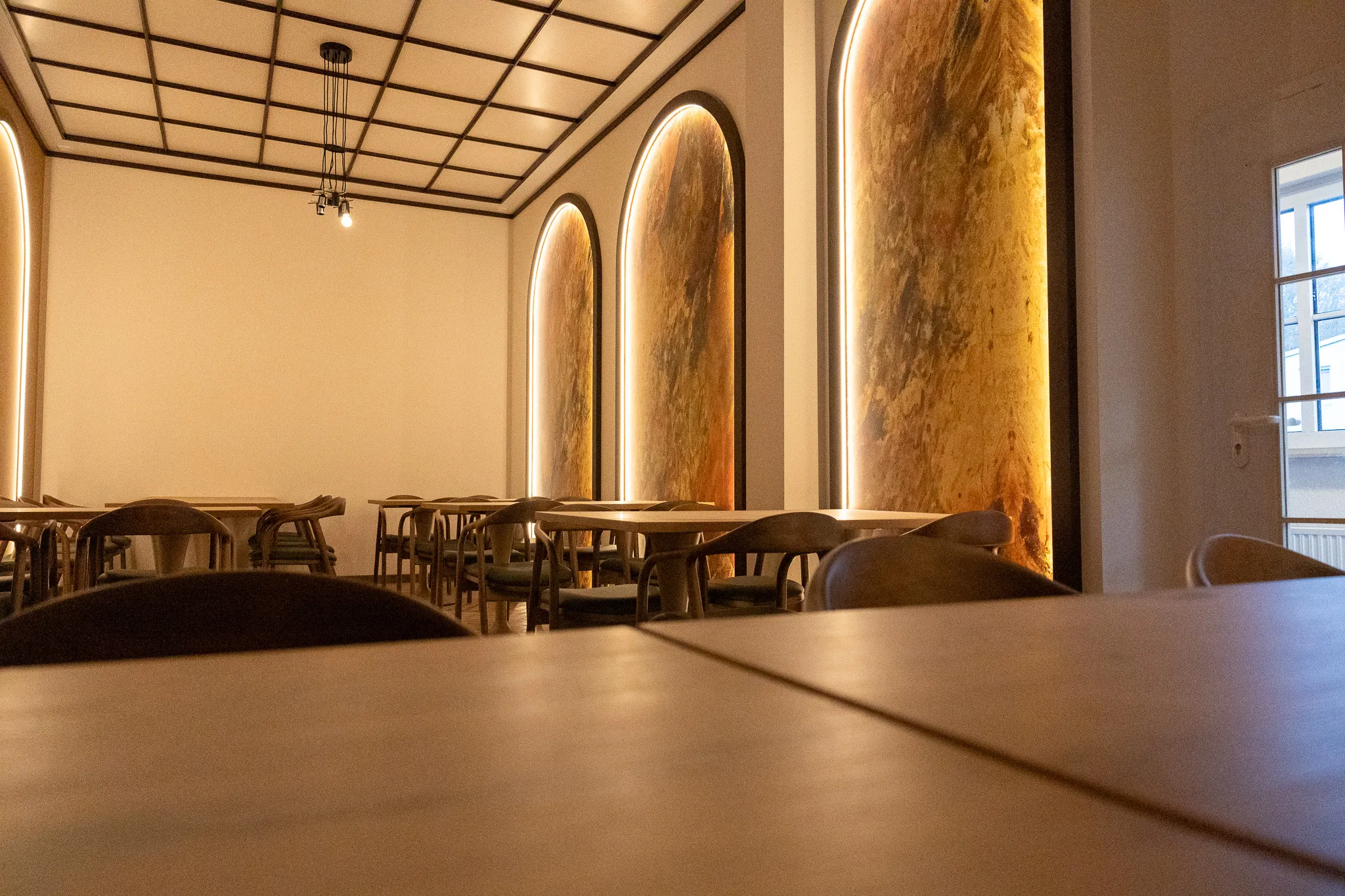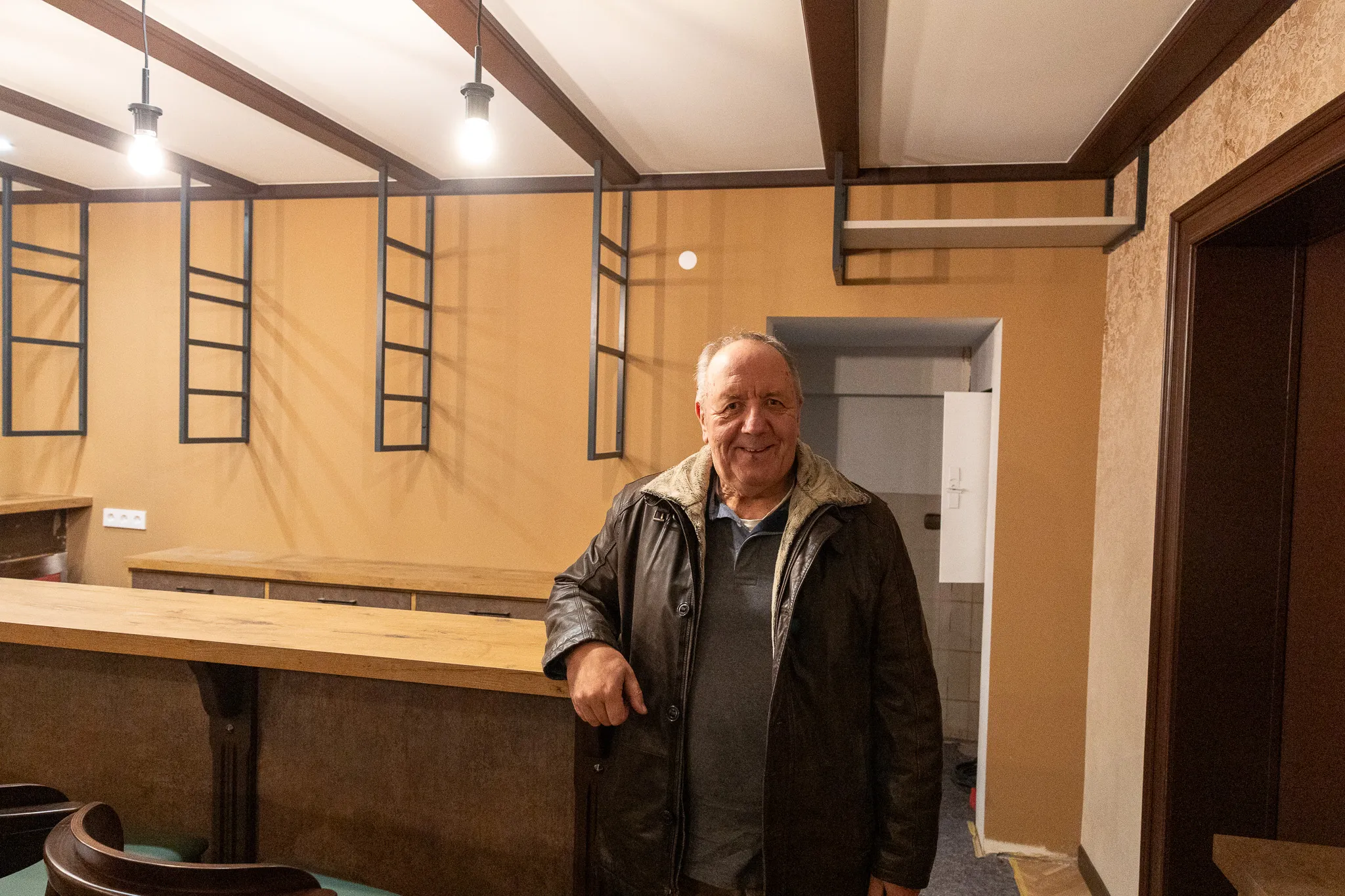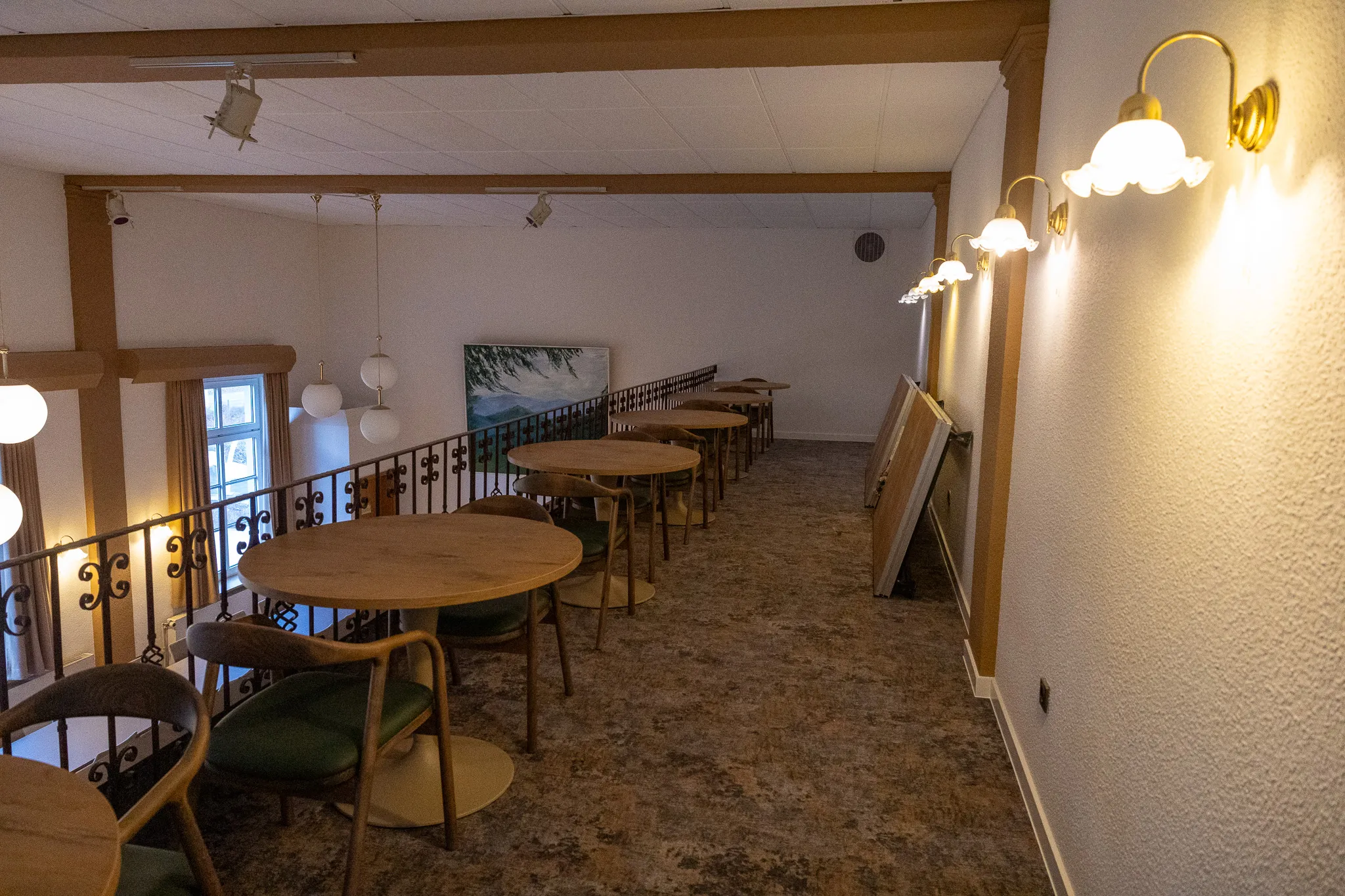 Auch der Saal wurde mittlerweile aufgehübscht — wo sich im Oktober noch Farbe, Pinsel und Werkzeug stapelten, sind jetzt frisch gestrichene Wände, aufgearbeitete Möbel und neue Stühle zu finden. Das Mobiliar findet sich übrigens identisch auch im Erdgeschoss wieder, um "eine einheitliche Linie durchzuziehen", wie Fath betont.