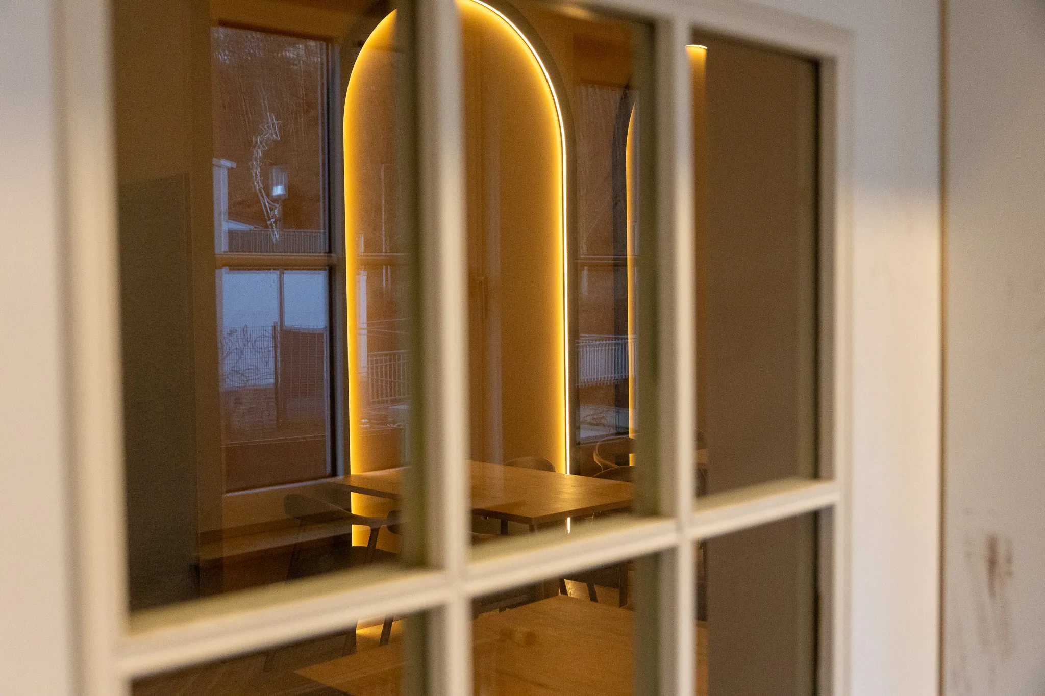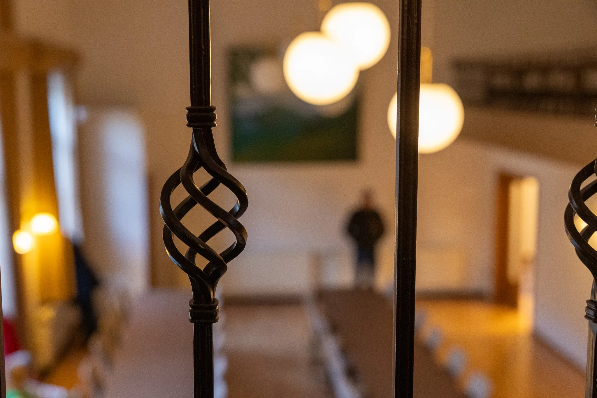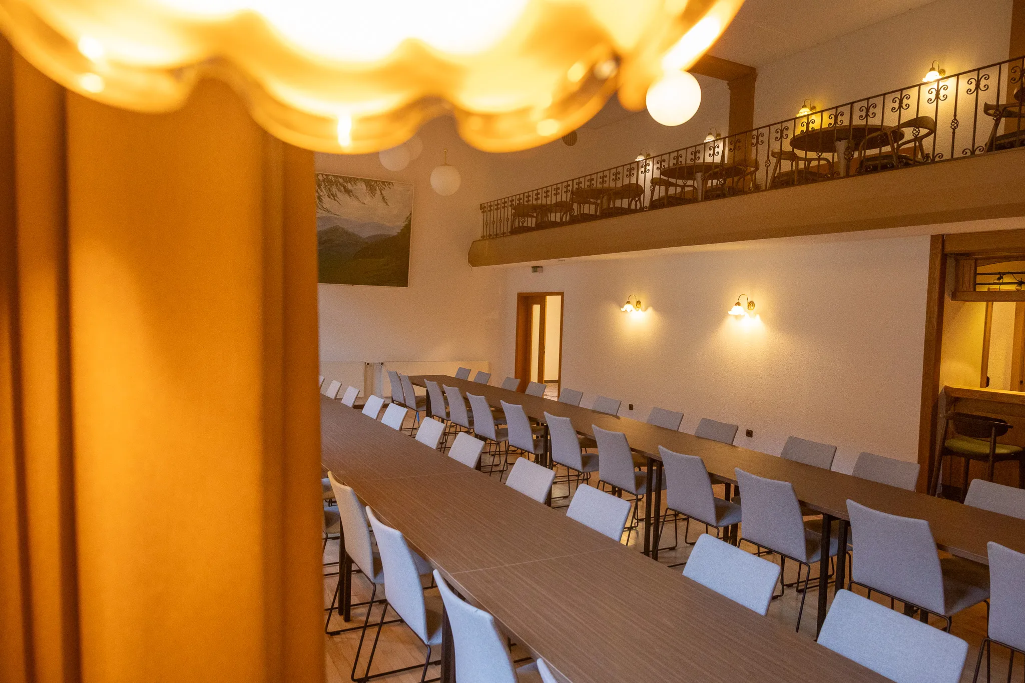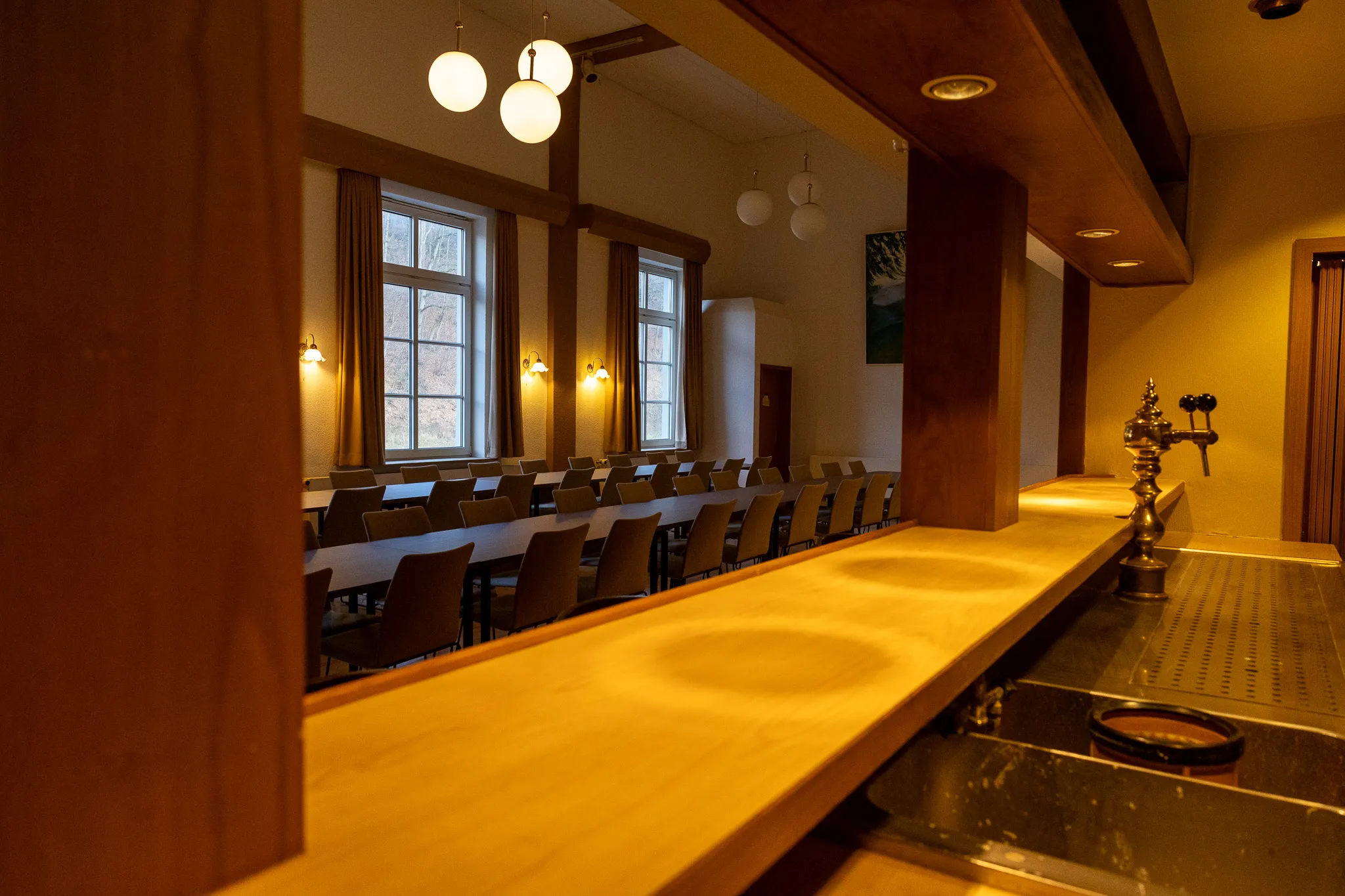 Auch der Saal wurde mittlerweile aufgehübscht — wo sich im Oktober noch Farbe, Pinsel und Werkzeug stapelten, sind jetzt frisch gestrichene Wände, aufgearbeitete Möbel und neue Stühle zu finden. Das Mobiliar findet sich übrigens identisch auch im Erdgeschoss wieder, um "eine einheitliche Linie durchzuziehen", wie Fath betont.