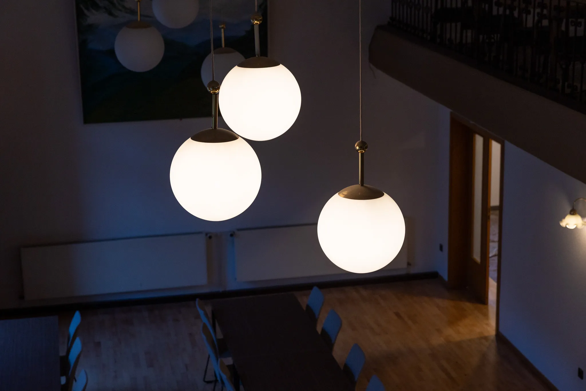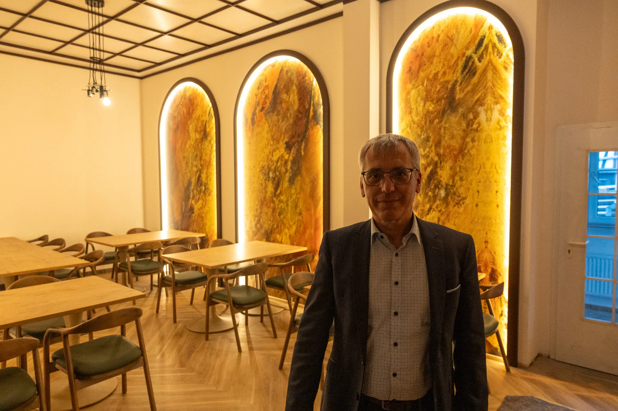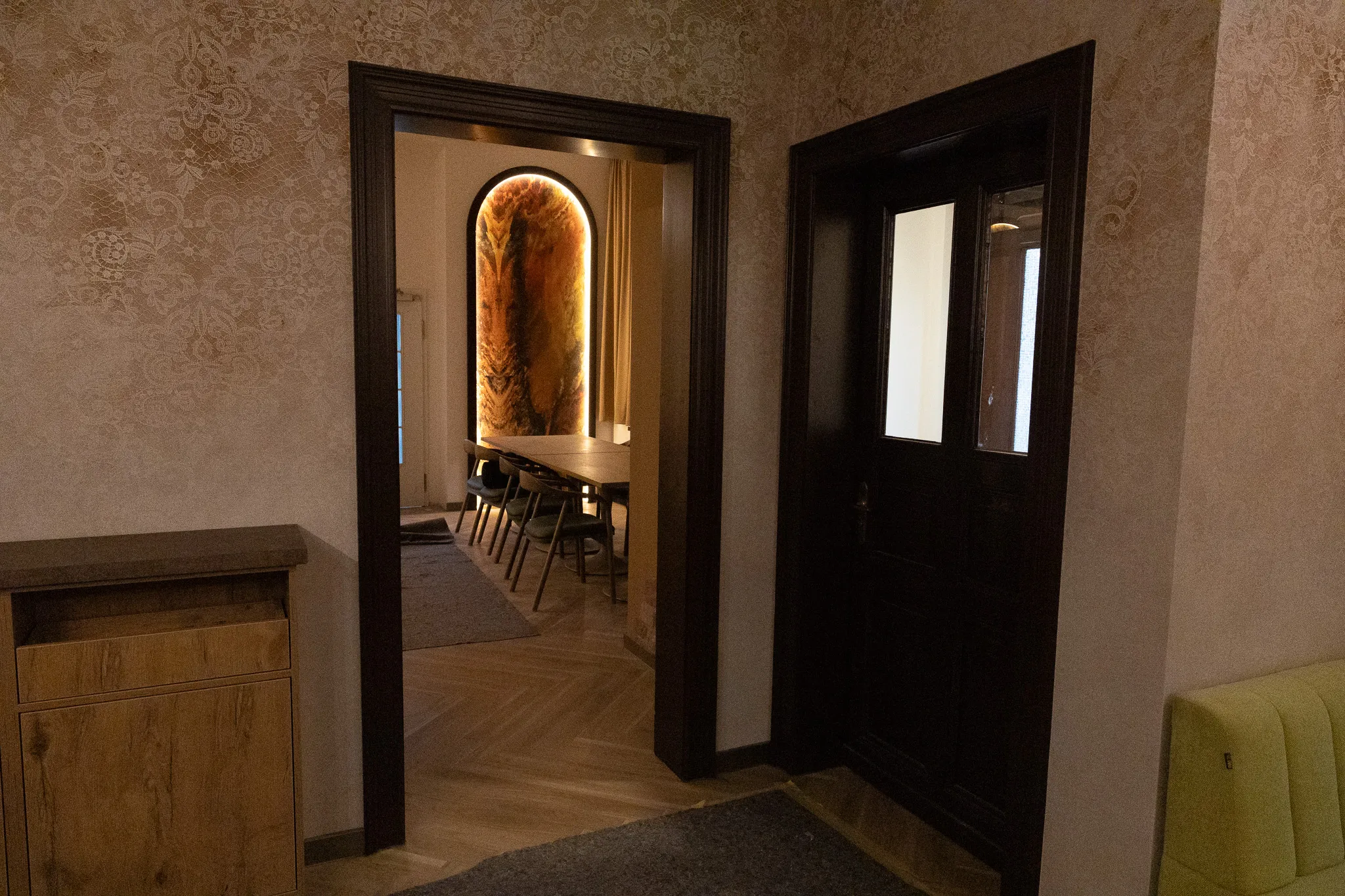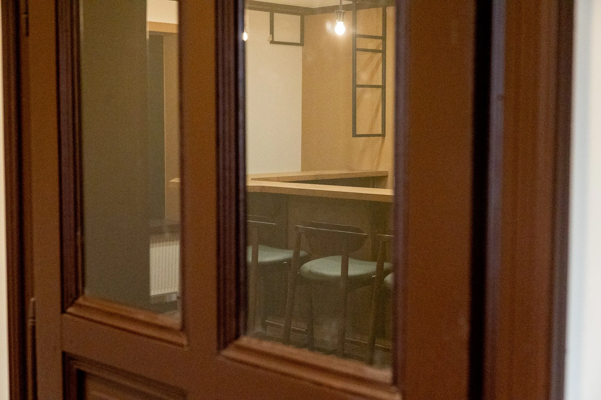 Auch der Saal wurde mittlerweile aufgehübscht — wo sich im Oktober noch Farbe, Pinsel und Werkzeug stapelten, sind jetzt frisch gestrichene Wände, aufgearbeitete Möbel und neue Stühle zu finden. Das Mobiliar findet sich übrigens identisch auch im Erdgeschoss wieder, um "eine einheitliche Linie durchzuziehen", wie Fath betont.