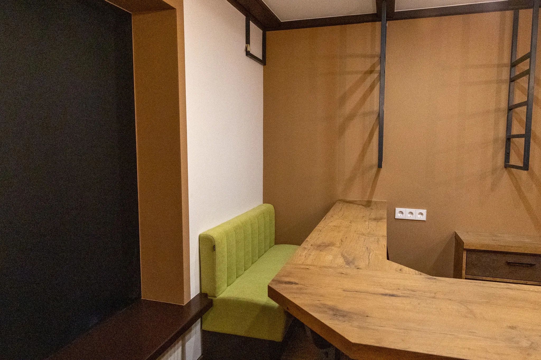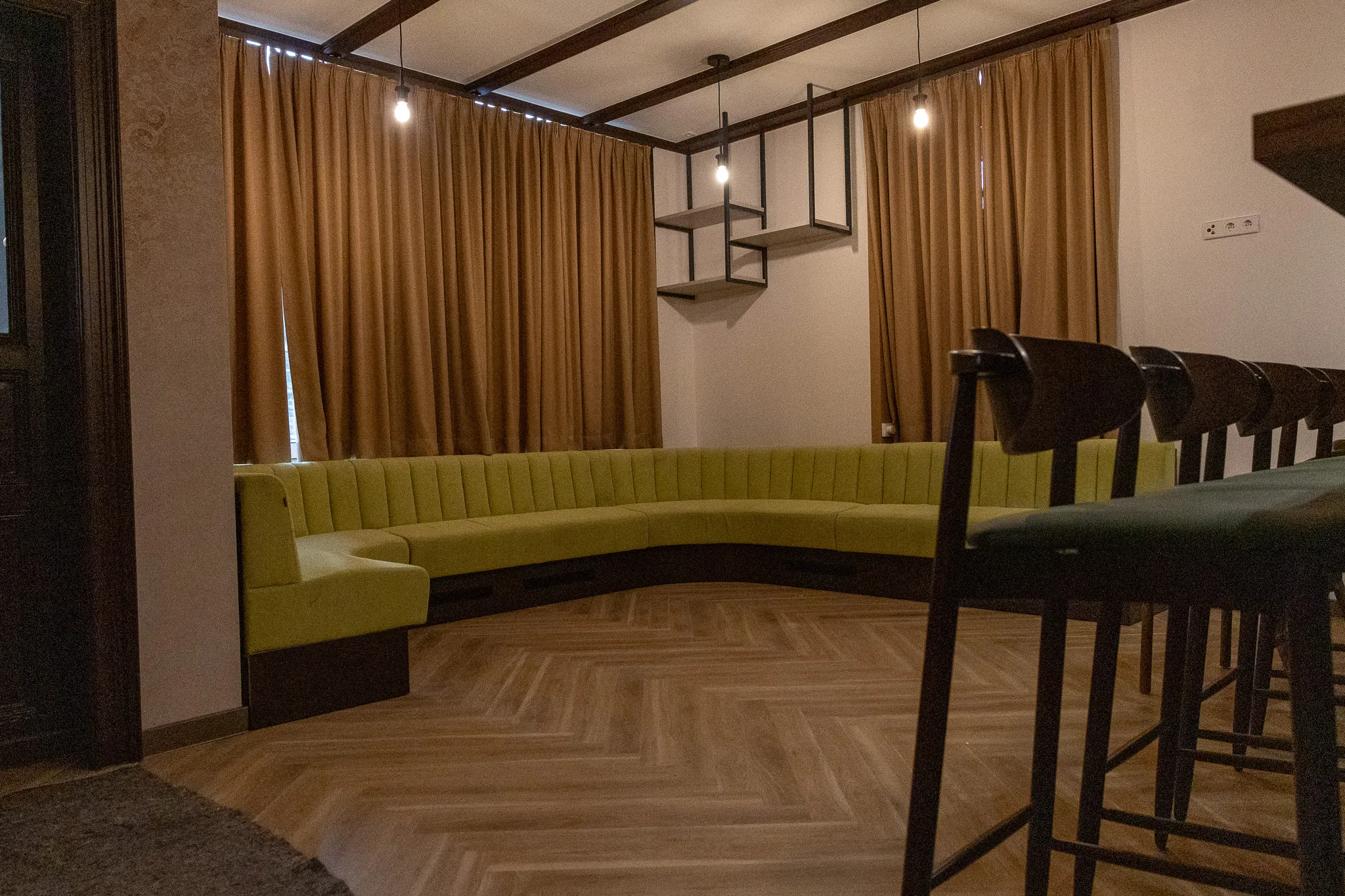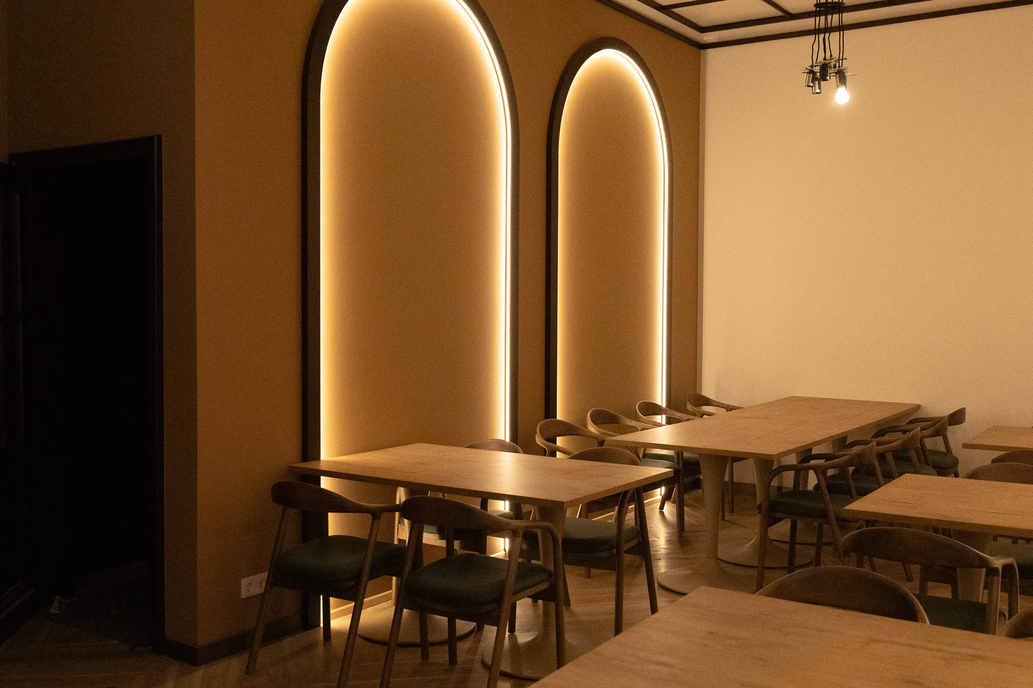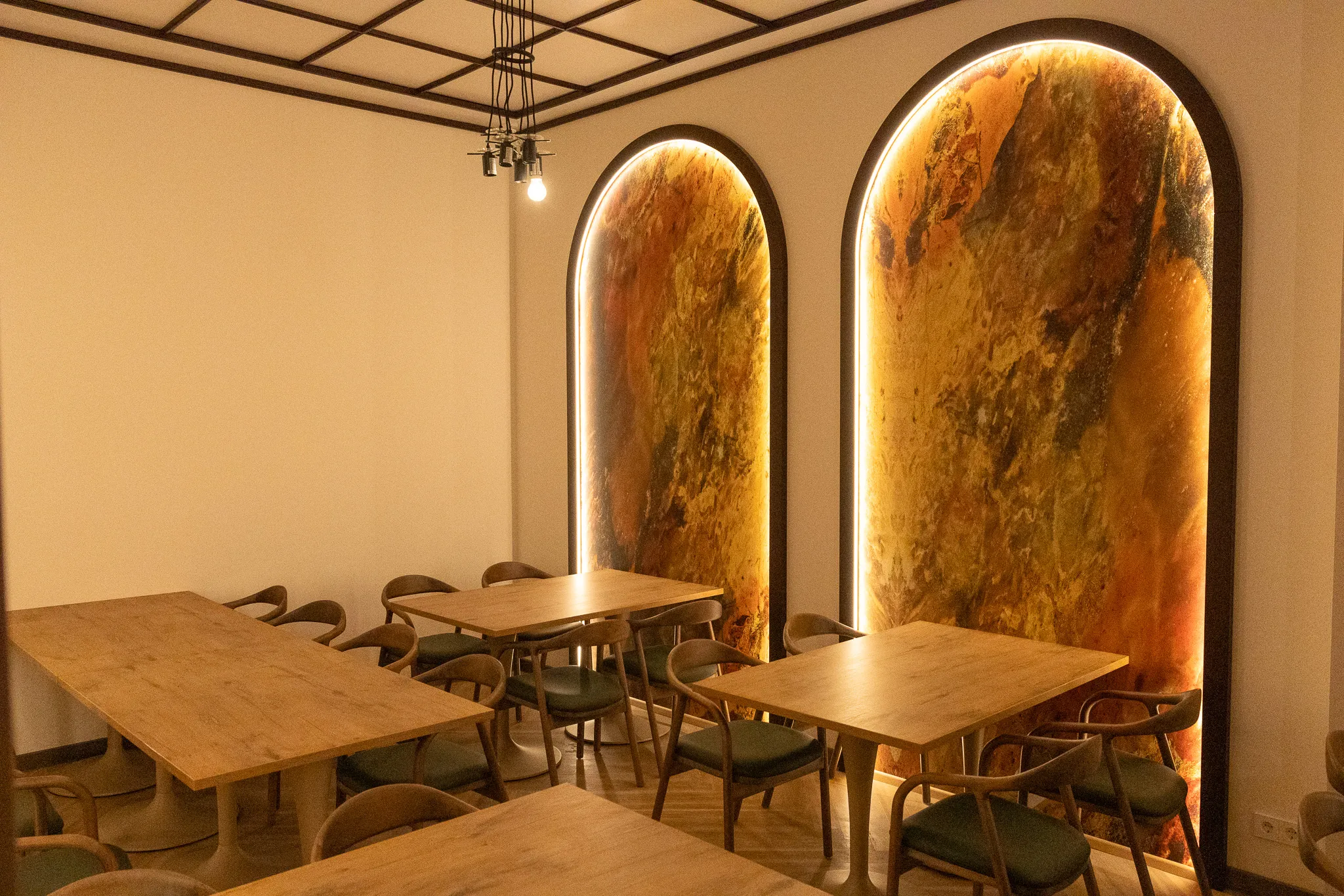 Auch der Saal wurde mittlerweile aufgehübscht — wo sich im Oktober noch Farbe, Pinsel und Werkzeug stapelten, sind jetzt frisch gestrichene Wände, aufgearbeitete Möbel und neue Stühle zu finden. Das Mobiliar findet sich übrigens identisch auch im Erdgeschoss wieder, um "eine einheitliche Linie durchzuziehen", wie Fath betont.