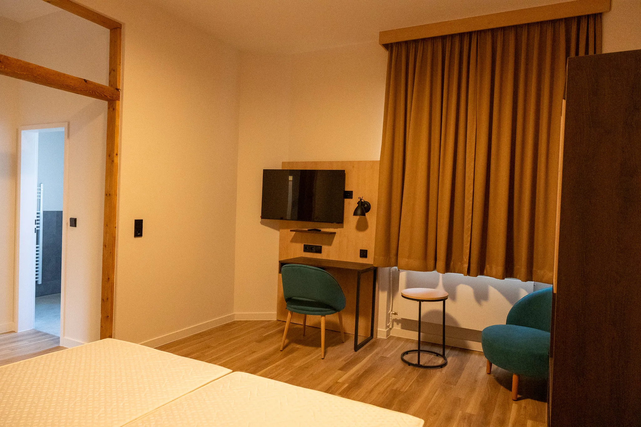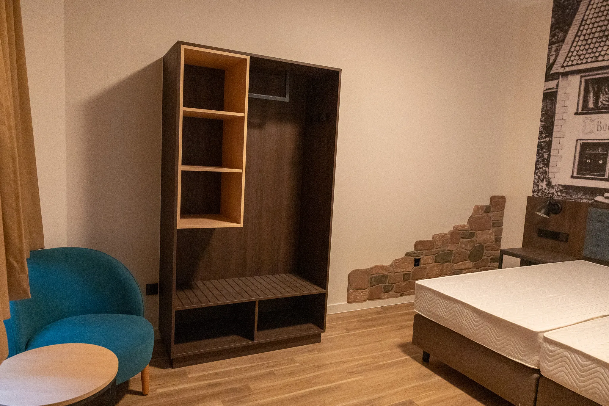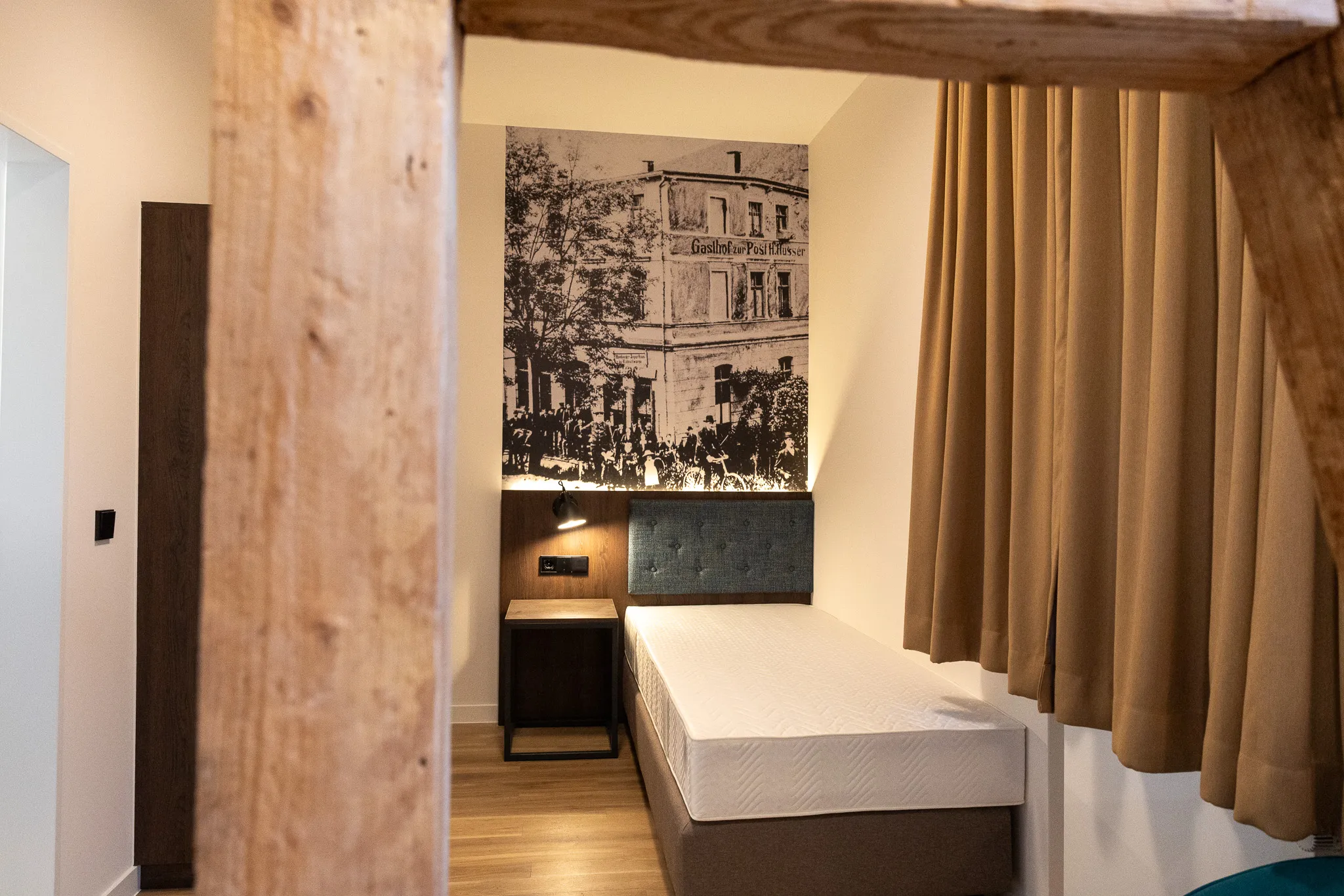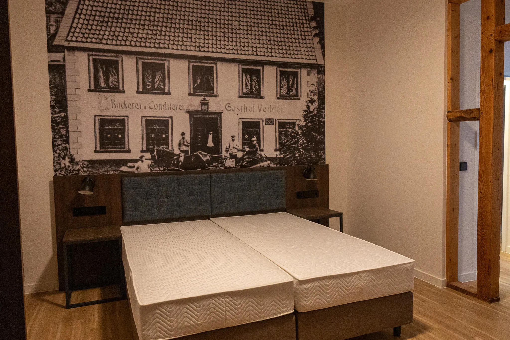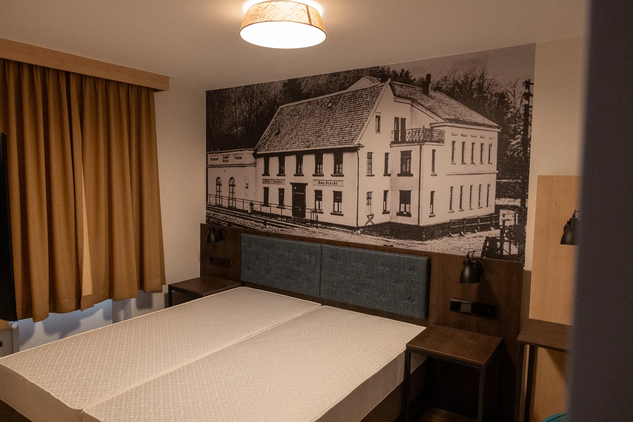 Besonders stolz ist Emmerichs auf die Gestaltung der mittlerweile komplett renovierten Zimmer: "Ich denke, dass allein das Design der Räume schon überzeugt", betont er. Besonderen Fokus habe man bei dem Projekt auf den lokalen Bezug gelegt, wie er weiter erklärt. Deshalb sind nun über allen Betten alte Fotos von Hotels und Restaurants aus verschiedenen Ortsteilen der Volmegemeinde zu sehen. Reproduziert und auf Fototapete gebracht wurden diese von der Fotografin des Planungsbüros, wie Lennart Fath von Managed by Mutschler ergänzt.