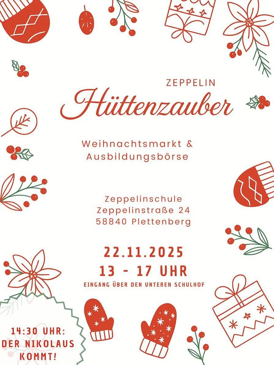 Die Zeppelinhauptschule lädt für Samstag, 22. November, von 13 bis 17 Uhr zum Zeppelin-Hüttenzauber ein. Die Veranstaltung verbindet Weihnachtsmarktstimmung mit einer Ausbildungsbörse. Die Besucher erwartet ein buntes Angebot mit Weihnachtsdeko, Kerzen und Holzarbeiten sowie Leckereien. Kinder können sich in der Turnhalle auf einer Hüpfburg austoben. Der Nikolaus wird ab 14.30 Uhr erwartet.