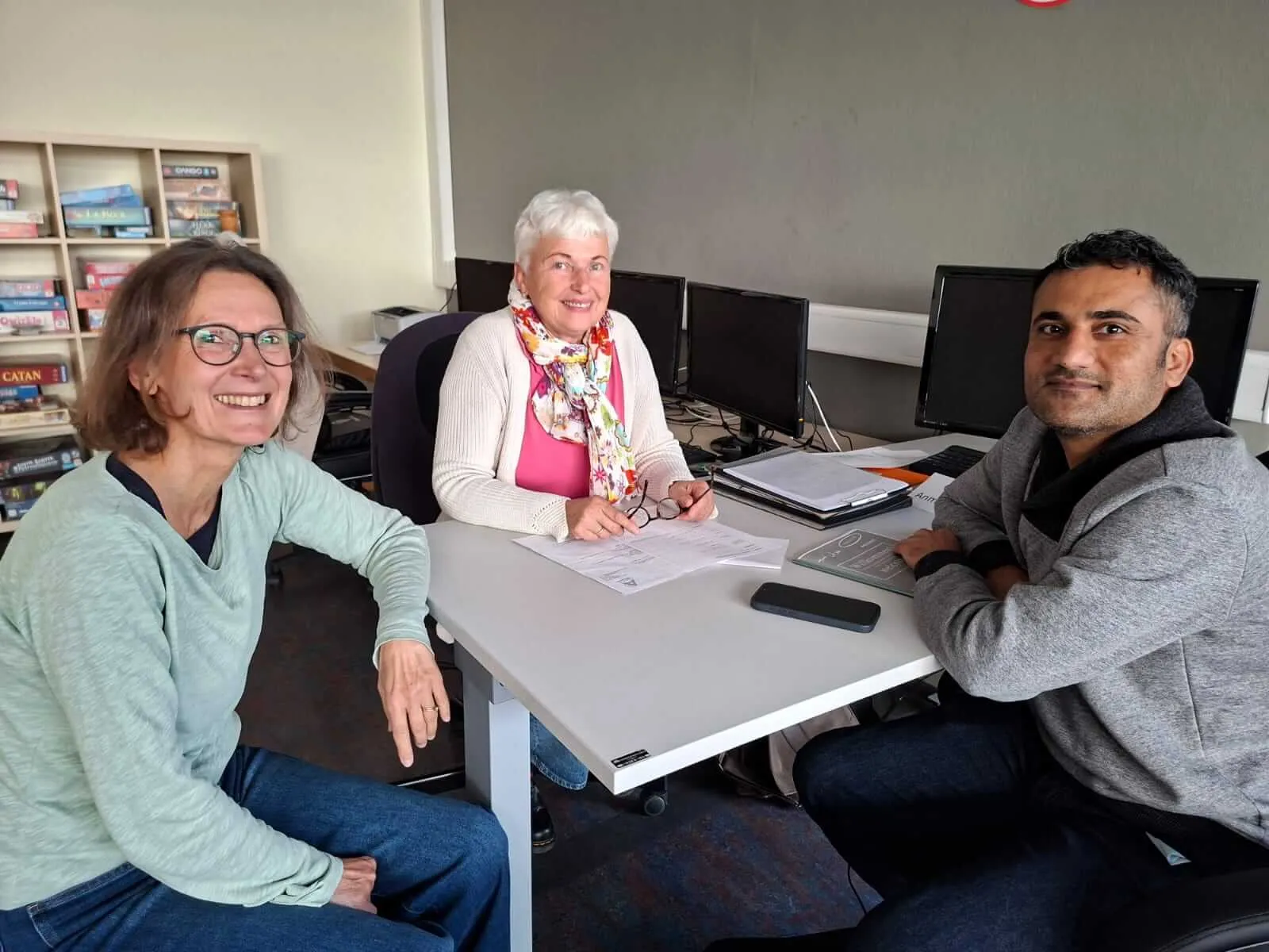 Während sie sich noch mit Aga Quadis unterhält, der vor fünf Jahren aus dem Irak nach Halver kam, bespricht Barbara Stoyke-Bischofs mit Waqas, einem Neuankömmling aus dem Irak, der dort Englische Literatur studiert hatte, die Möglichkeiten, einen Anfänger-Deutschkurs bei ihr zu besuchen und Inga Franke vom JobCenter beantwortet Fragen zu Anträgen zum Bürgergeld, zu Fördermitteln oder sie gibt Hilfestellung bei Themen rund um die Ausländerbehörde.