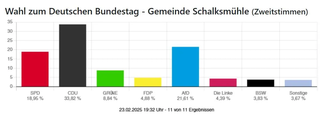 23. Februar: Bei der Bundestagswahl kann sich die CDU in der Gemeinde Schalksmühle mit 33,82 Prozent der Zweitstimmen als stärkste politische Kraft behaupten. Die AFD erreicht mit 21,61 Prozent den zweiten Platz. Insgesamt gaben 7.936 Schalksmühler ihre Stimme ab (Wahlbeteiligung = 85,87 %). Die SPD kommt auf 18,95 Prozent und bleibt somit hinter der AFD zurück. Die Grünen erreichen 8,84 Prozent der Stimmen, während die FDP mit 4,88 Prozent und die Linke mit 4,39 Prozent nur noch eine untergeordnete Rolle spielen. Ebenfalls im Ergebnis vertreten ist das Bündnis Sahra Wagenknecht (BSW), das mit 3,83 Prozent der Stimmen einen Achtungserfolg erzielte.