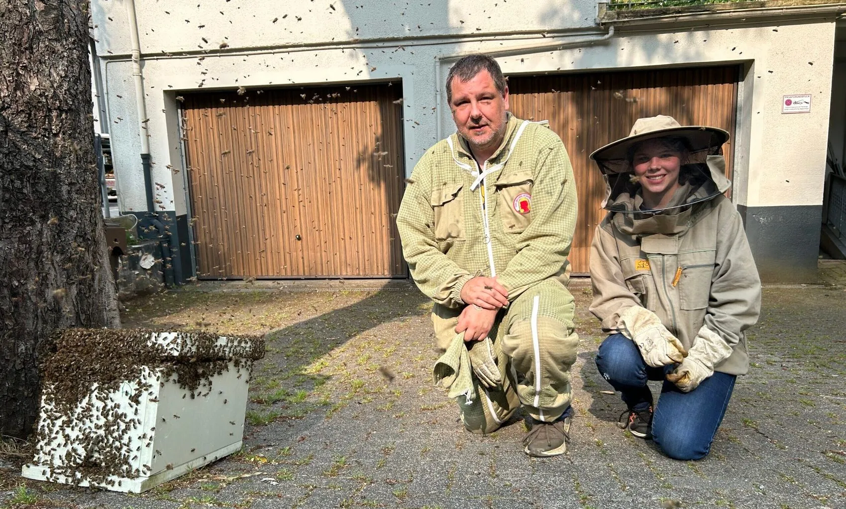 3. Juni: Ein Bienenvolk ist in der Volmegemeinde auf Abwegen. Als neuen Wohnort hatte es sich eine Kastanie in der Nähe der Sparkasse auserkoren — nicht die beste Wahl, weder für Mensch noch Tier. Also verständigte Fachbereichsleiterin Silvia Gonzalez Algaba den Imker Christian Conrad, der auch prompt anrückte, um die ausgebüxten Bienen wieder einzufangen. Im Gepäck: Eine von der Firma Windfuhr geliehene Hydraulikbühne und seine Tochter Franziska Conrad. In der Schwarmzeit kommt es immer wieder zu solchen Einsätzen.