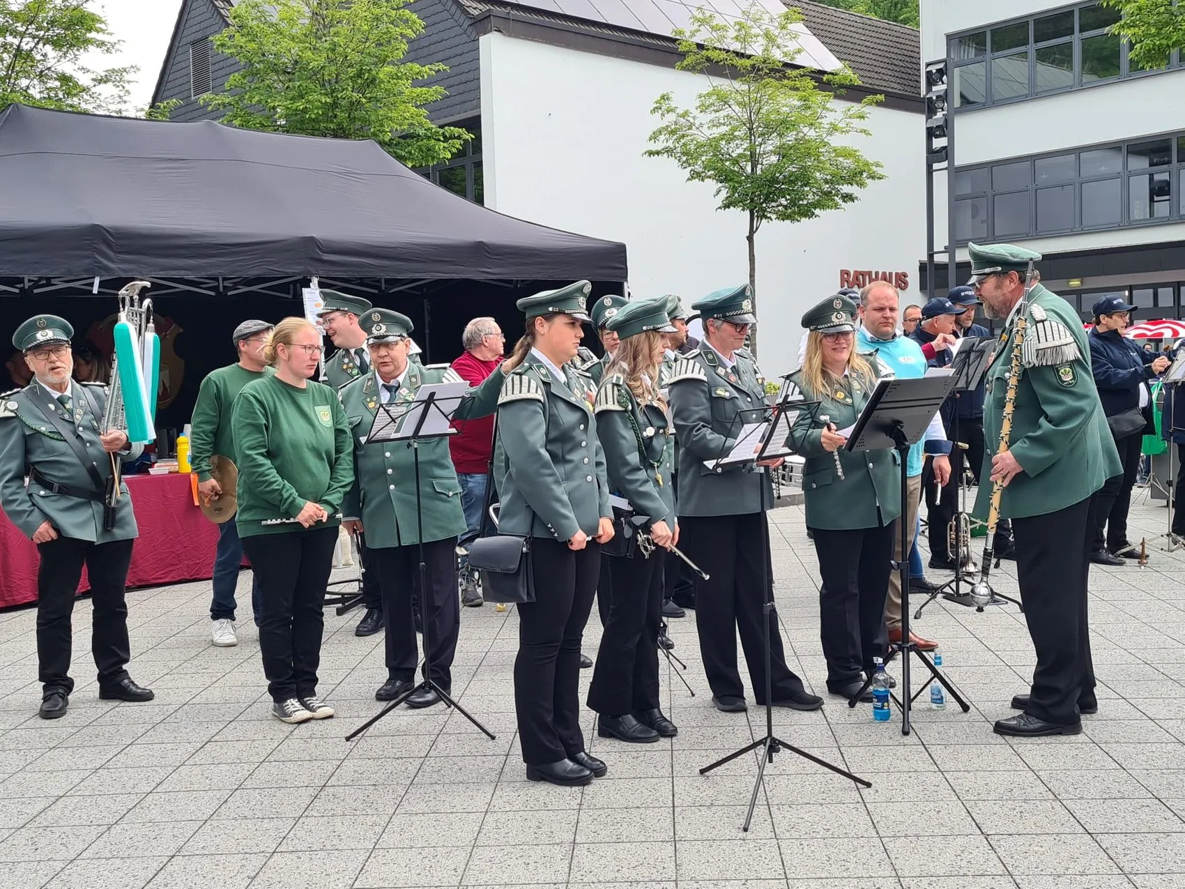 19. Mai: ,,Die Stimmung ist bombastisch“ freut sich Michael Pache, Moderator der Veranstaltung und Oberst beim Hülscheider Schützenverein. ,,Die Leute hören zu und singen mit — es ist einfach schön zu sehen“. Über 500 Besucher finden den Weg auf den Rathausplatz, um gemeinsam ein musikalisches Fest zu feiern.