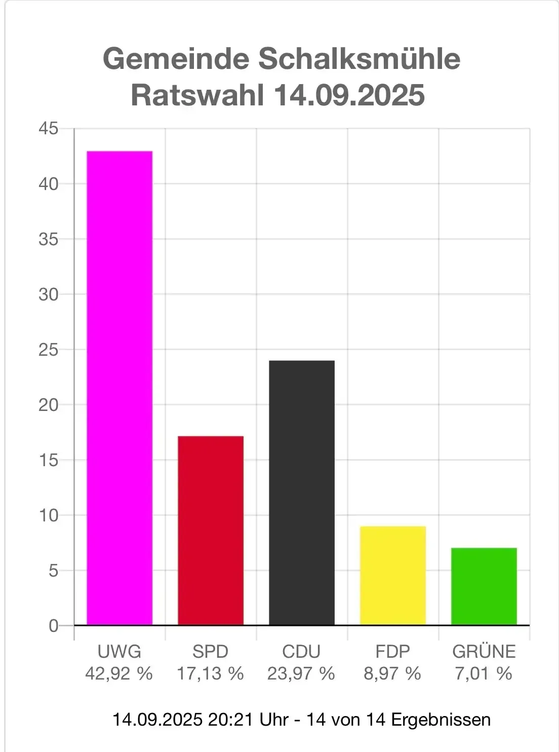 14. September: In Schalksmühle standen bei der Kommunalwahl gleich mehrere Entscheidungen an. Einen neuen Bürgermeister gibt es nach diesem Tag noch nicht. Für das Bürgermeisteramt ziehen Christian Breddermann (parteilos) und Roman Bossart (UWG) in die Stichwahl ein. Beim Landrat unterstützen die Schalksmühler mit klarer Mehrheit Ralf Schwarzkopf (CDU). In den Kreistag wählten sie die UWG MK knapp vor der CDU zur stärksten Kraft. Auch im Gemeinderat bleibt die UWG mit elf Sitzen führend, während die Grünen erstmals mit zwei Sitzen einziehen.